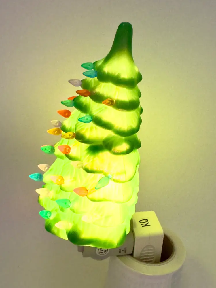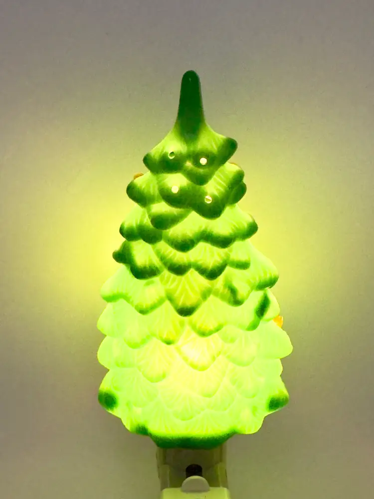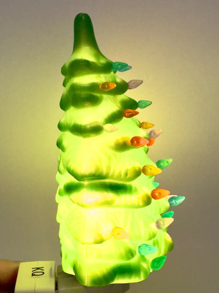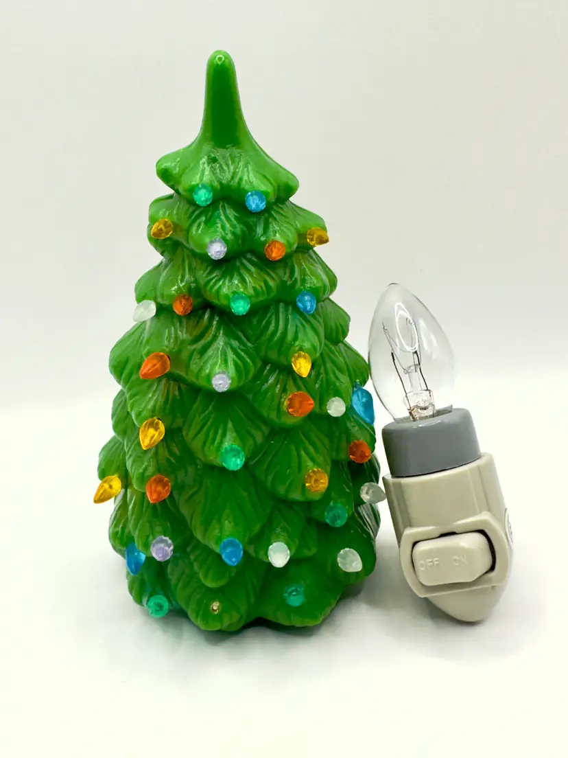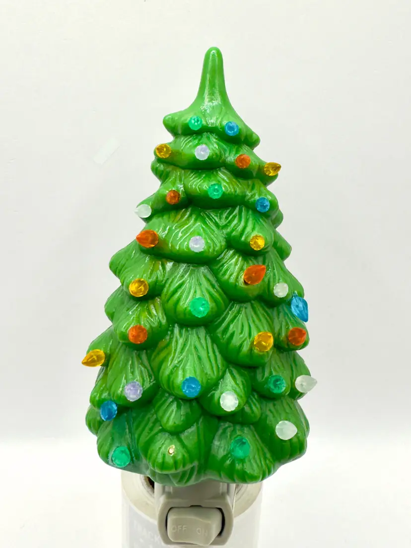 Brighten up your holiday season with this charming vintage plastic Christmas tree night light. Featuring multi-color bulbs, this unbranded piece adds a festive glow to any room. One peg is broken off (see pic). Perfect for adding a touch of nostalgia to your Christmas decor. Brand new bulb. Measures 3x6x2.5. Weighs 10oz.
