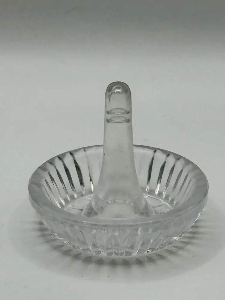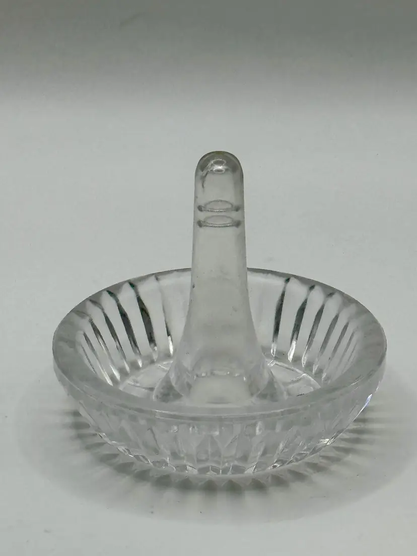 This vintage plastic clear ring holder trinket dish features an elegant cut design, perfect for organizing your rings and small jewelry pieces. Its timeless style makes it a lovely addition to your vanity or dresser. In great condition with no chips or cracks. A charming piece to keep your treasures safe and displayed beautifully. Measures 3x3x2.25. Weighs 8oz.