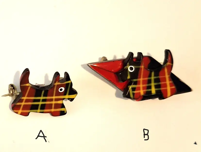 These adorable Scottie dog brooch pins are vintage. They are made of plastic and each has a pin back with a safety clasp. The smaller Scottie measures approximately 1 in long and 3/4 inches wide. This dog is made in a matt plaid finish in red, black and yellow. (Pin A)