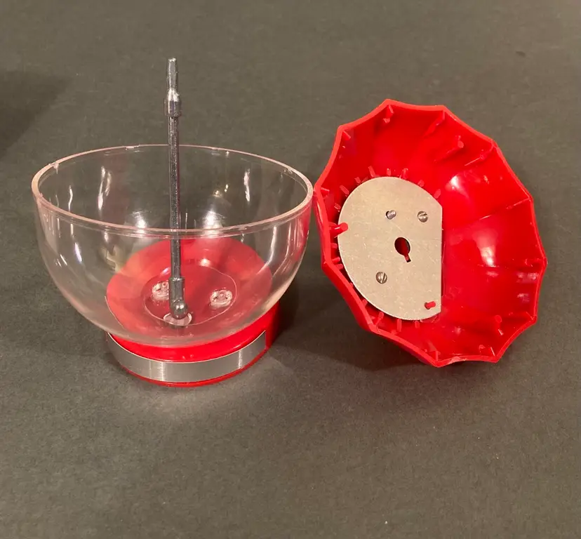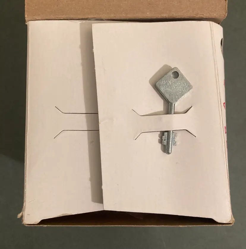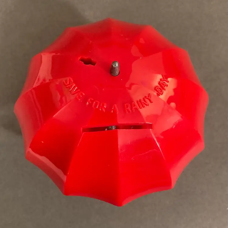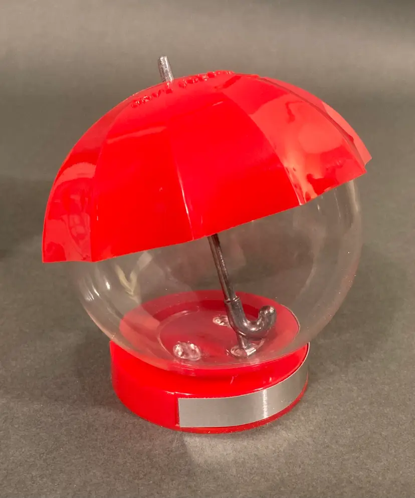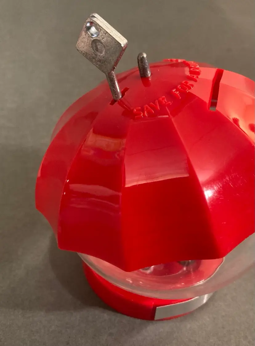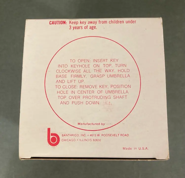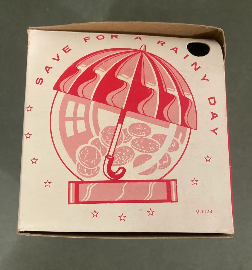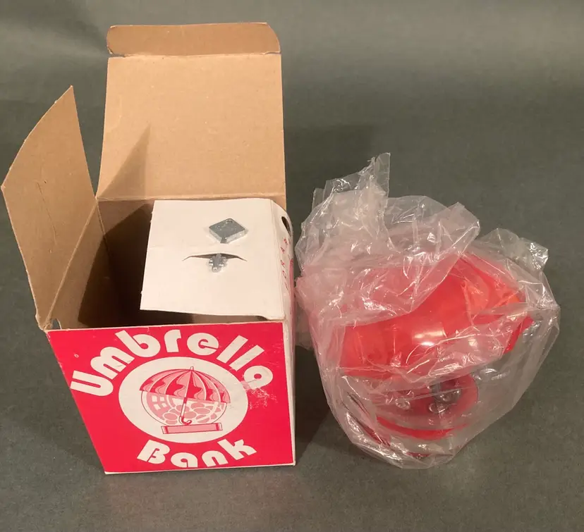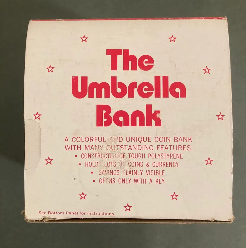 This super cute locking coin bank comes in its original box. The whole thing is plastic and looks more like a gumball machine than a coin bank. There is a spot for a second key, but you only need one to unlock and open the bank. This item is probably from the 70s or 80s. The box is 4.25” square.