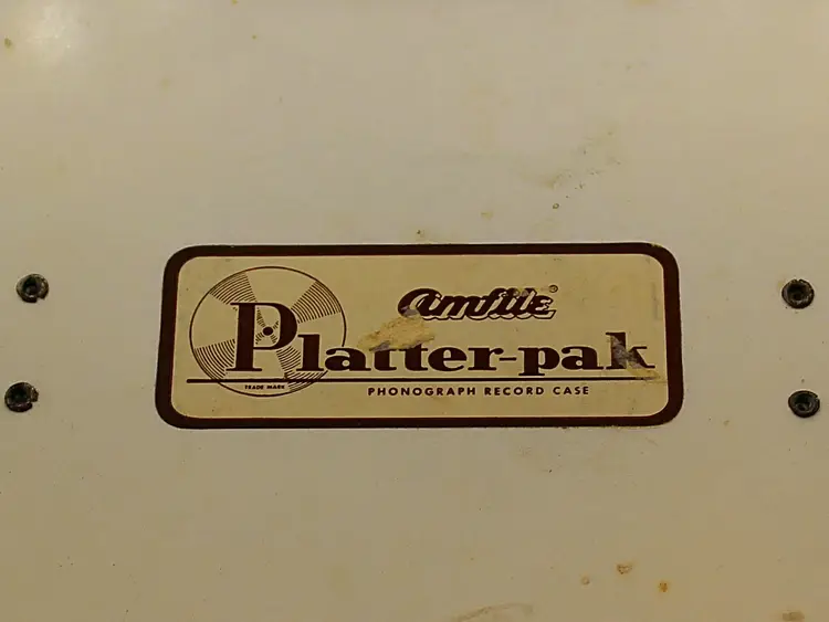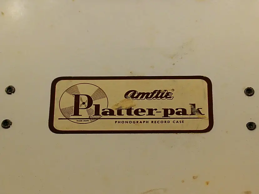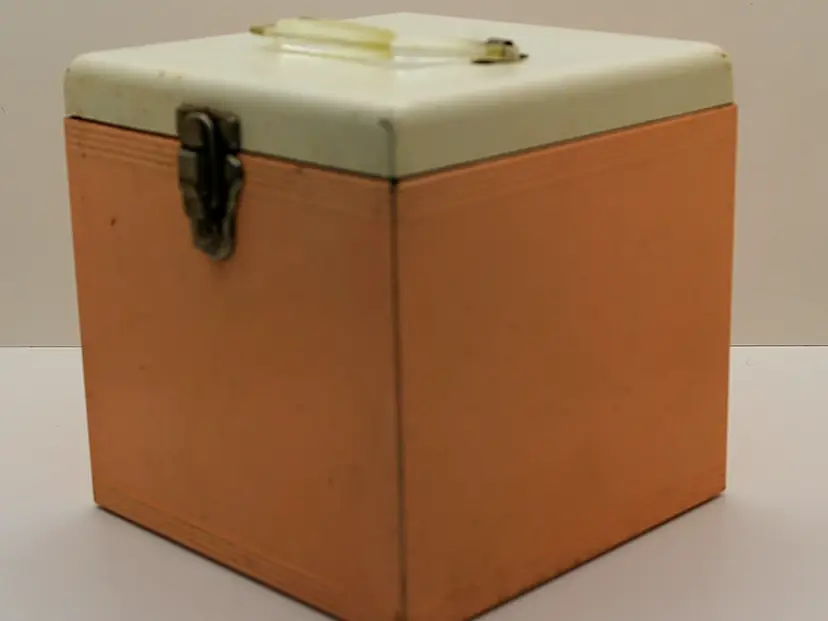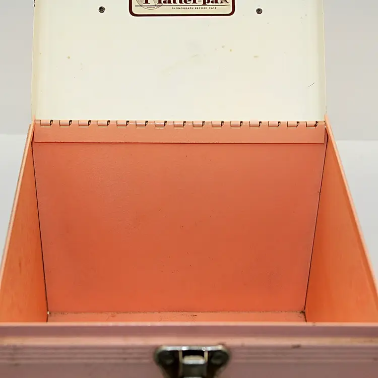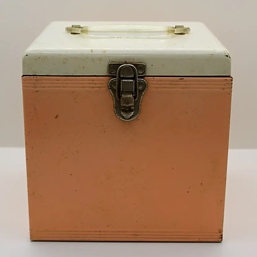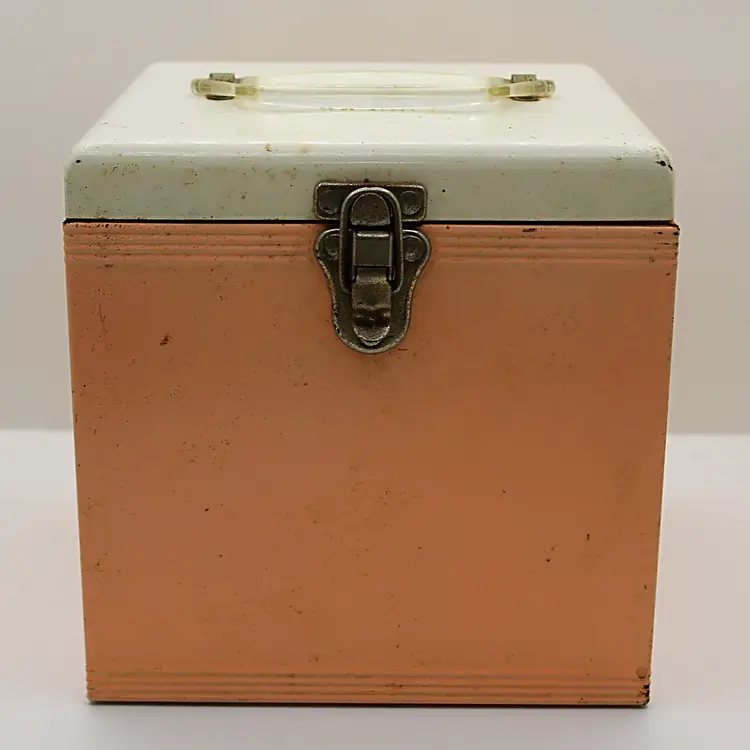 Classic mid-century colors of cream white and a peachy pink make this vintage record case a visual delight. A bit of wear and patina give this piece unique charm and assure that it went to plenty of parties in it's day. It is missing the dividers, so feel free to stash whatever you like inside. Measurements are 8 x 8 x 8 inches. Metal construction with a period correct translucent handle