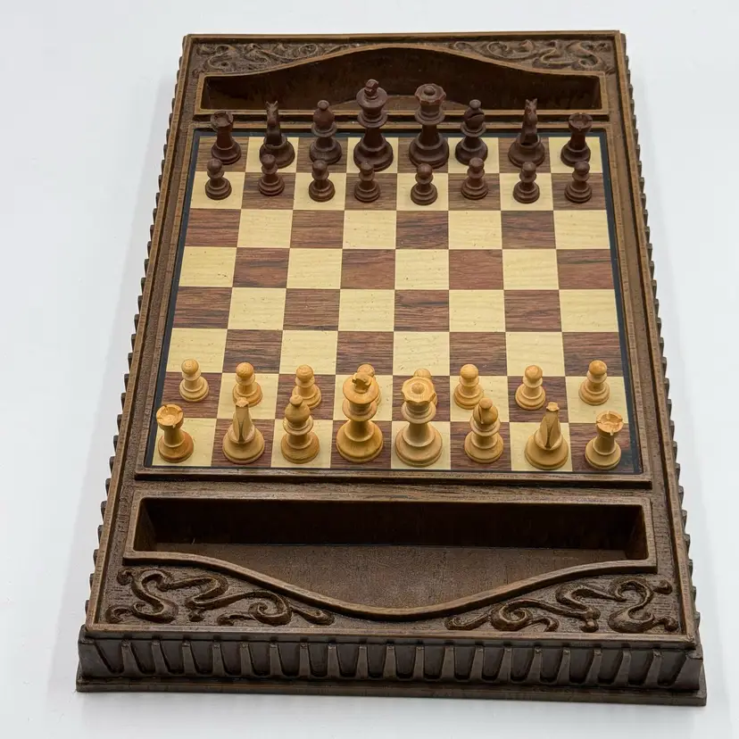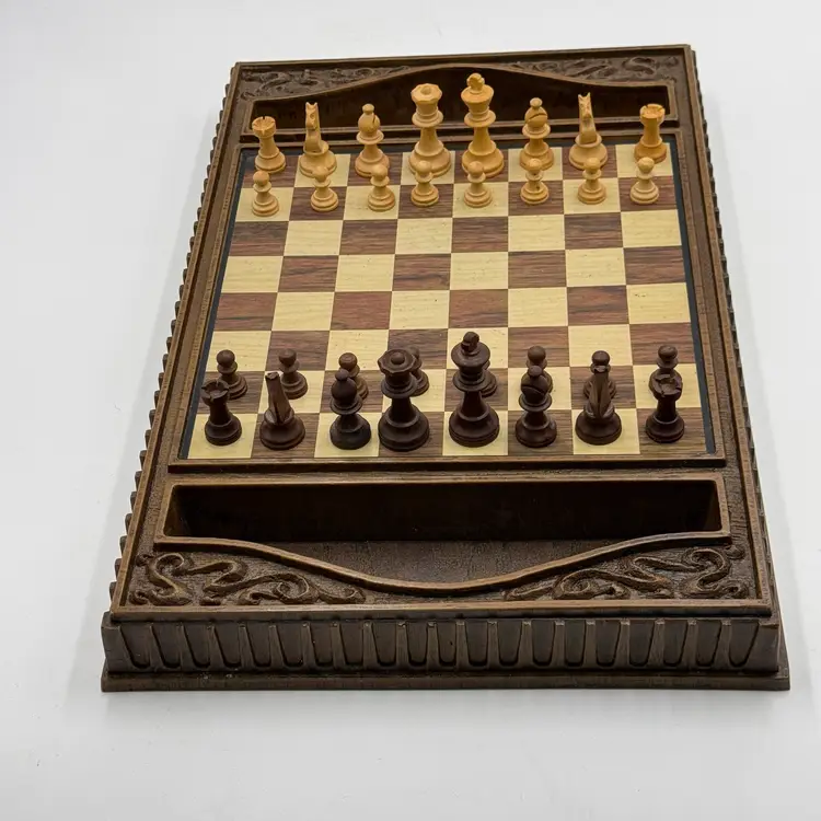 In good condition. Has all the wooden chess pieces, pamphlets and original box. The box has staining. The chess pieces and board do not have any damage. There is a dark stain on one of the corner board squares. The board measures 16 1/4 inches long, 10 3/4 inches wide and 1 3/4 inches tall.