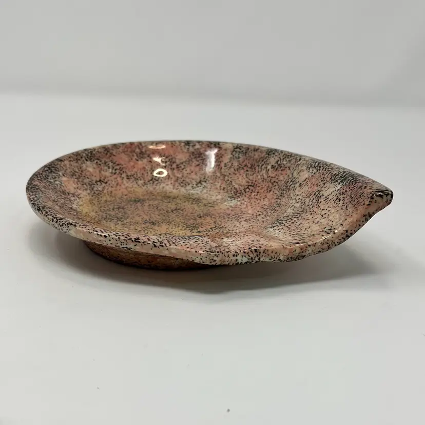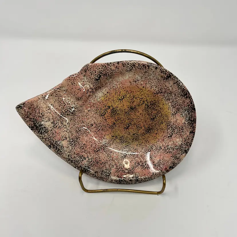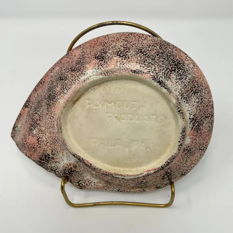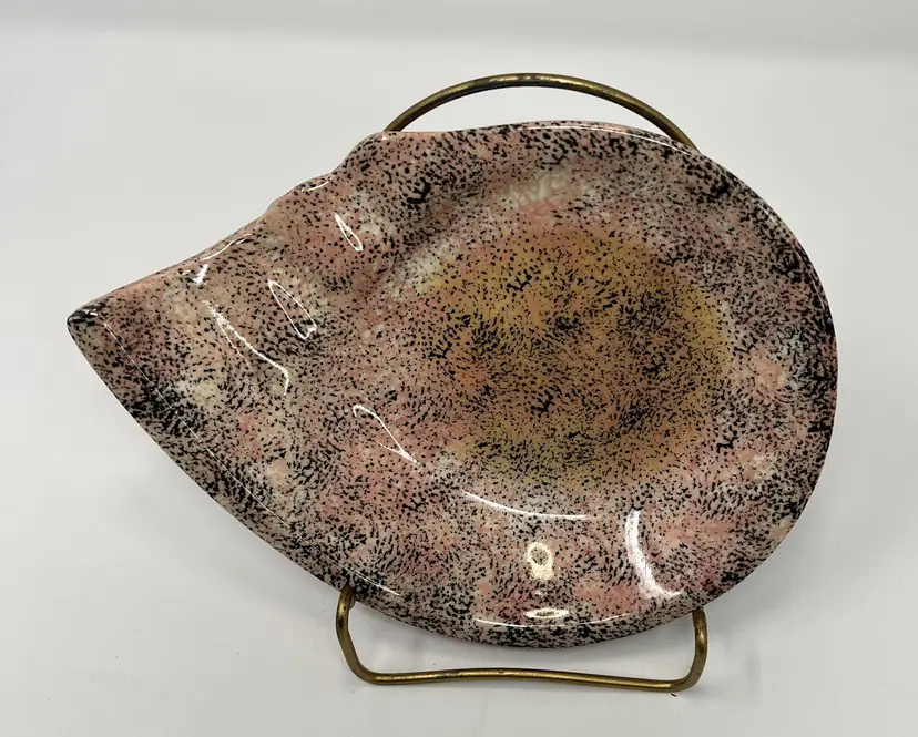 DETAILS: • Manufacturer: Plymouth Products • Design/Pattern: Abstract leaf/teardrop form with peach & cream speckled glaze • Markings: Impressed “PLYMOUTH PRODUCTS PHILA. PA.”Origin: • Date/Era: circa 1950s–1960s • Design Style: Mid-Century Modern (atomic-era speckleware) • Materials: Ceramic with speckled glaze • Color(s): Peach, cream, black speckling, with yellow-toned center • Dimensions: Length: 7.5", Width: 5.5", Height: 2", Weight: 13 oz • Condition: Excellent vintage condition — no chips, cracks, or glaze loss observed