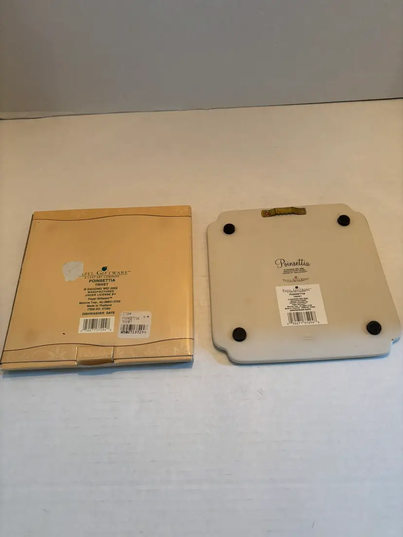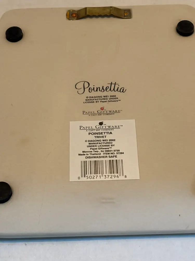 The Vintage Poinsettia Trivet by Papel Giftware is a charming ceramic piece perfect for adding a touch of retro style to your kitchen or home decor. The square trivet features a beautiful Poinsettia flower pattern in red, making it a standout piece. It comes in its original box with a wall hanger, making it a unique and collectible item from the 2000s. Made in Thailand, this medium-sized trivet is a versatile and decorative piece that would make a great gift for any vintage or flower lover.