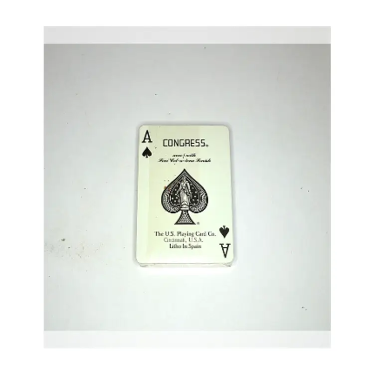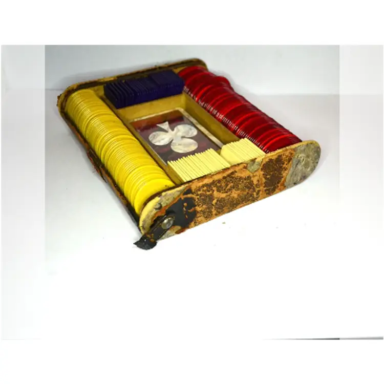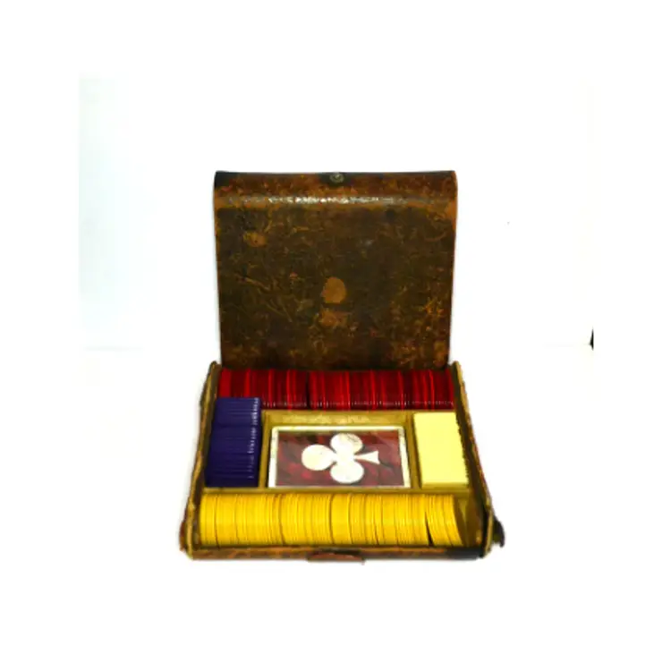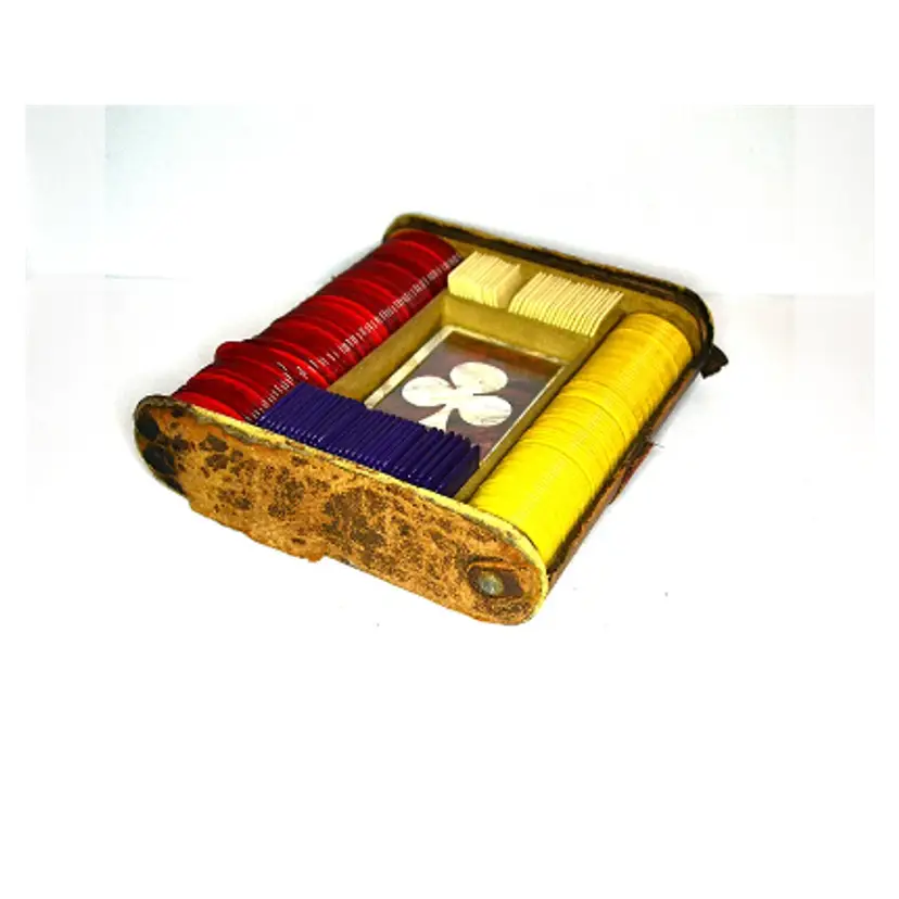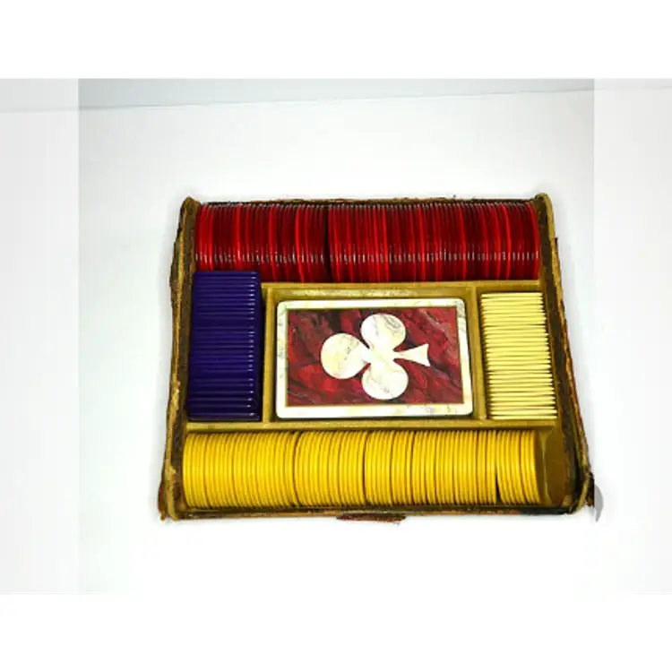 This vintage poker set has 4 different types of chips, a sealed deck of Congress playing cards, and storage case.