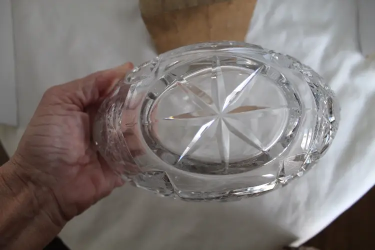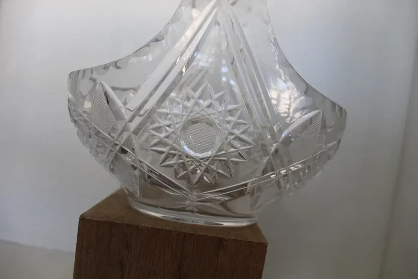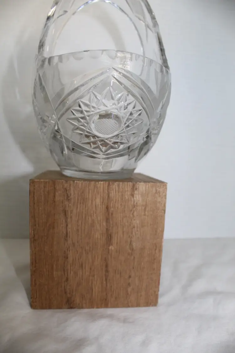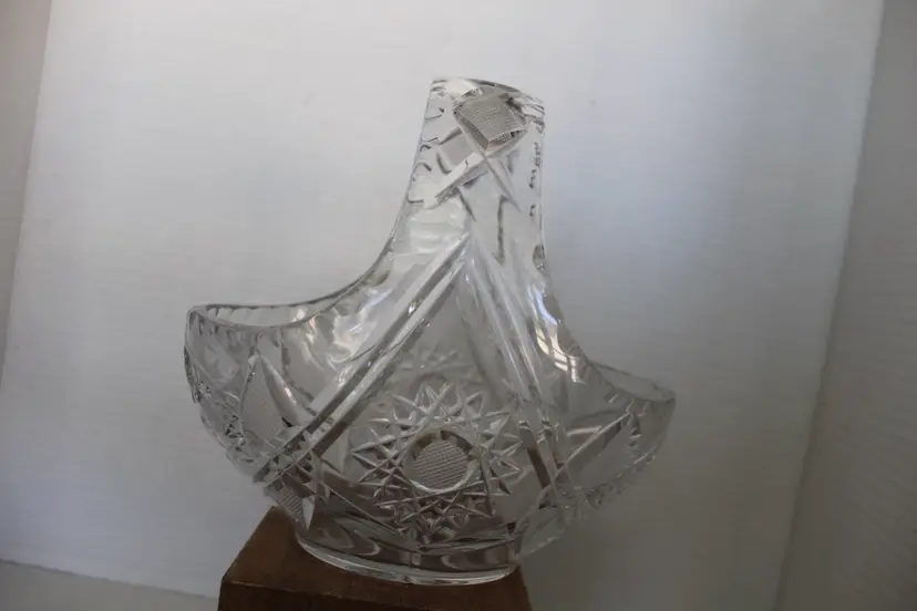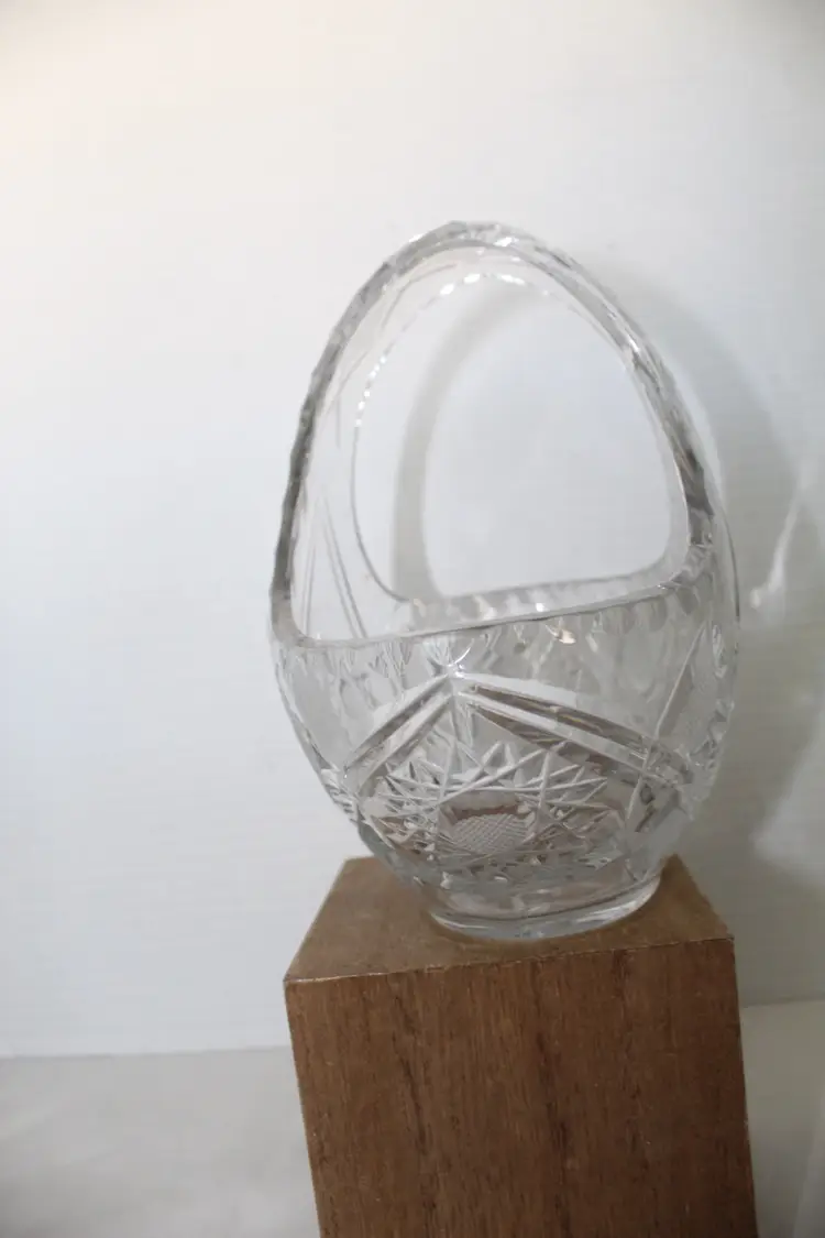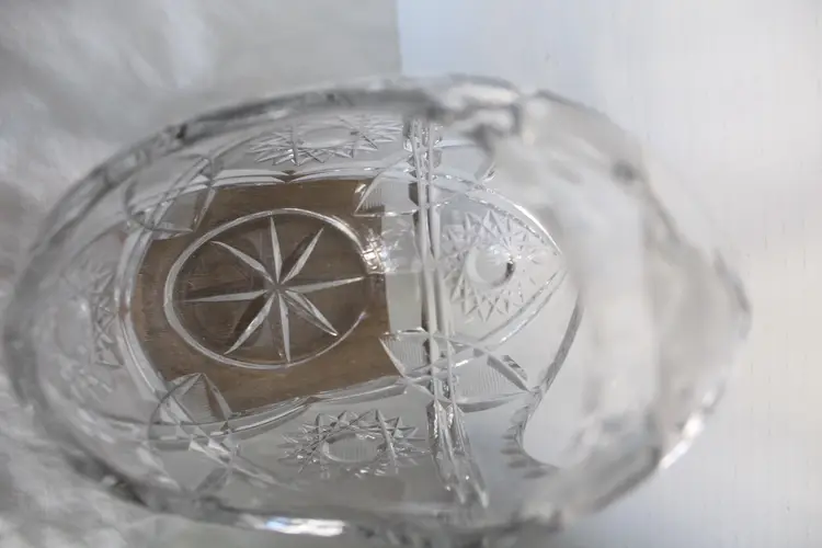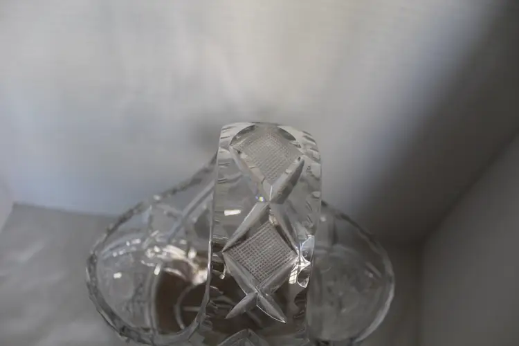 This Vintage Crystal Basket Cut Glass Candy Bowl Trinket Dish is a stunning piece that exudes elegance and charm. With a beautiful starburst pattern and a clear, glossy finish, this oval-shaped bowl adds a touch of mid-century modern style to any decor. Made in Poland in 1975, this original decorative basket features intricate pinwheel designs and is perfect for displaying candies, trinkets, flowers or potpourri in a stylish and sophisticated way. Care instructions recommend hand washing, but this unmarked piece is sure to last for years to come with proper maintenance.