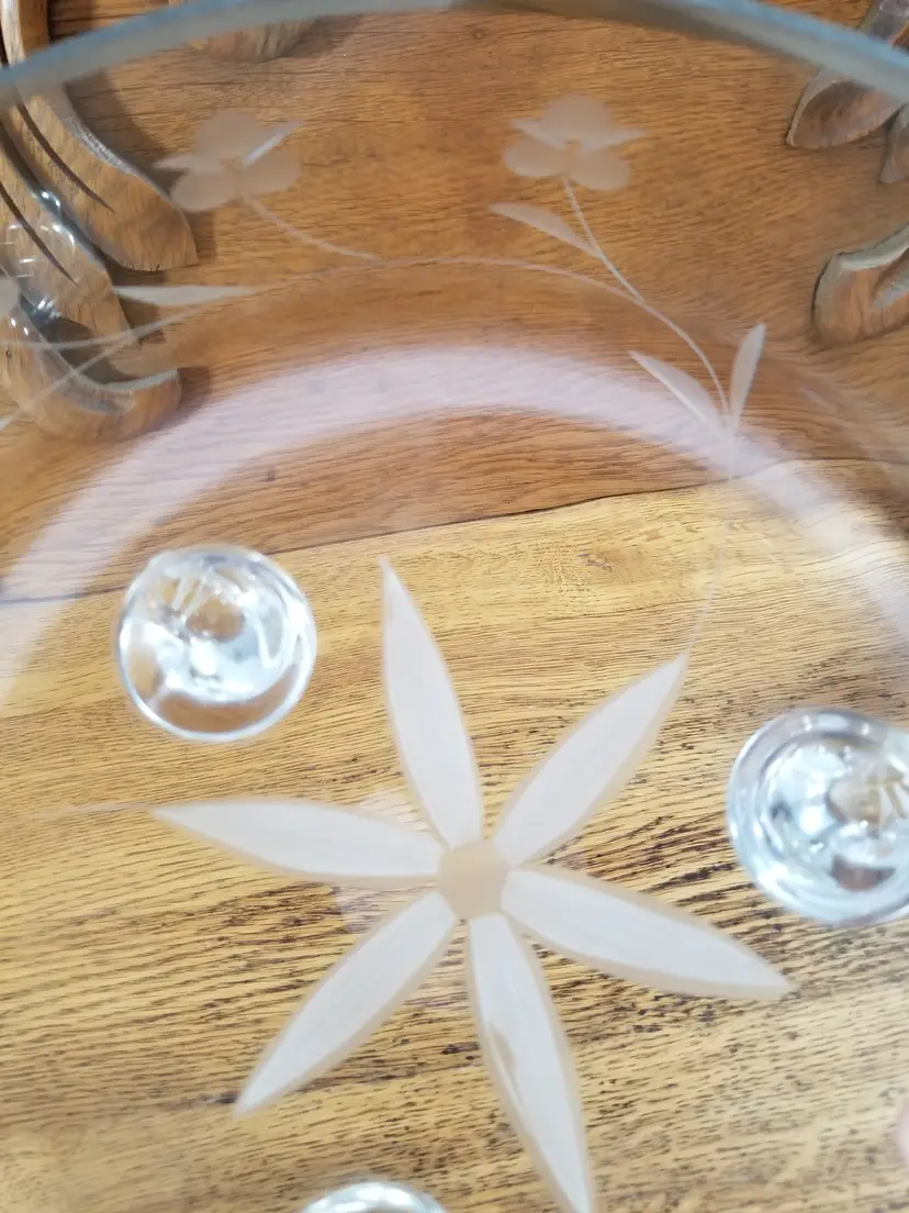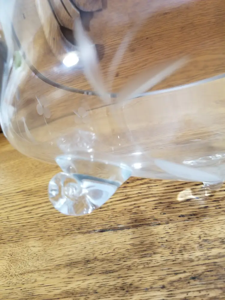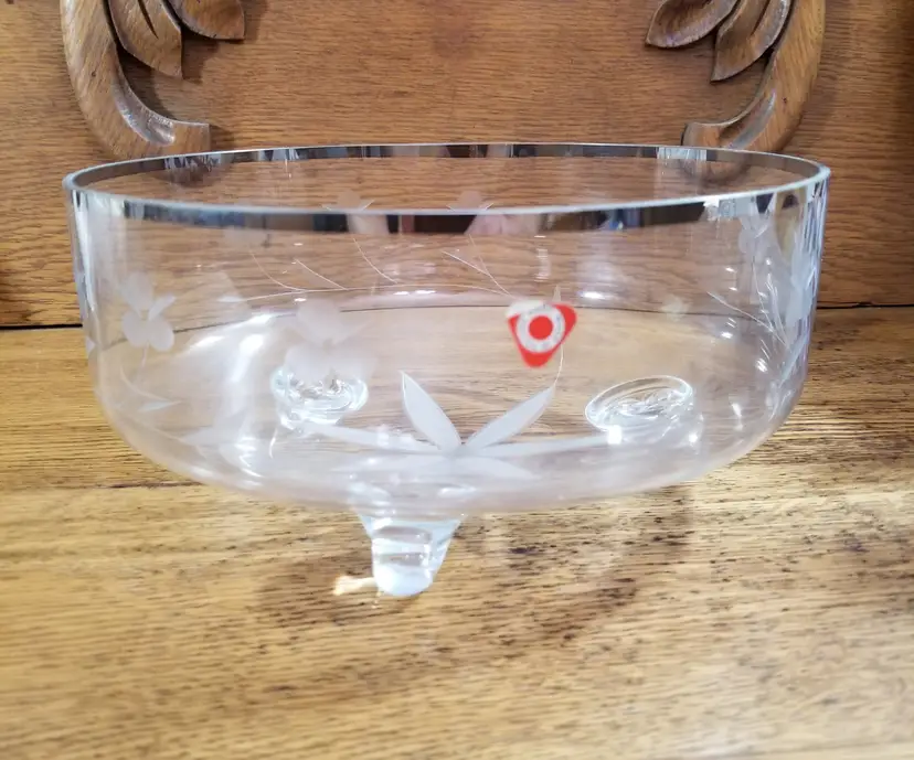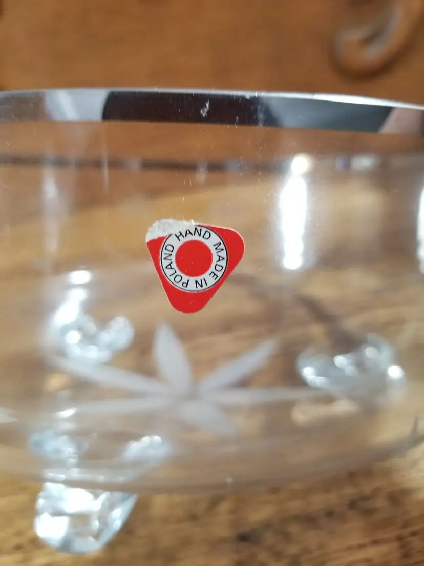 Details: • Hand Made in Poland (original sticker present) • Lead crystal construction • Platinum silver rim • Cut floral design • Measures approximately 8½” wide x 4” tall