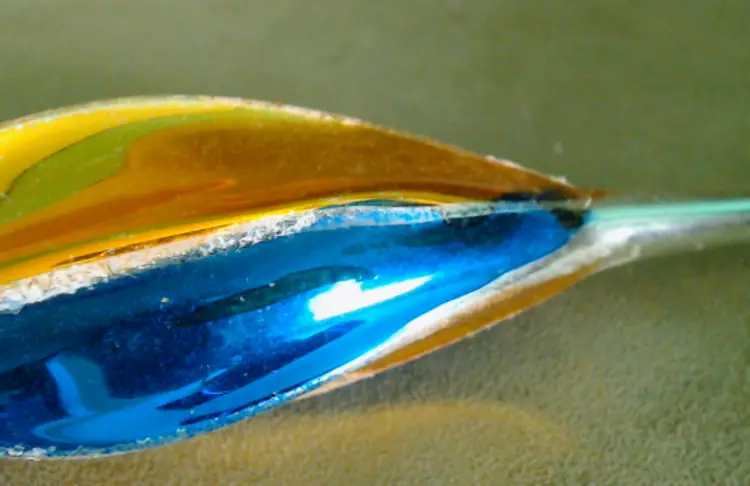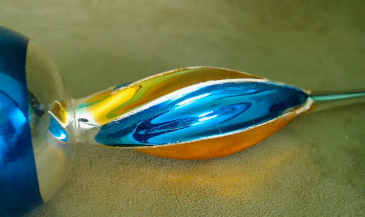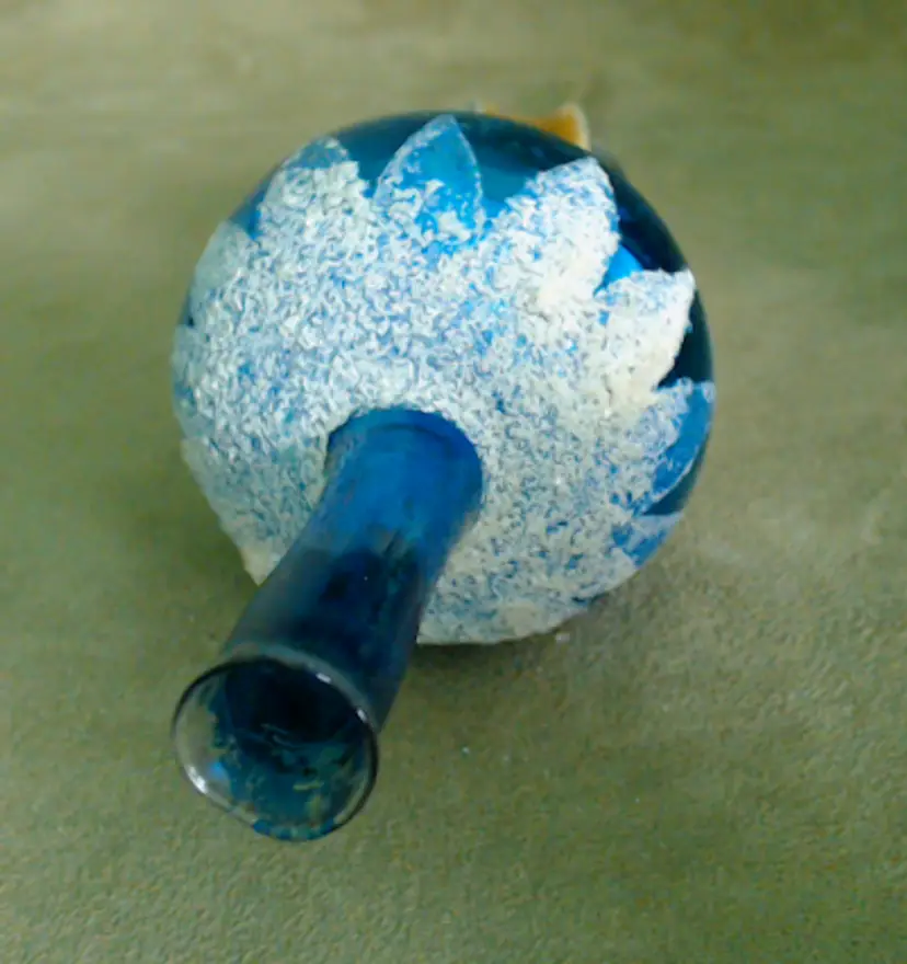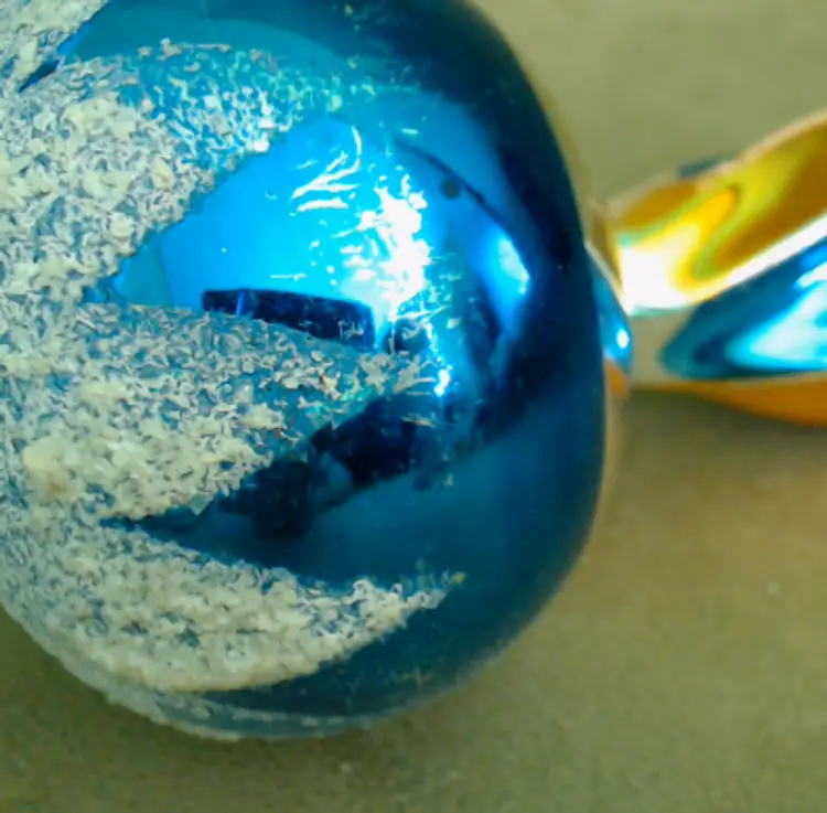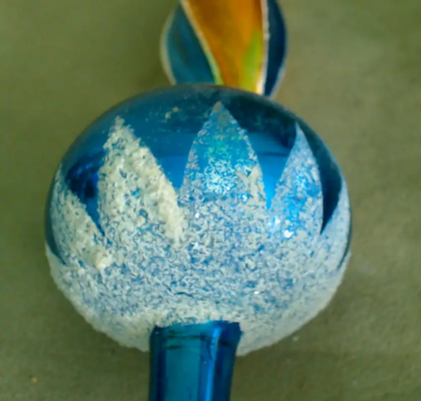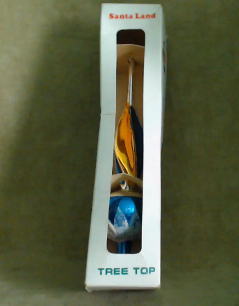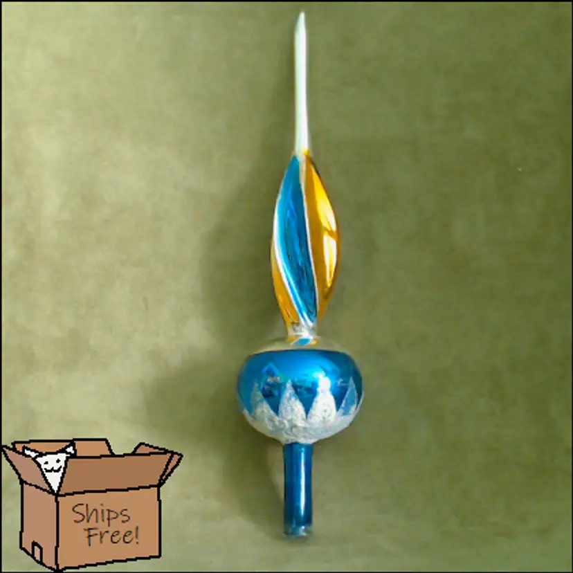 This is a vintage Christmas tree topper, made from a beautiful painted glass! Made in Poland during the 1970s for the Santa Land brand, this thin glass spire is an exceptionally pretty blue and gold. It's been topped with a bit of "snow" as well, which I think makes it perfect for a Winter decoration as well as for the holiday! Condition: This tree topper is in Good shape! There are no chips or cracks, but there is a little bit of wear to the paint. I do think it was used for at least one Christmas, as there's wear to the interior paint near the base, where it would have slid over the tree. One section of the spire has a factory paint drip, where the gold and blue have combined into a dark green. Additionally, there's scratching to the paint around the sphere as well as some snow loss in the same area. The sphere has just been rubbing around inside the box for years, and you can see a bit of the blue paint on the cardboard right where it rests. It does present nicely still, of course! The box itself no longer has the cellophane window, but is also in overall good shape. Size: The topper measures 11" tall, and the base is about ½" across, just wide enough to slip on to a good balsam tip!