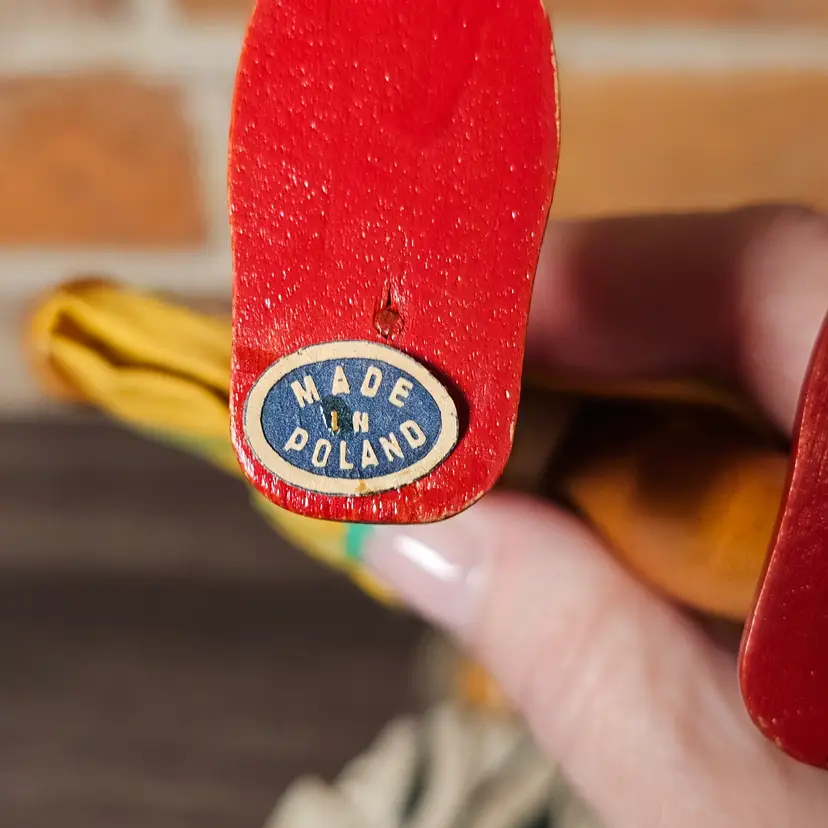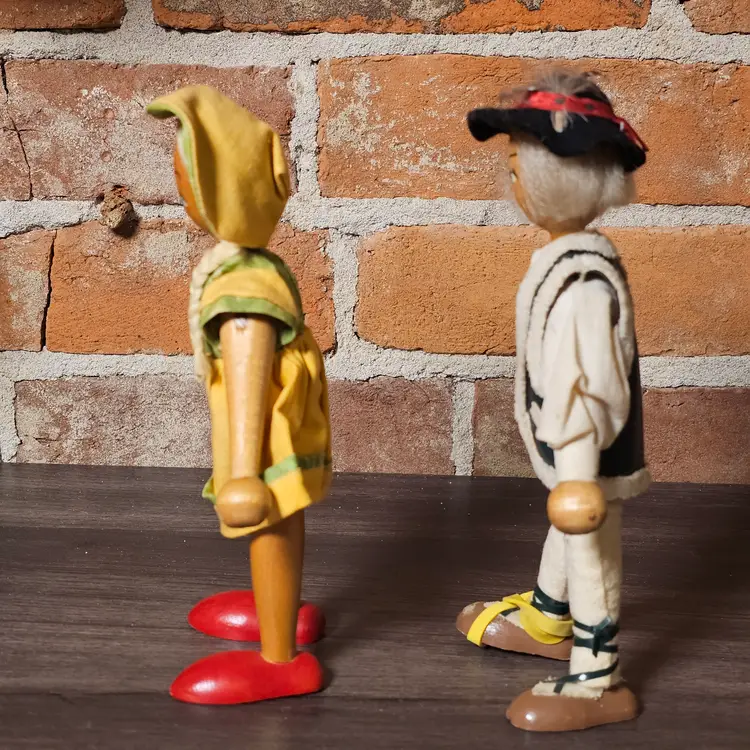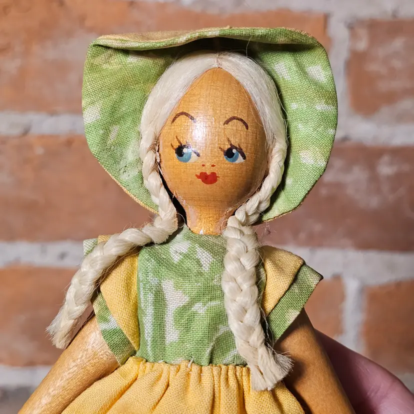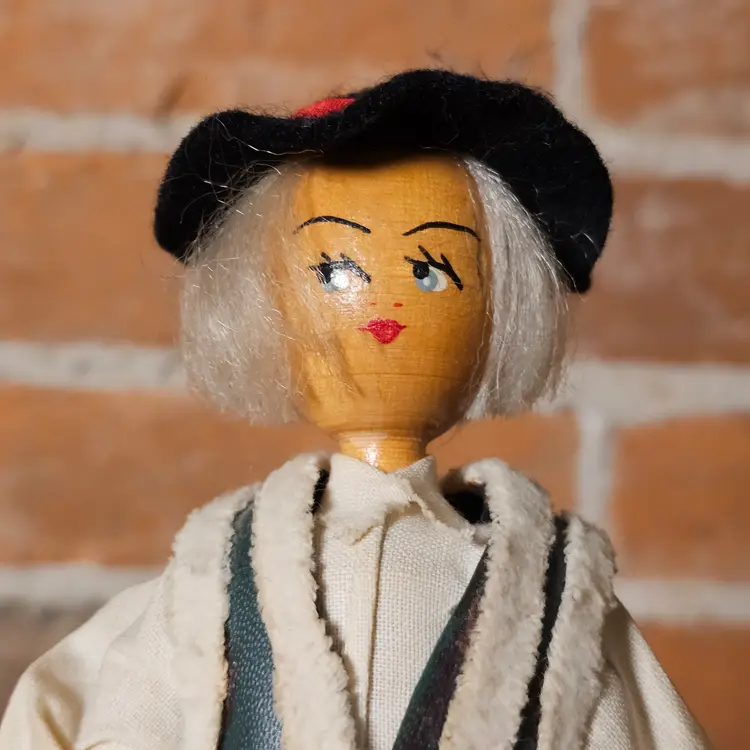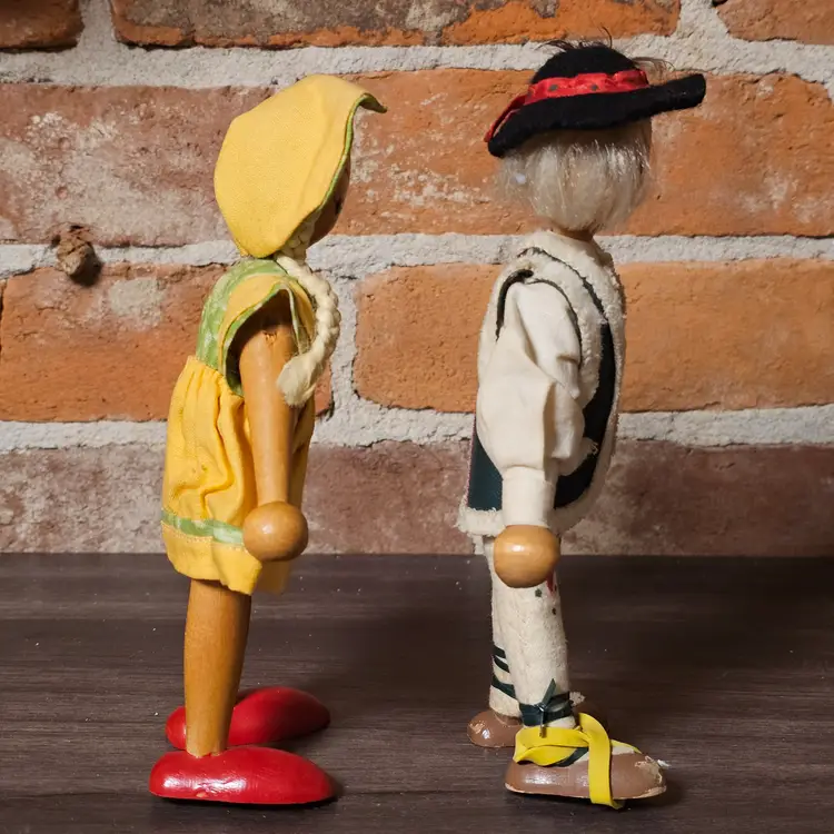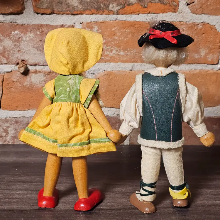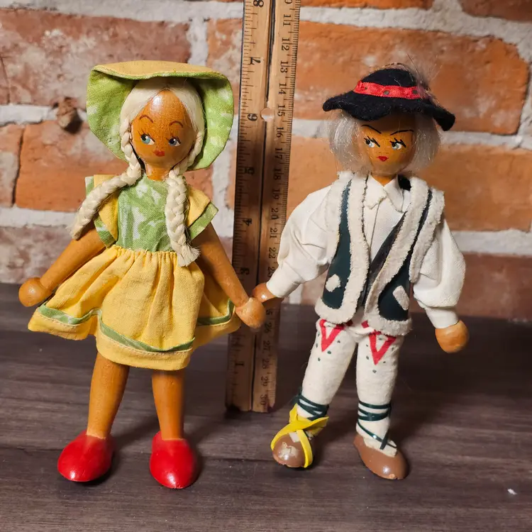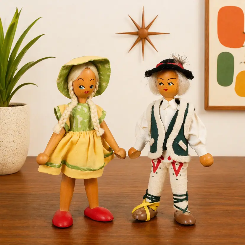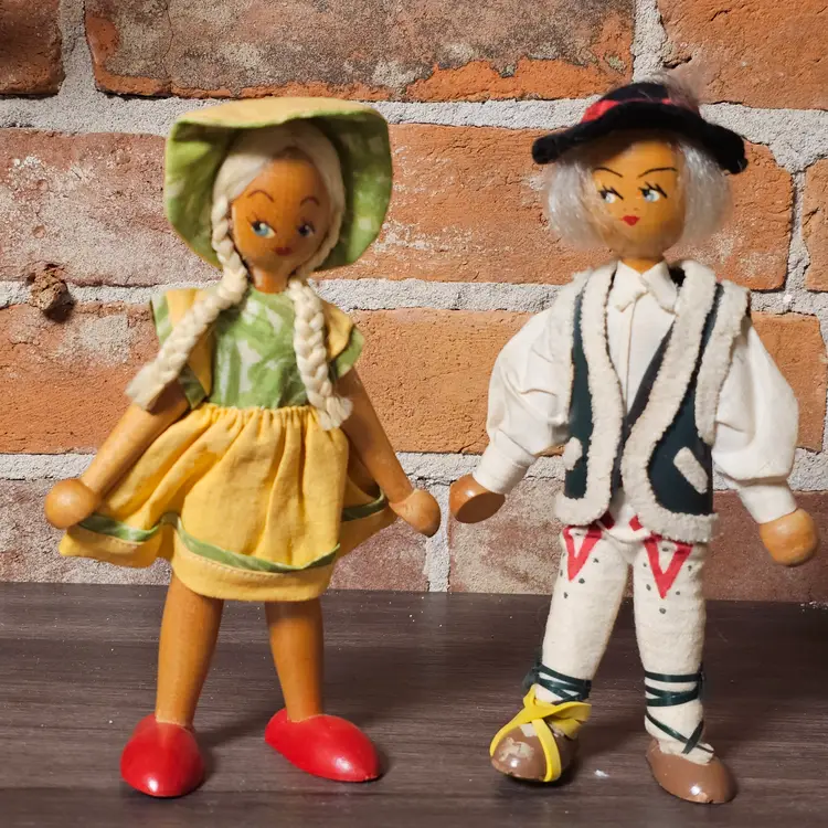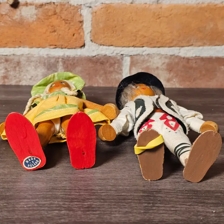 This charming pair of vintage wooden folk dolls features traditional Polish craftsmanship and vibrant hand-painted details. Standing approximately 8 inches tall, these dolls are dressed in authentic regional-style costumes, including a felt vest with faux-fur trim for the boy and a bright yellow jumper with a matching bonnet for the girl.