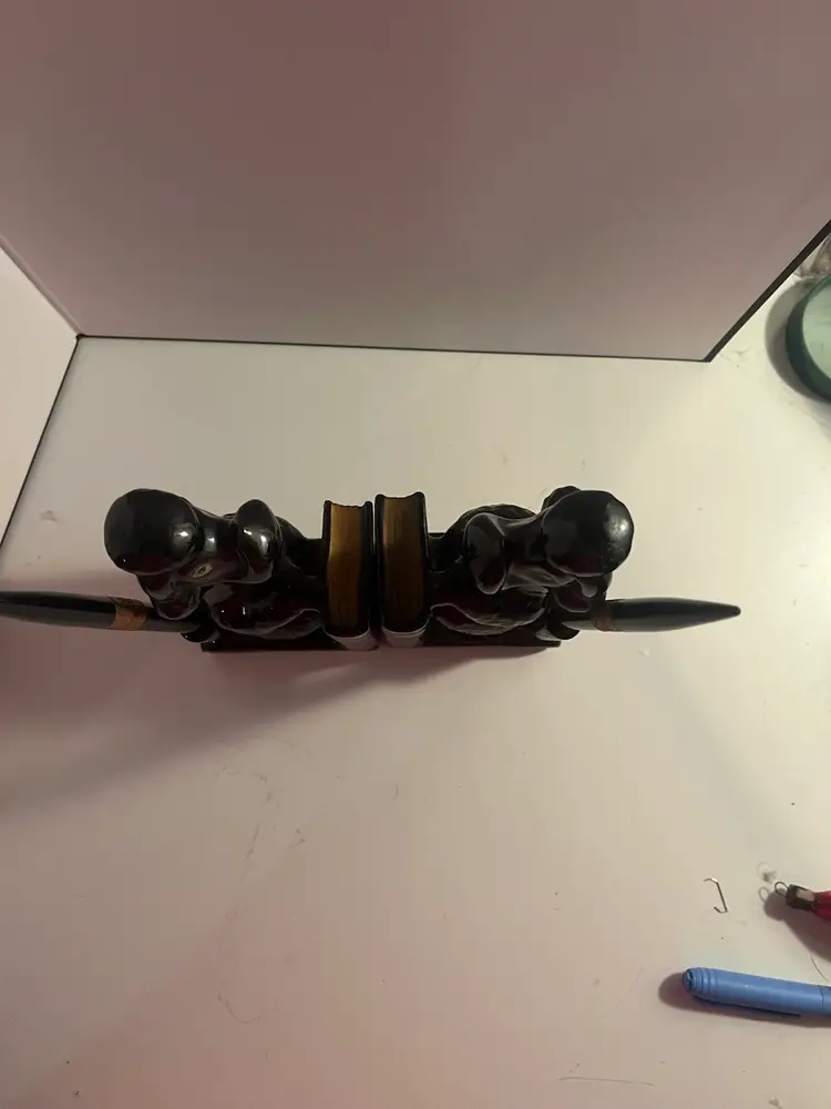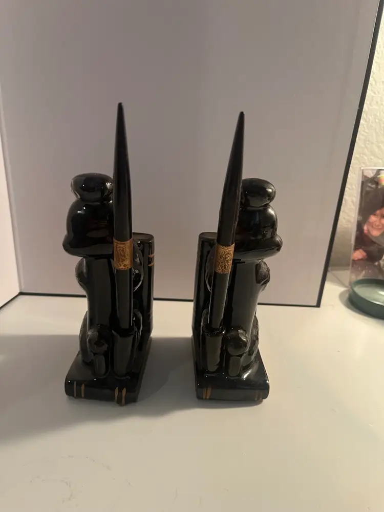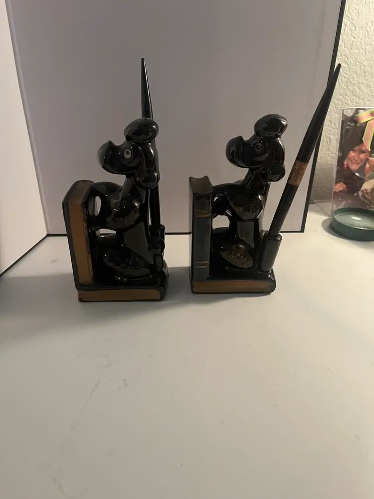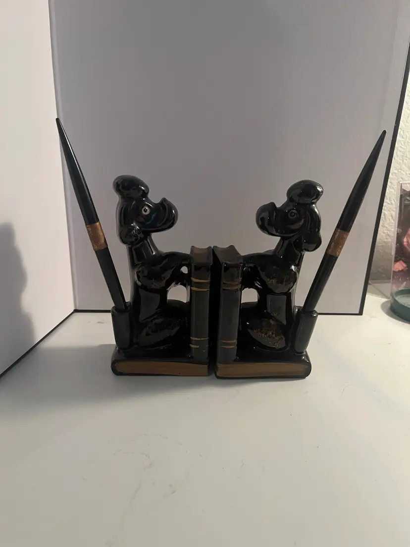 Vintage black poodle bookends with original pens. Each measures 6”x3” with no chips or cracks.