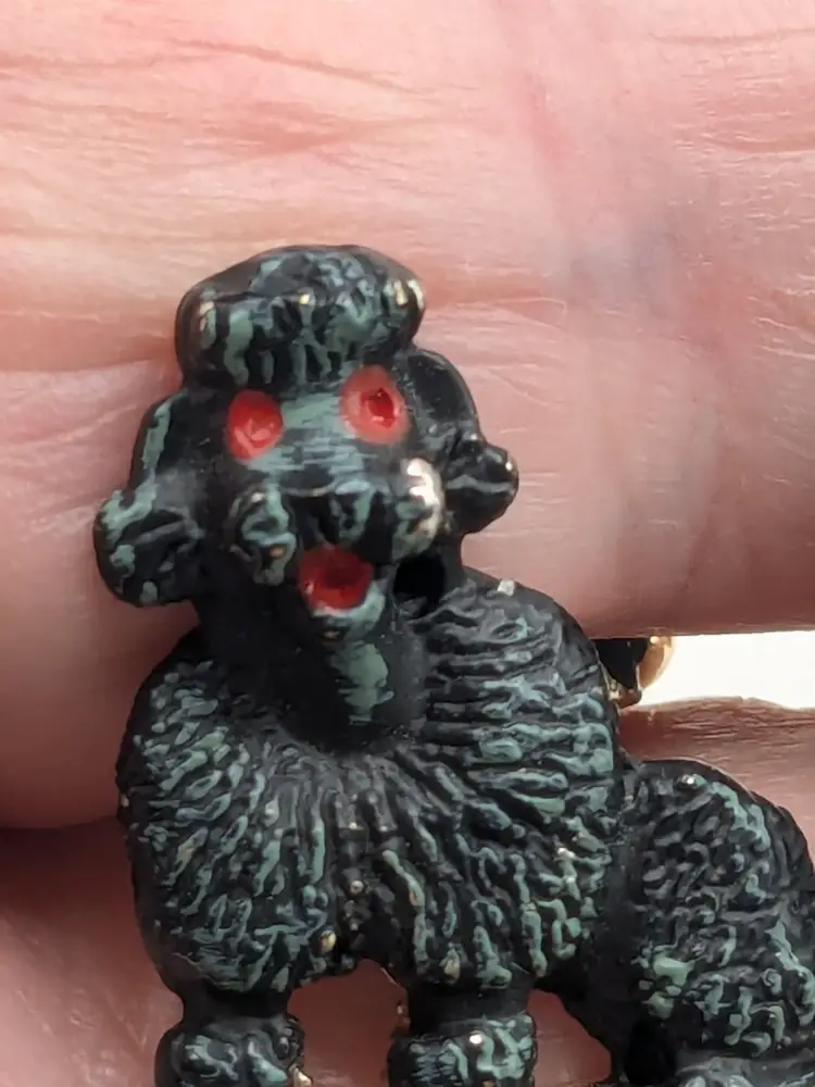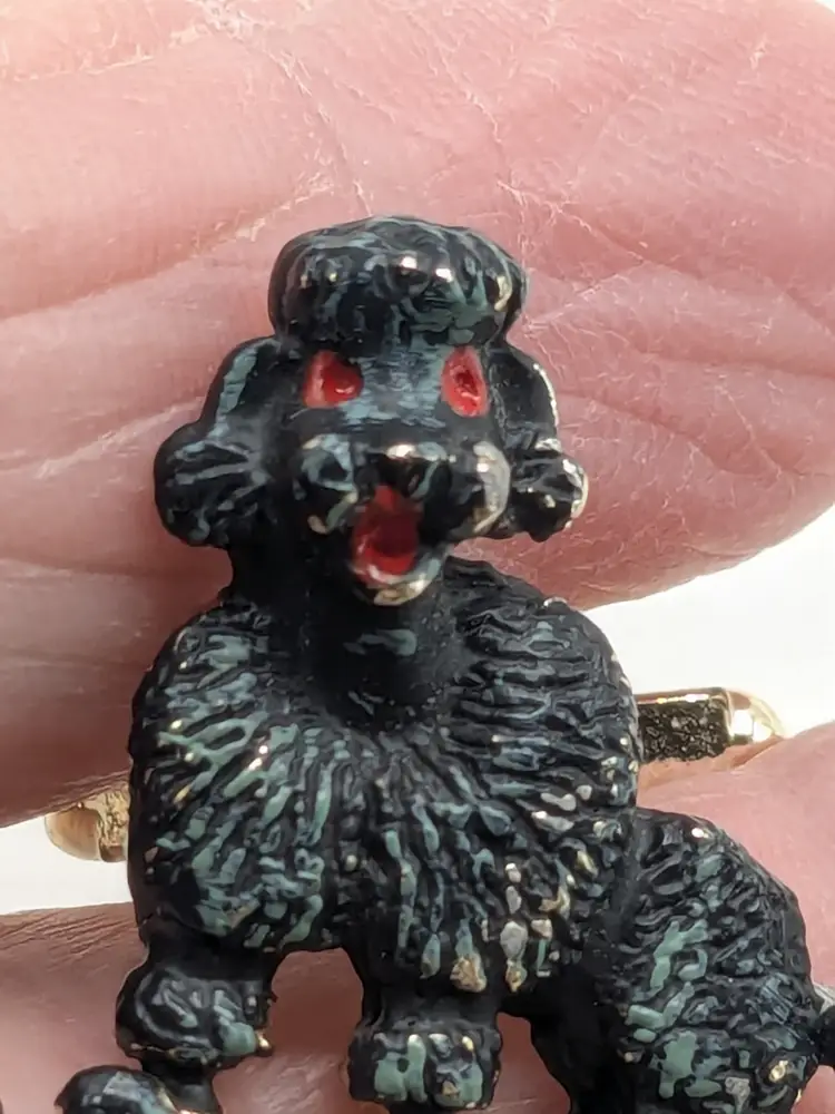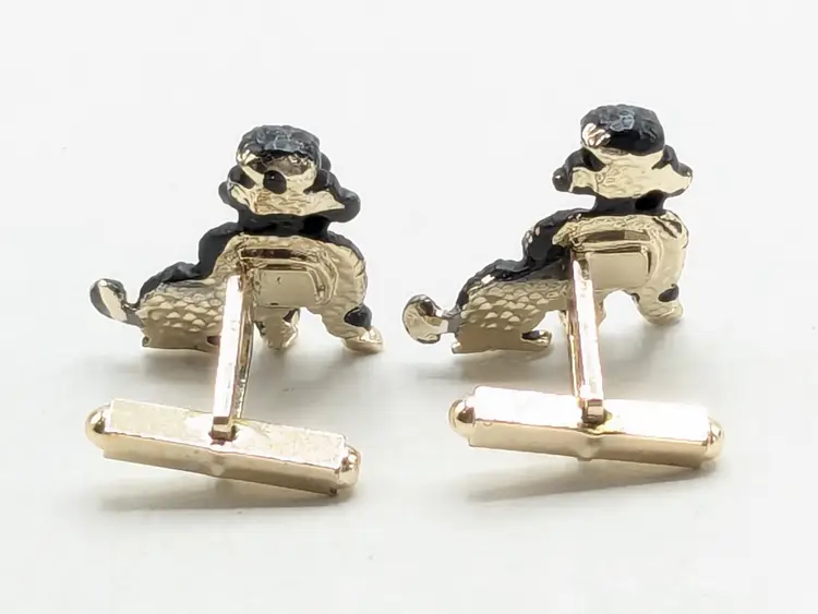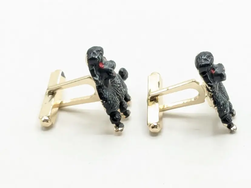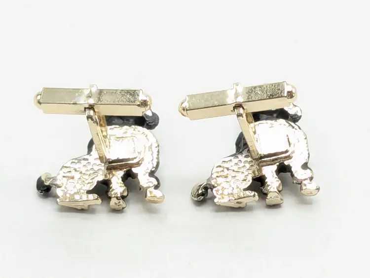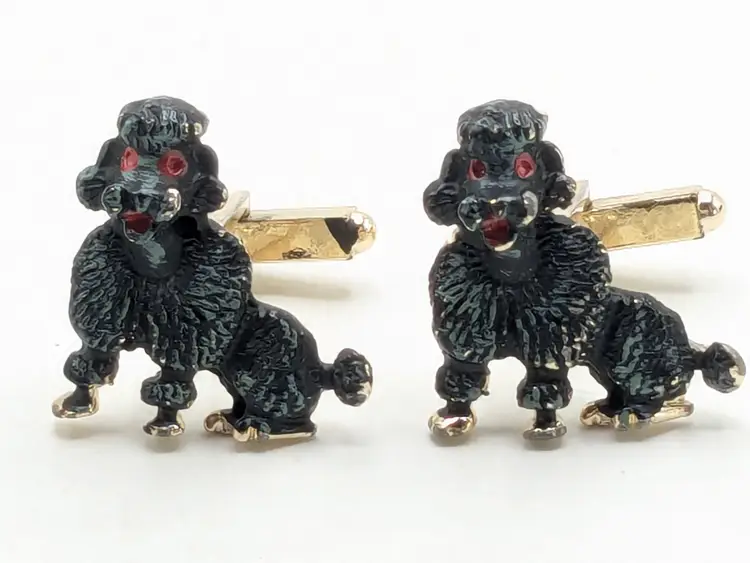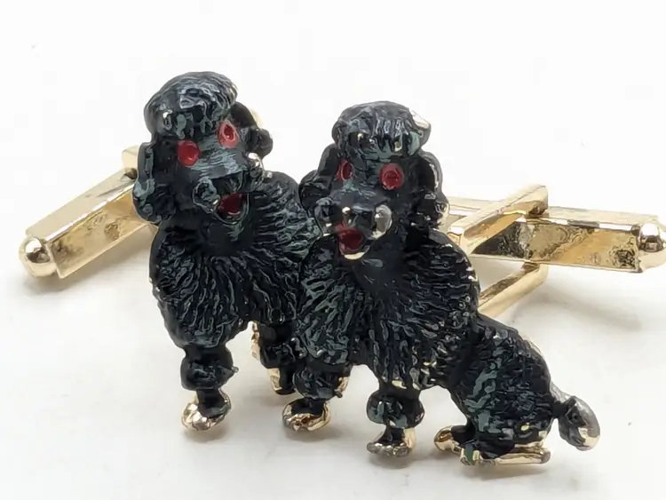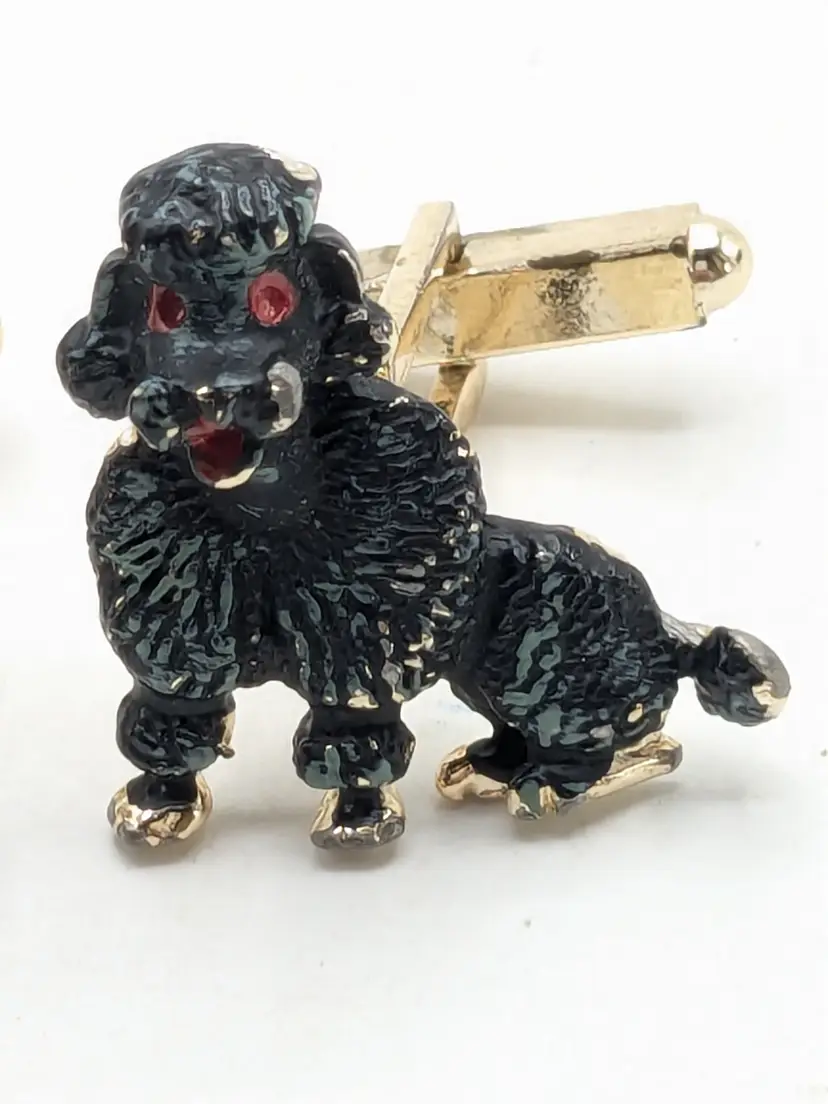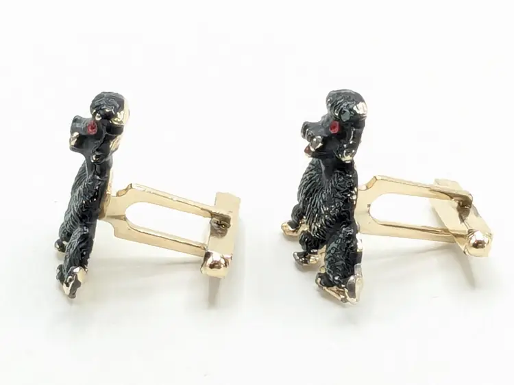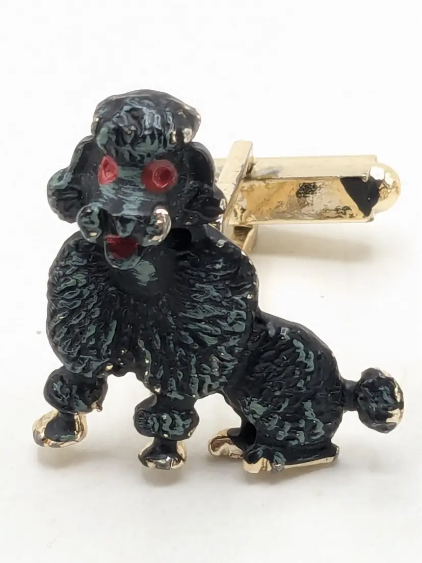 For the man who has everything...vintage poodle cufflinks! Good condition. Features black enamel with red enameled eyes and tongue. Gold tone backs. Poodles measure 3/4" in length and 3/4" wide. wen
