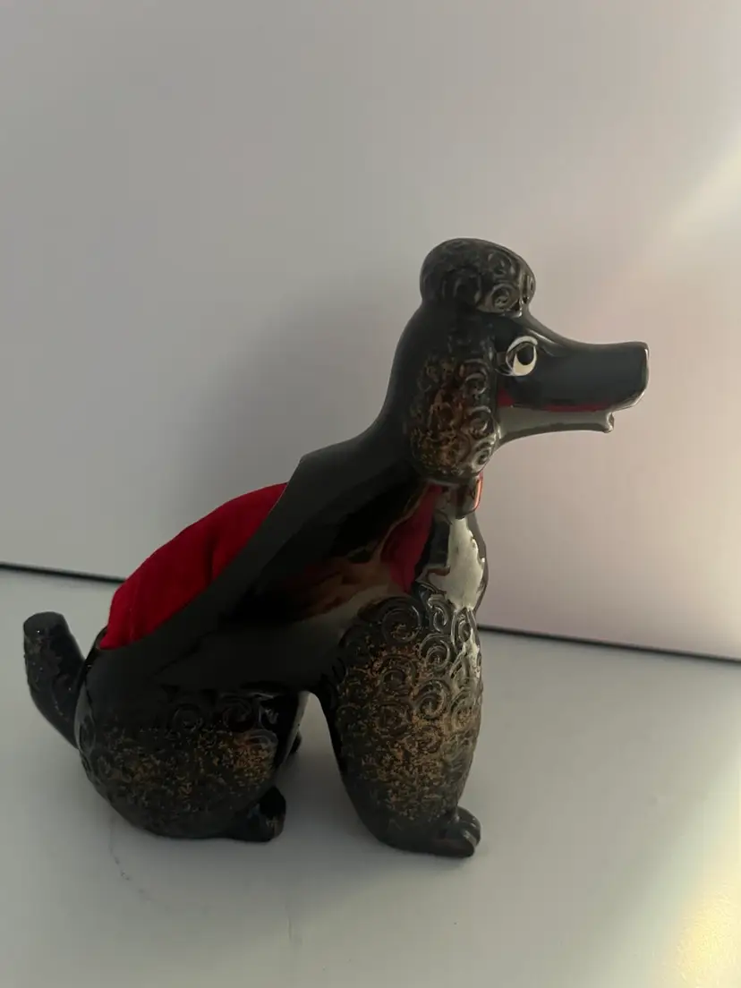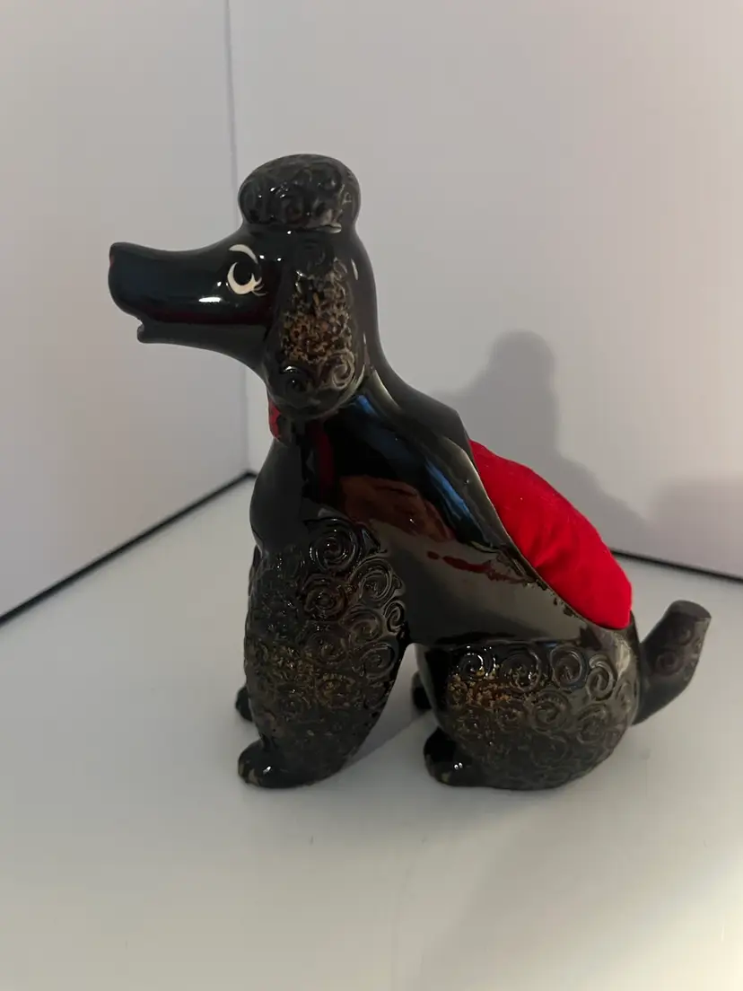 Vintage black French poodle pin cushion. Made in Japan-1950’s. Measures 51/2”x 41/2”. No chips or cracks