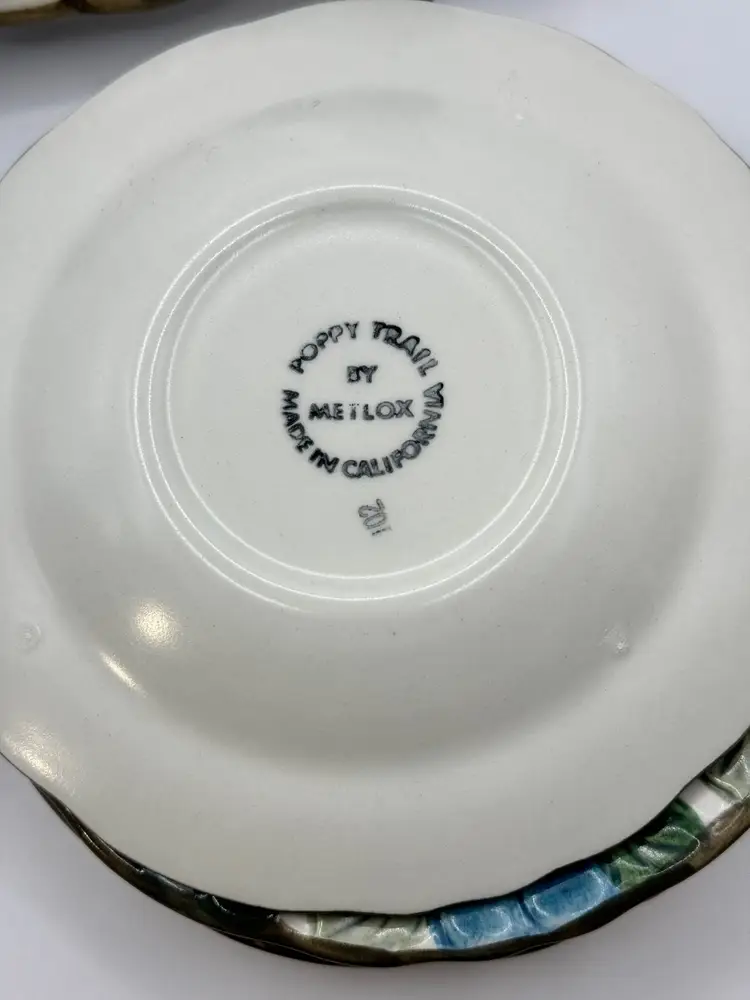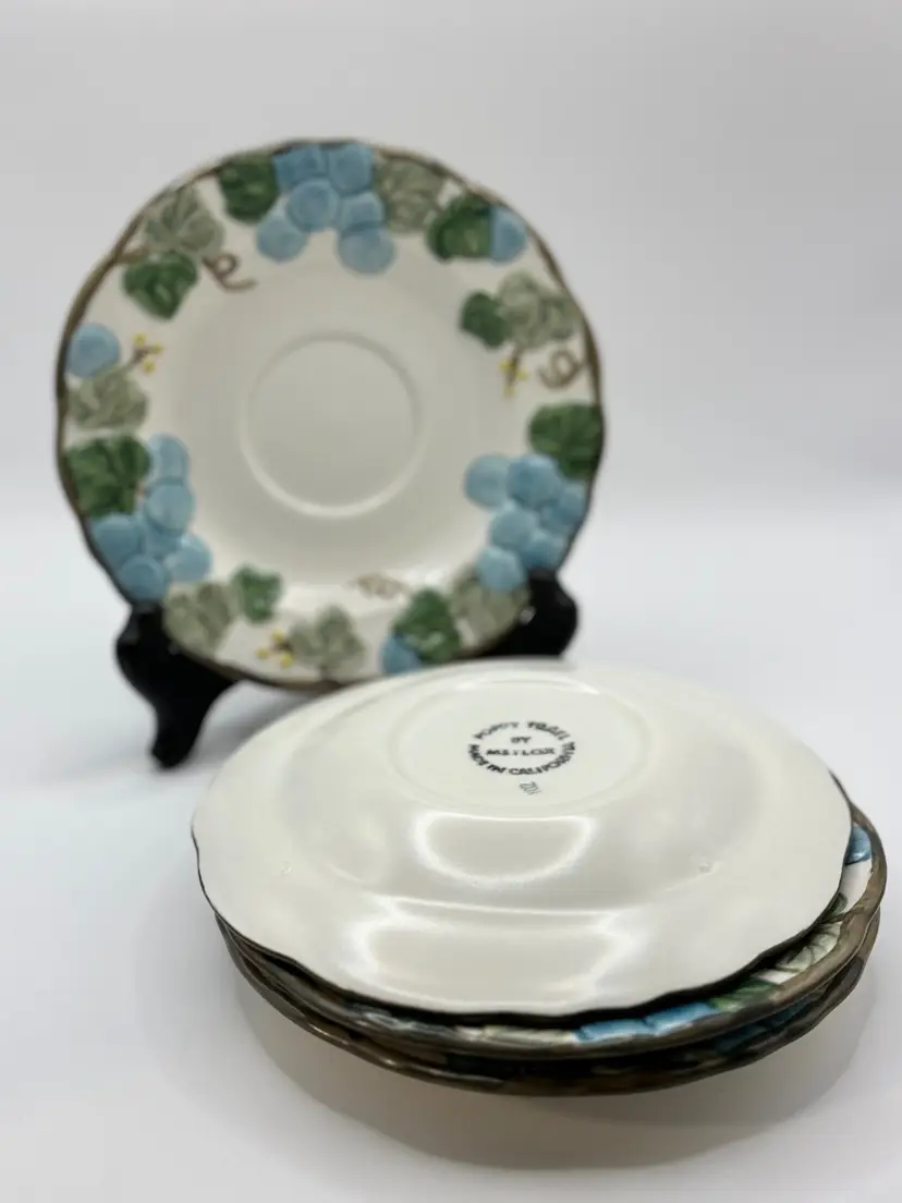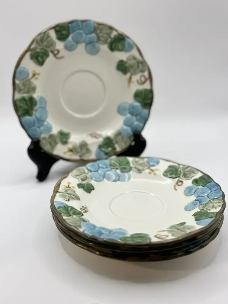 Sip in style with this charming vintage (4) piece saucer set, featuring a lovely grapevine motif in soothing earth tones with blue and green accents. Perfect for your morning tea or as a delightful display piece. No visible chips or cracks. A delightful addition to any vintage kitchen collection. Measures (4) saucers 6”. Weighs 2lb.