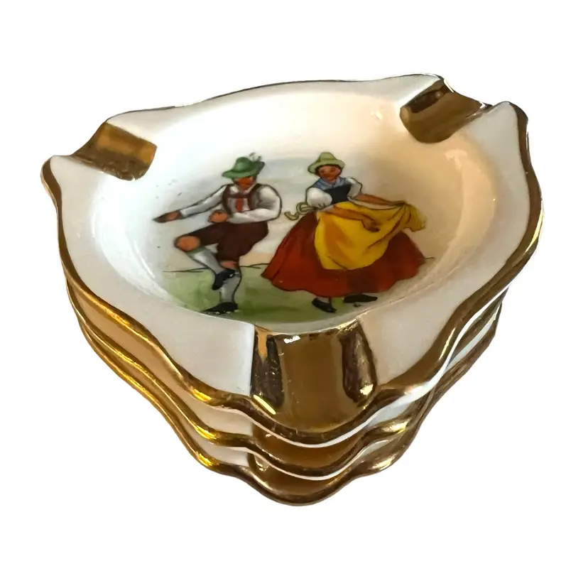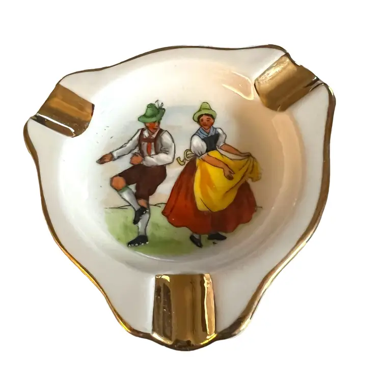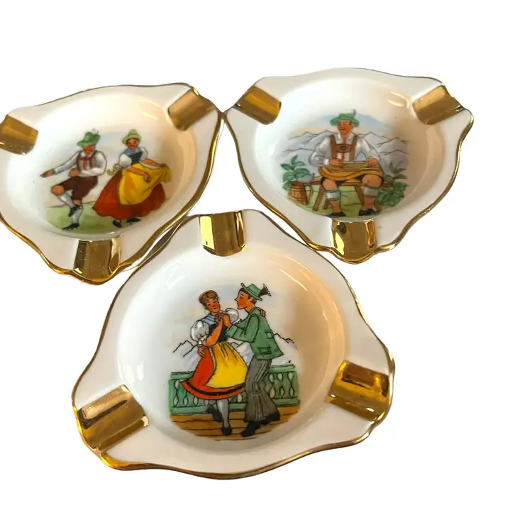 Vintage Porcelain 3 Ashtrays PLANKENHAMMER Floss Bavaria Triangular Dancers No chips or cracks Measure Gold 4" Marigold 4.25" Please look at photos carefully, and ask questions before buying. Thank you for looking Simply Old Stuff Check out the Simply Old Stuff store