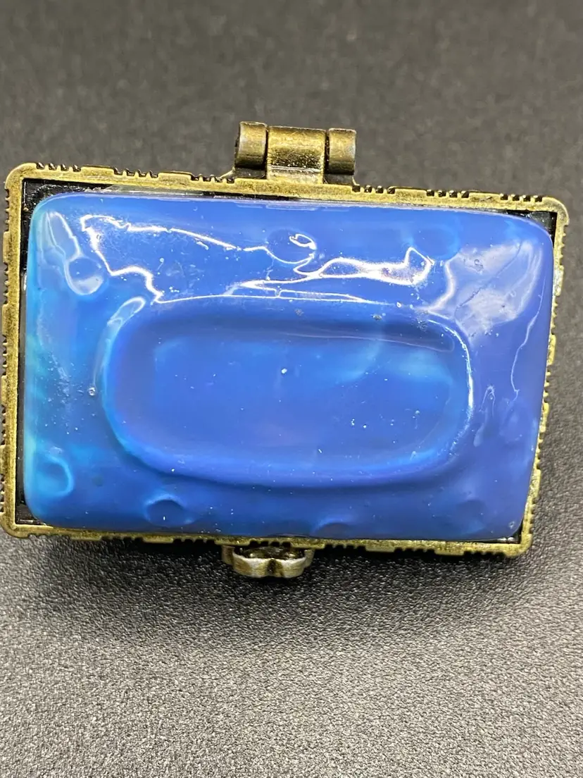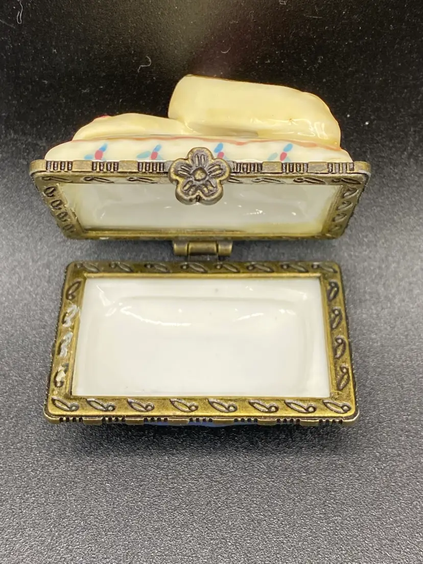 Vintage, hand painted porcelain trinket box. Featuring ballet slippers on a pillow. This stands approximately one and a half inches tall. The hinge is intact and the latch works. There are no chips or cracks.