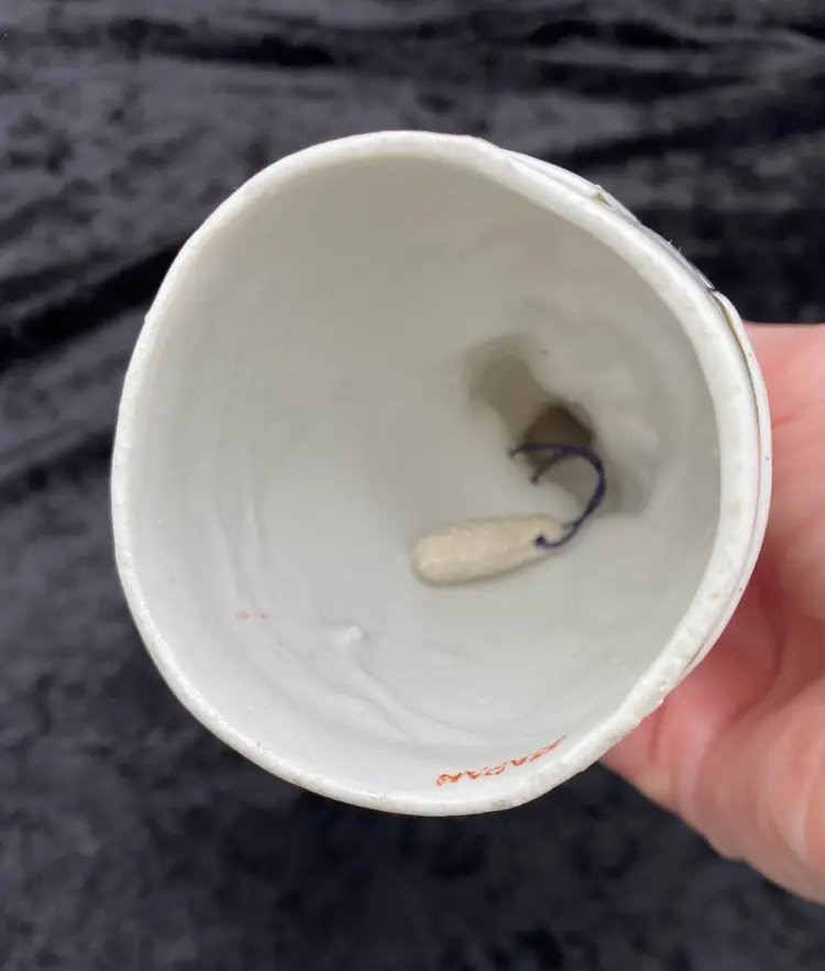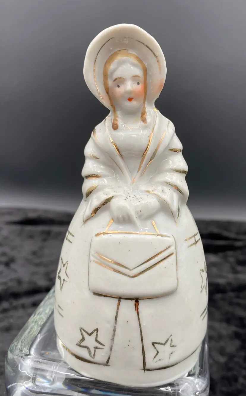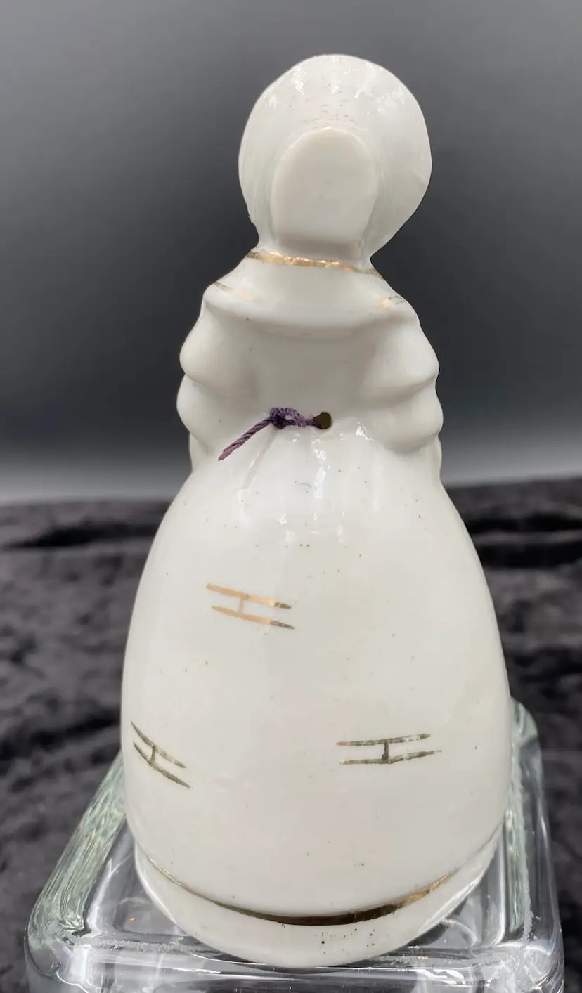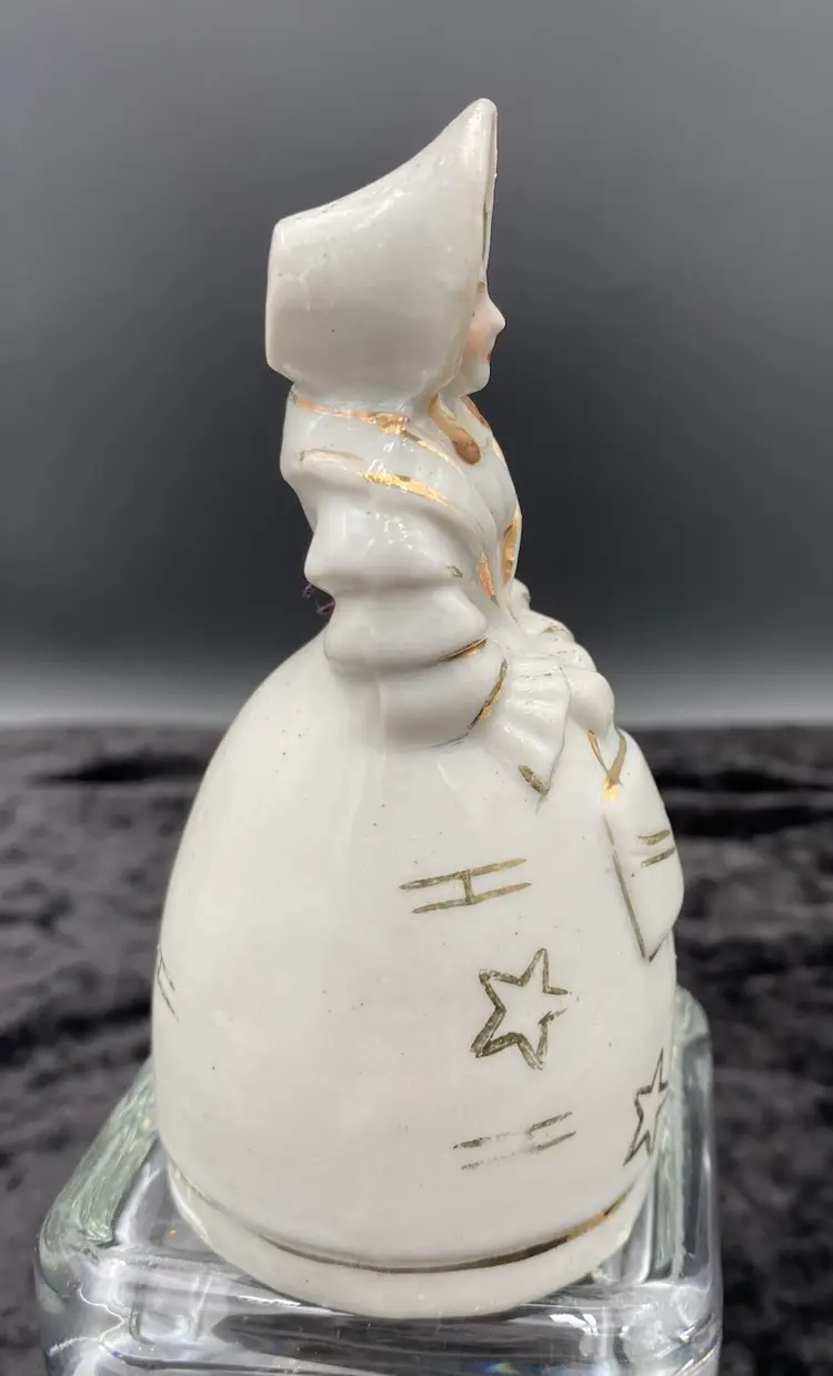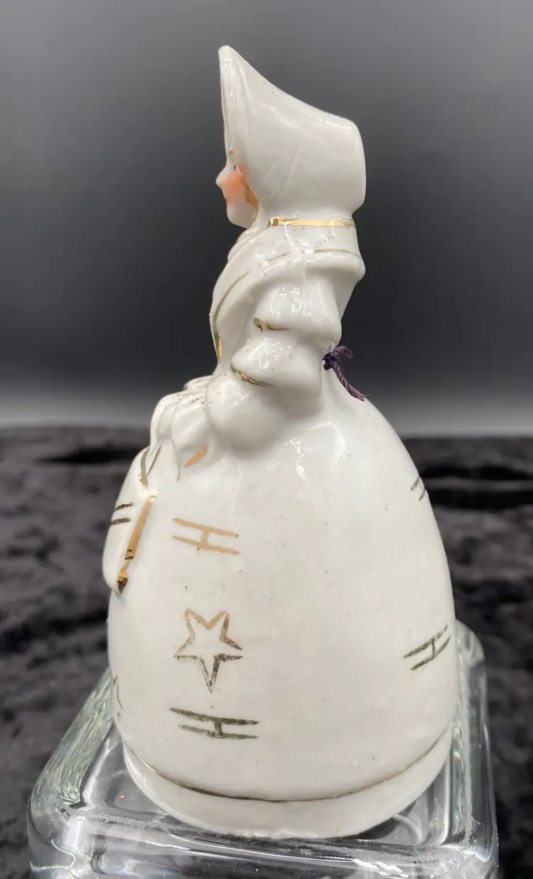 This vintage porcelain bell is a beautiful addition to any decorative collection. Made in Japan during the mid 20th century, this bell features a white porcelain finish with gold gilt outlines as well as a hand-painted hair and face. A Victorian woman holding a purse is the design of the bell. Measuring 4.8 inches in height and 2.4 inches in width, this small bell is perfect for any room and occasion. It weighs 3.6 ounces and is handmade. This bell is a unique and charming piece that would make a wonderful gift or addition to your own collection.