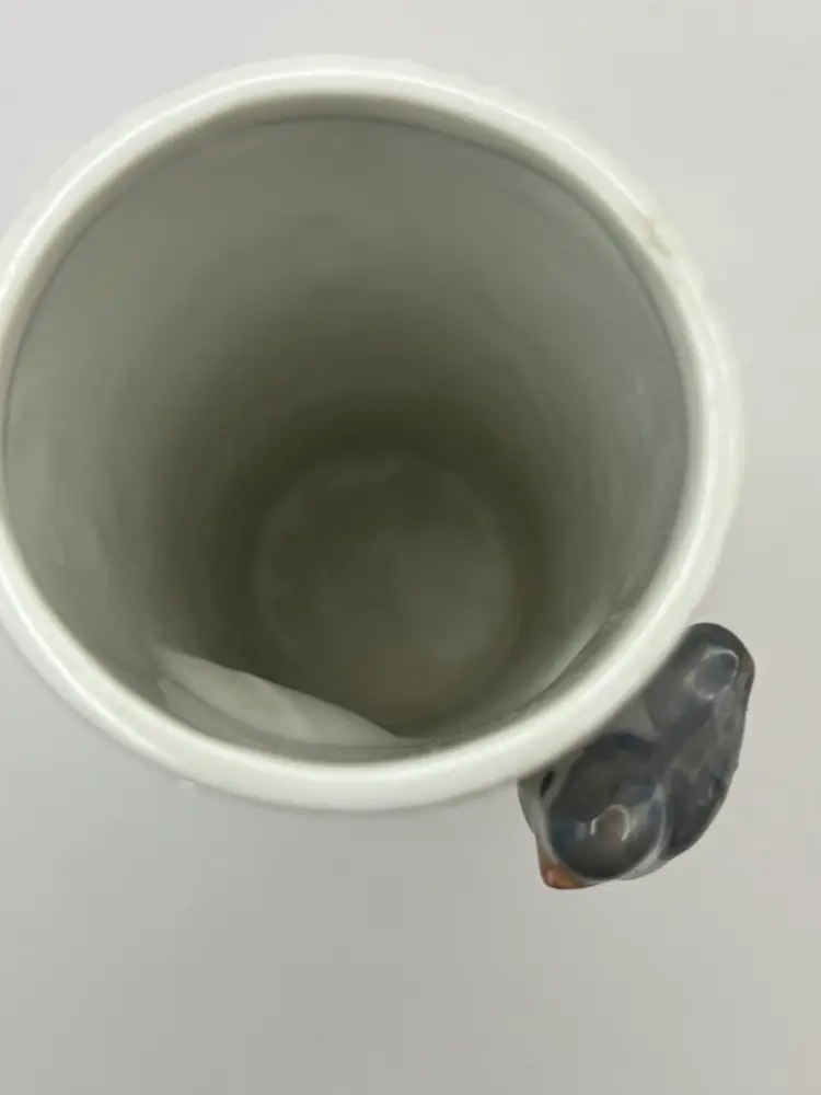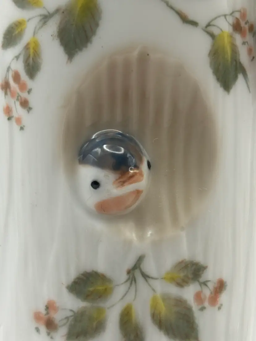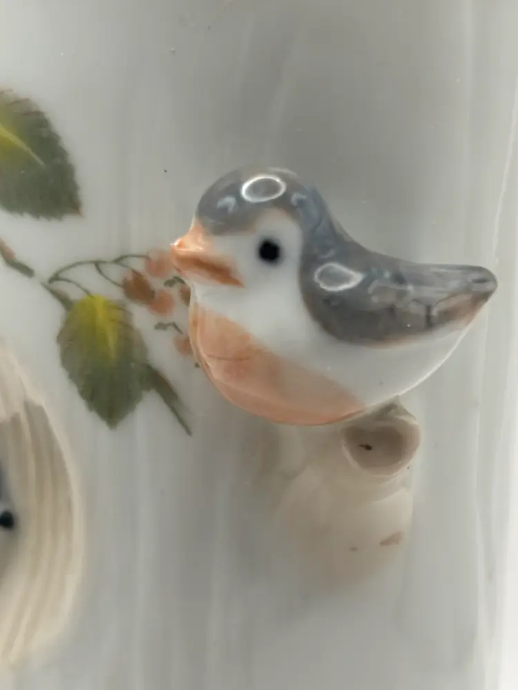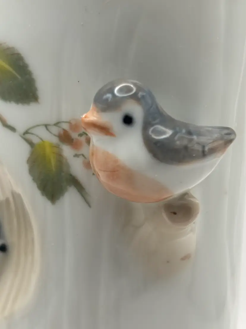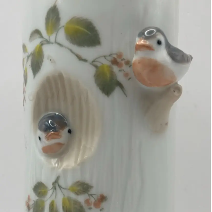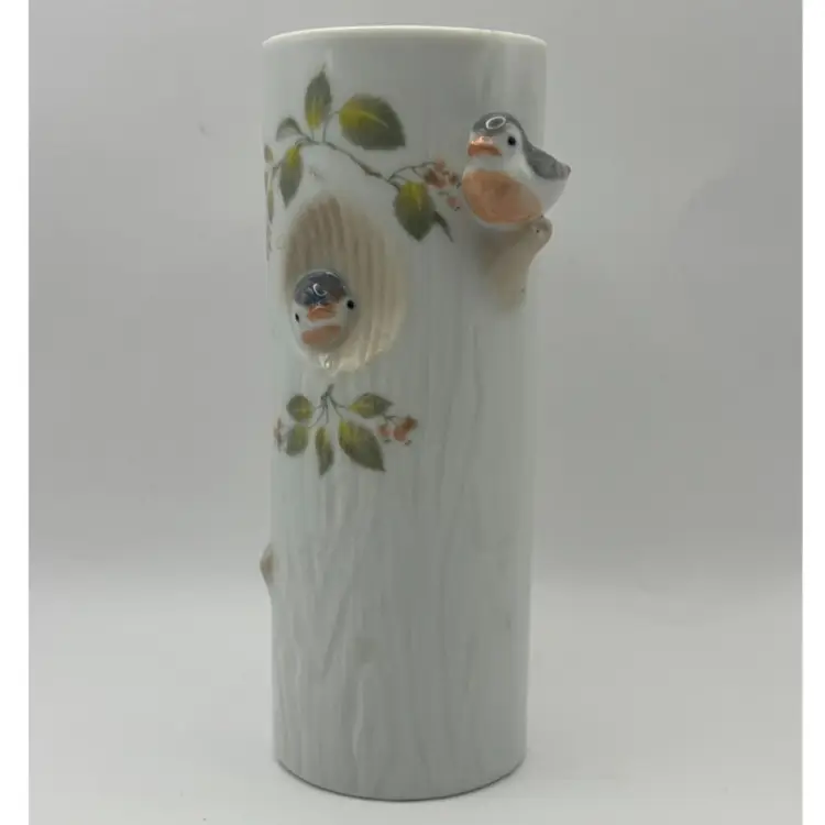 3 D style cylinder flower vase features small birds in a tree. Takahashi San Francisco Made in Japan No chips or cracks 6” H 2” diameter