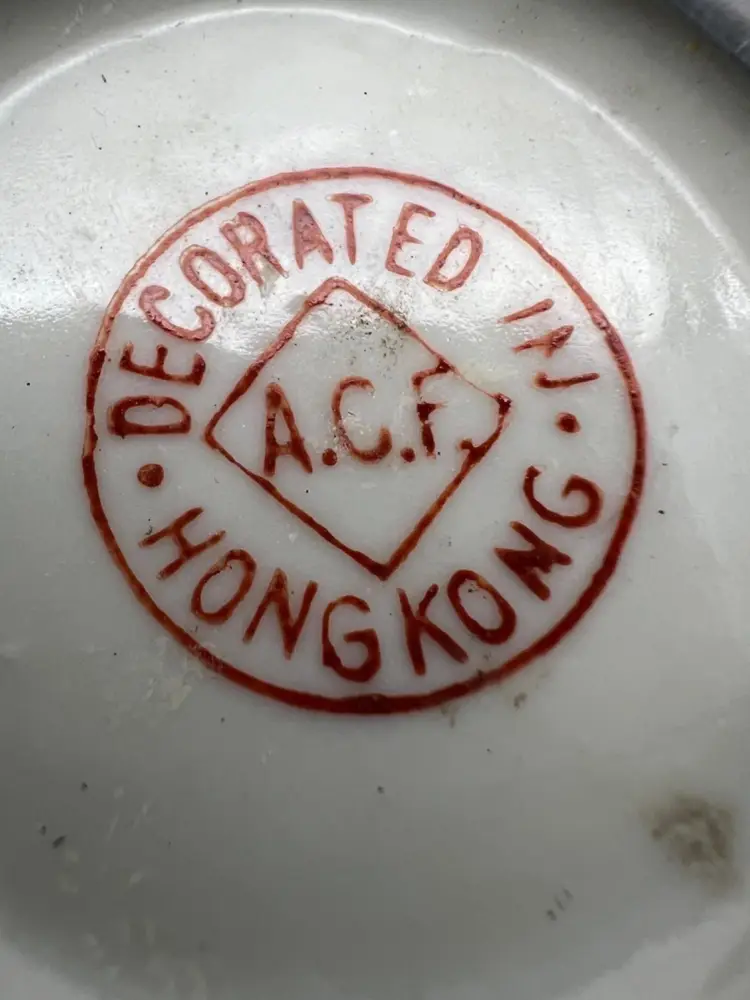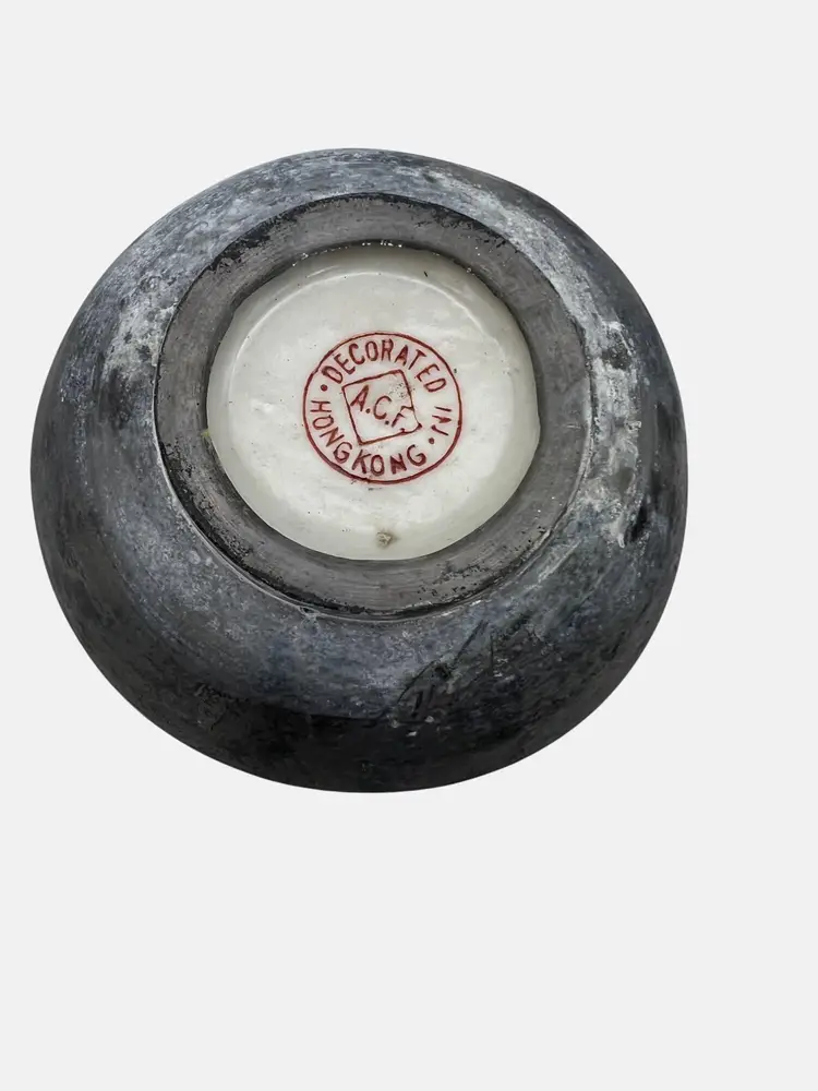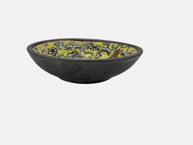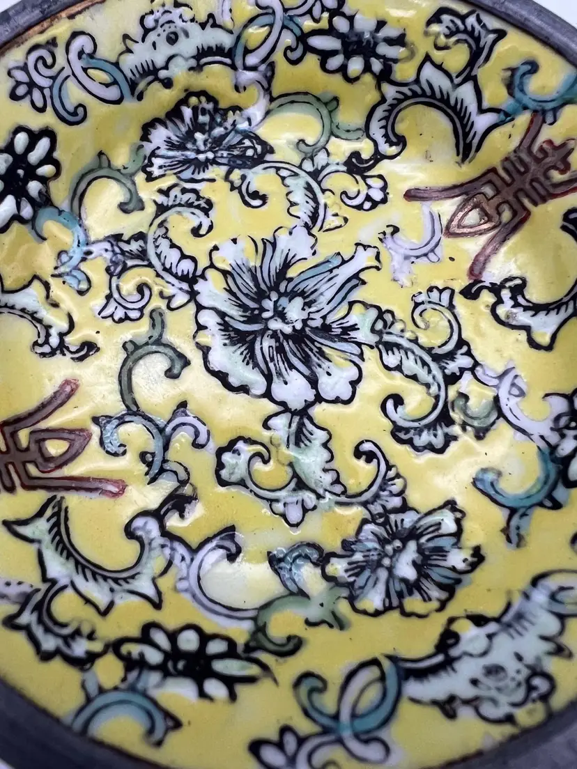 This porcelain bowl by A.C.F., decorated in Hong Kong, is encased in pewter and measures 4 inches across. It features an intricate floral design on a yellow background.