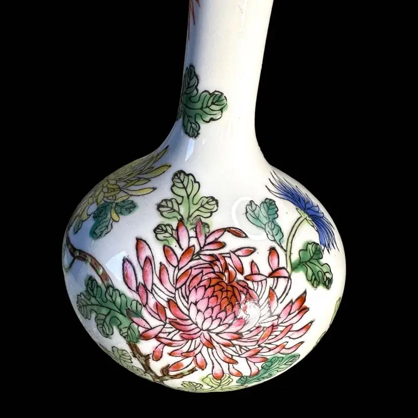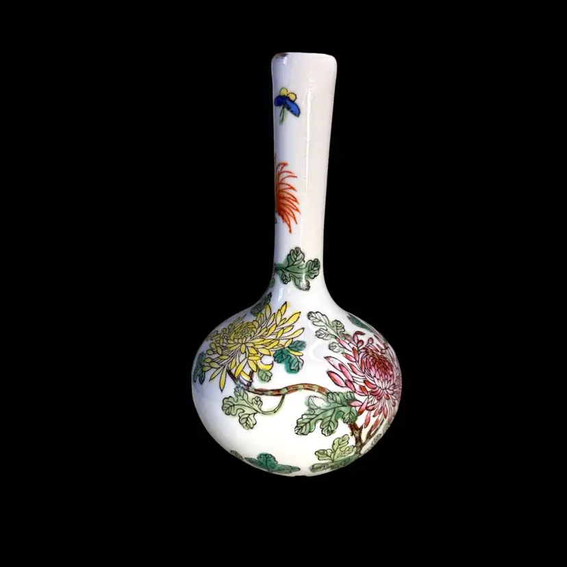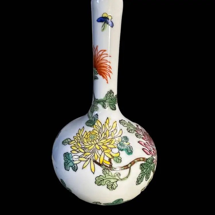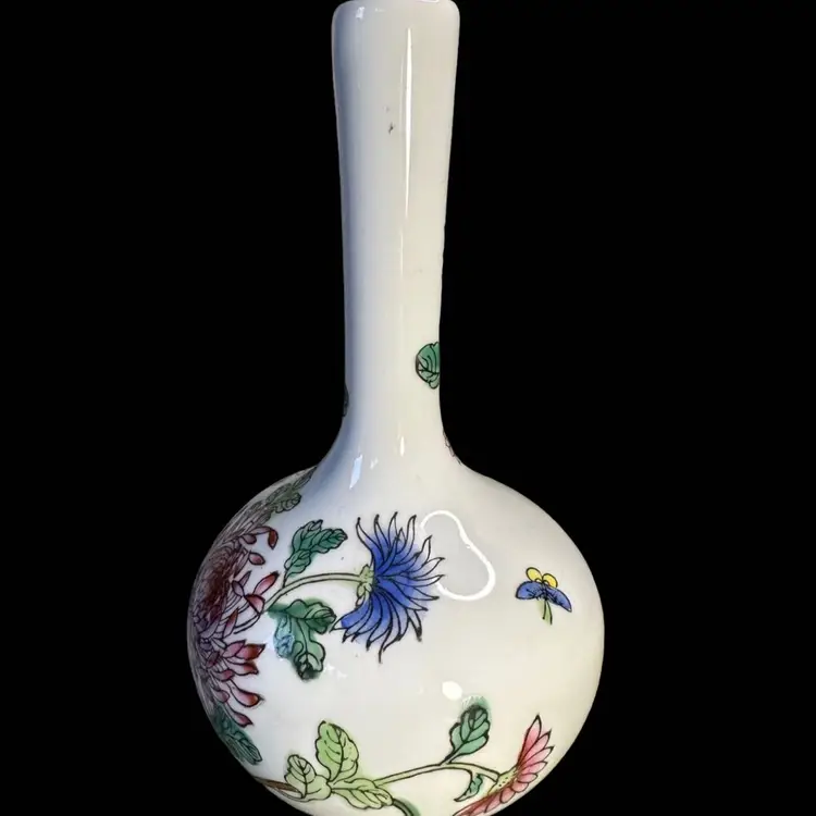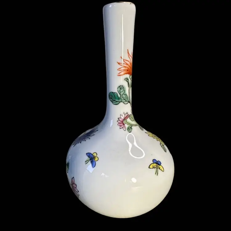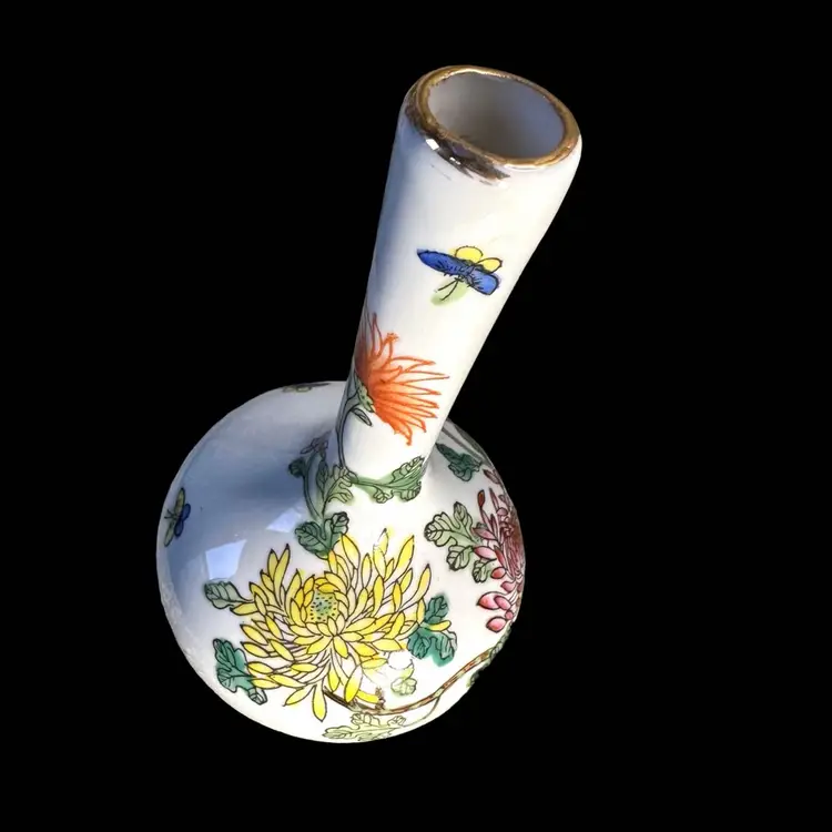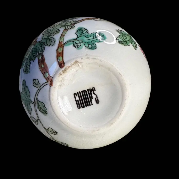 Porcelain bud vase made for Gump’s San Francisco 1960s 5.5” x 3.25 “ says Gump’s in the bottom. No issues at all. Decorated over while surface. Hand painted.