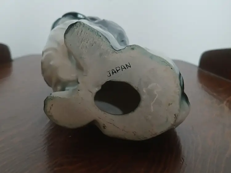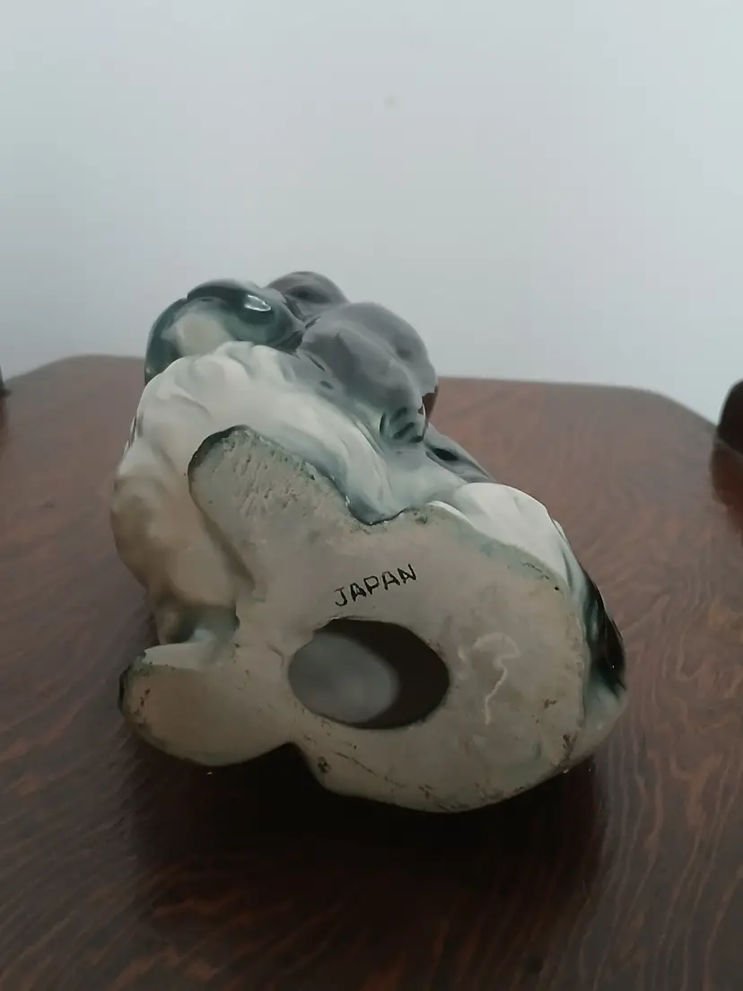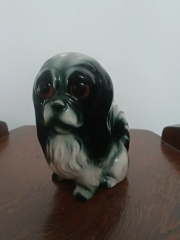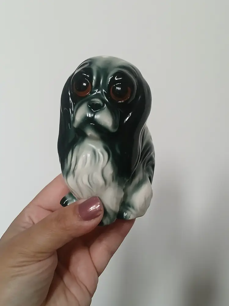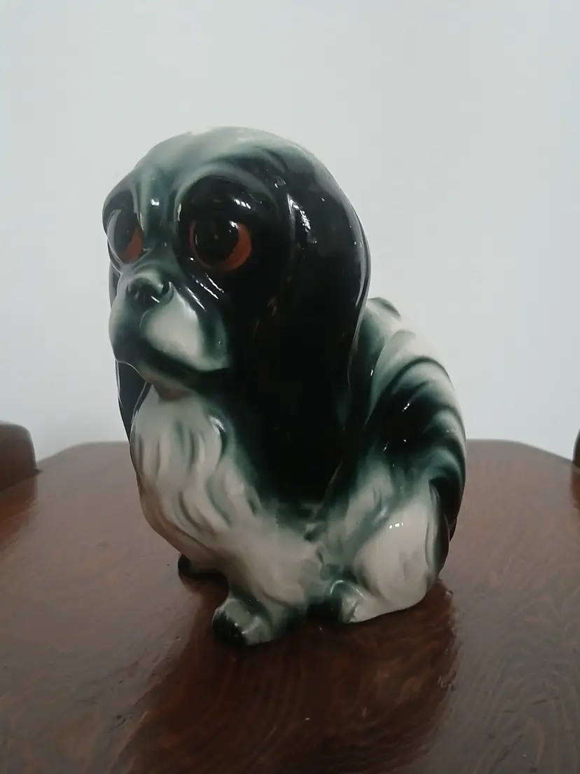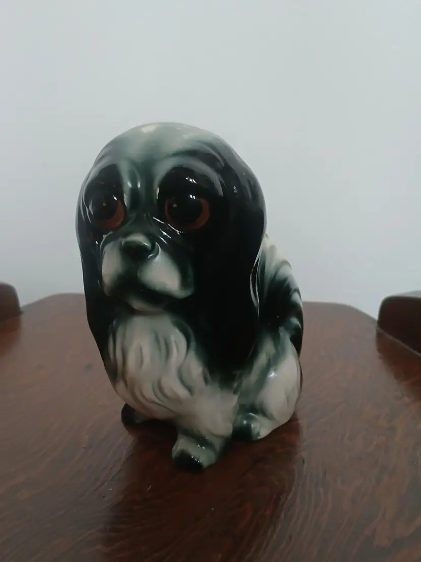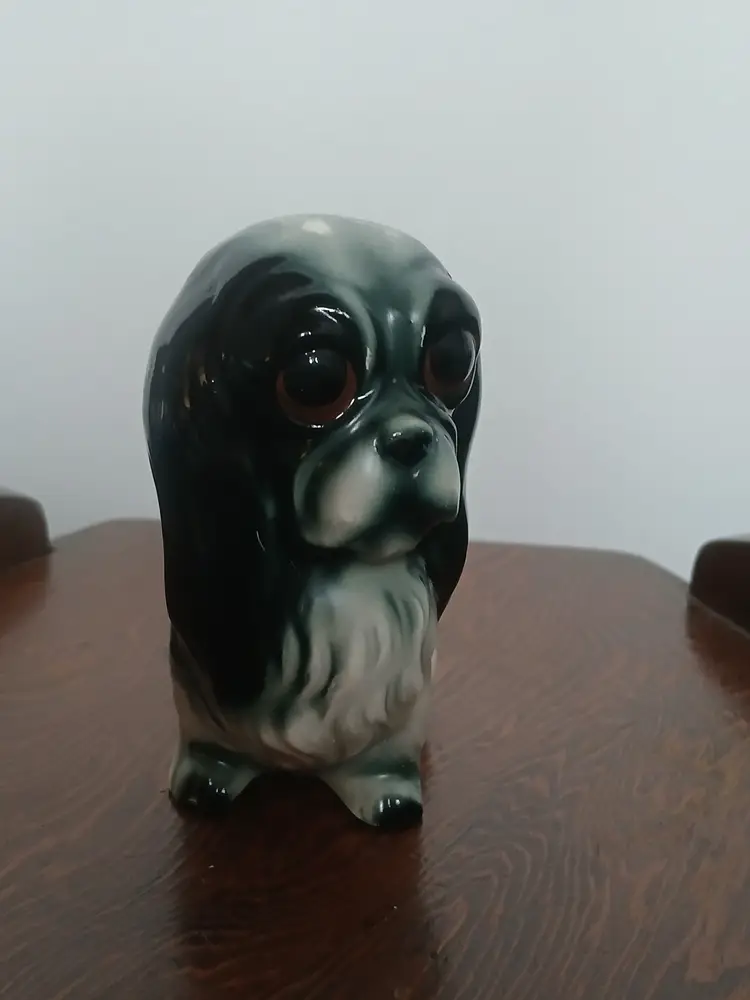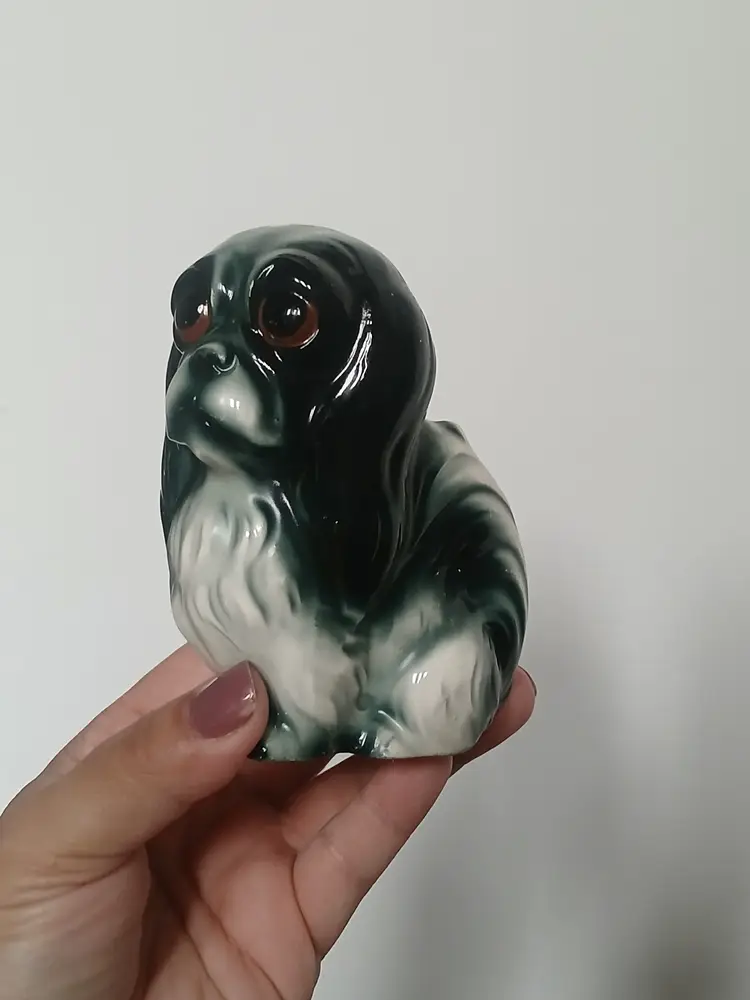 Vintage porcelain ceramic Pekingese dog figurine from Japan. Beautiful black, white and gray glaze with big brown eyes. A very sweet face on this little dog.