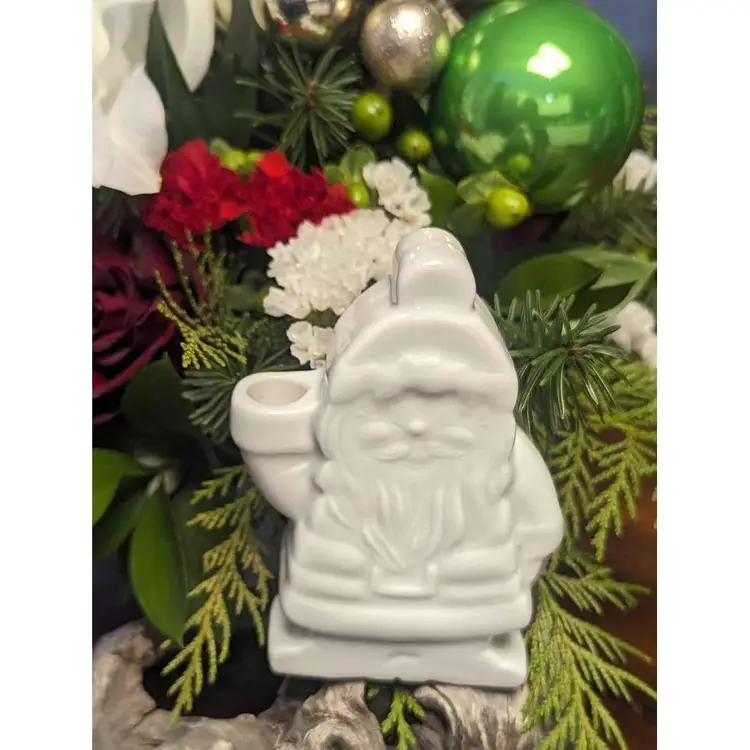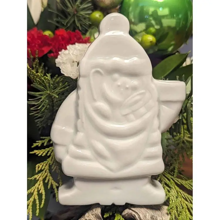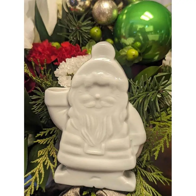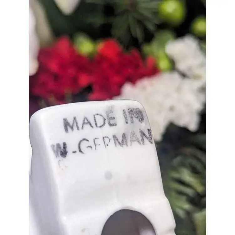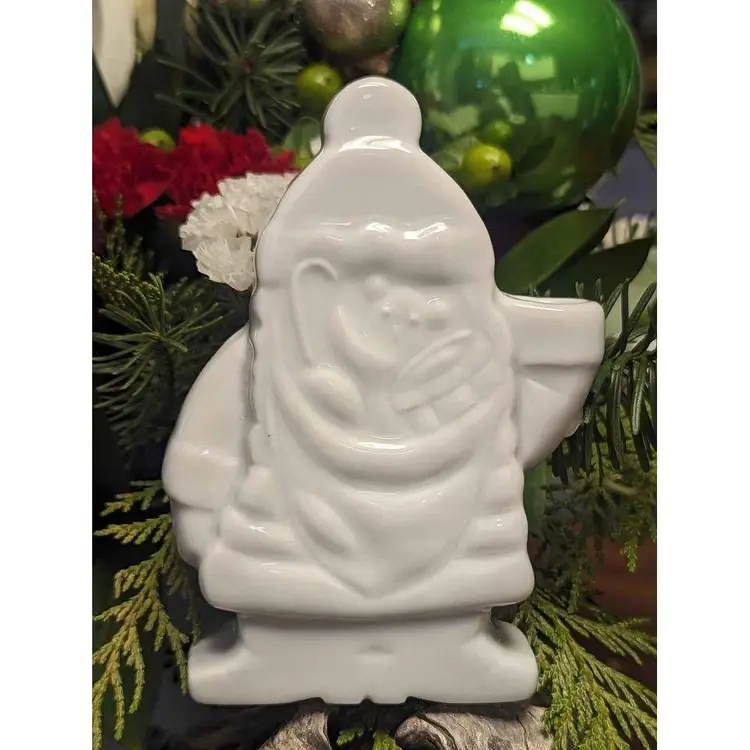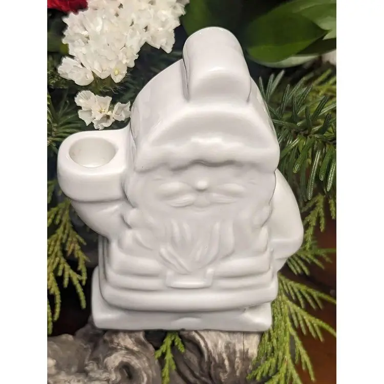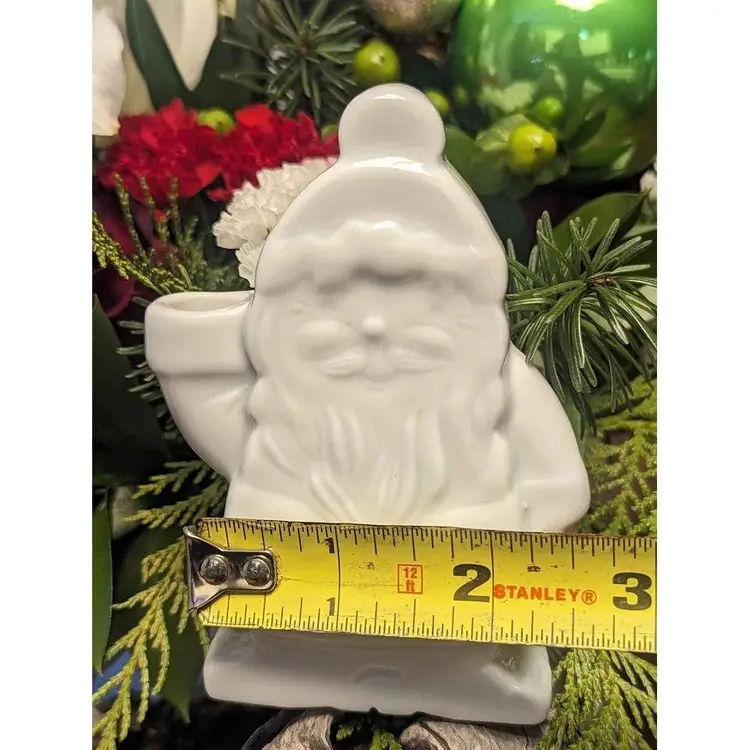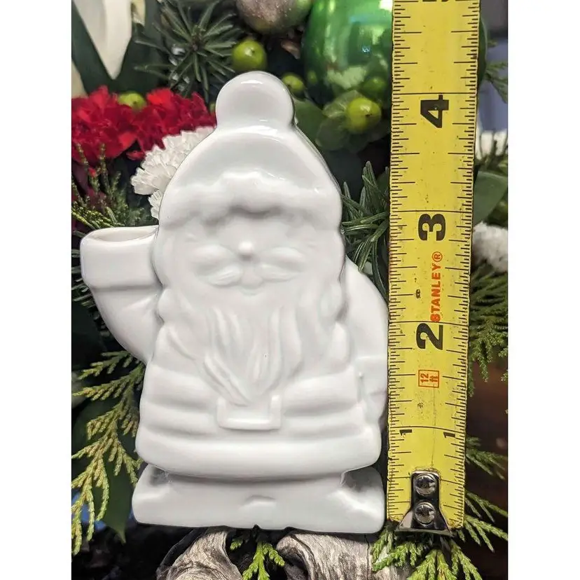 Vintage porcelain ceramic Santa Claus tiny taper candle holder - made in West Germany. This Santa is so cute and unique - front facing is Santa with a spot for a tiny taper candle on the left hand side and from behind her has his toy bag with a teddy bear, drum, and candy cane. This is a glazed white ceramic or porcelain and is stamped made in West Germany on the bottom.