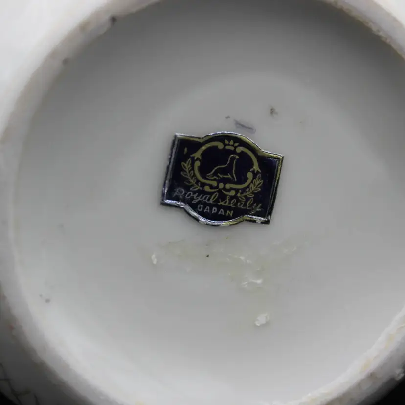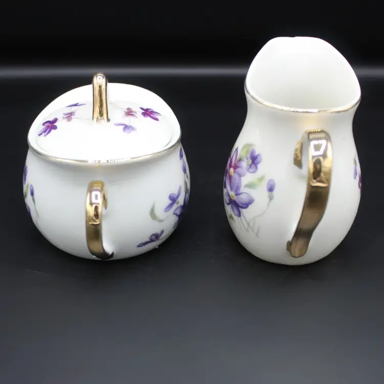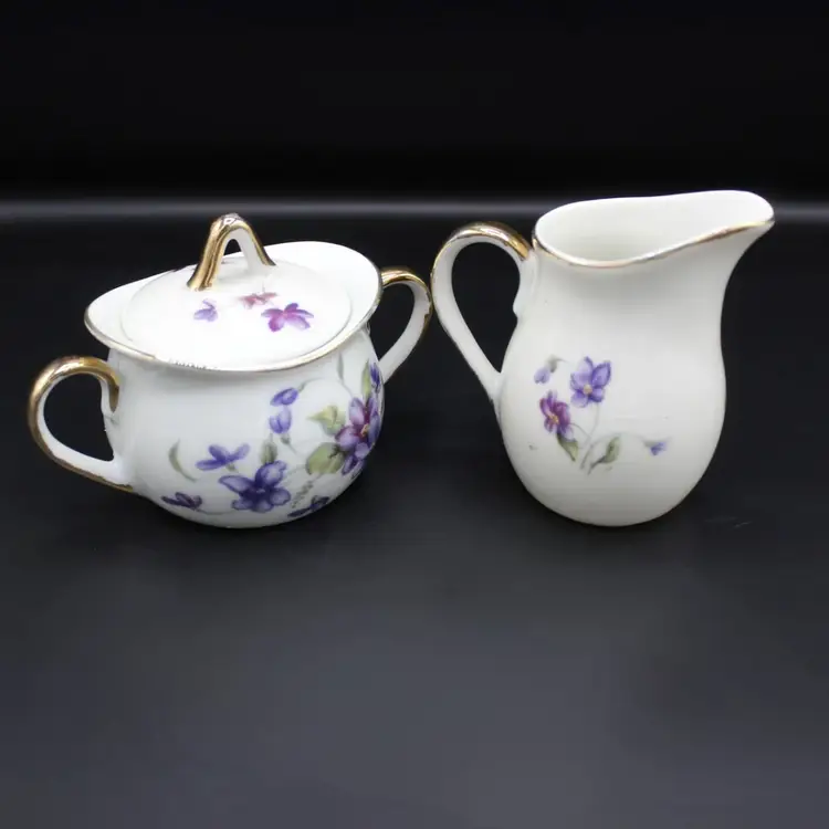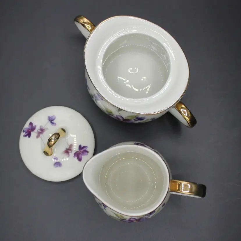 Vintage Royal Sealy Japan Porcelain Creamer & Lidded Sugar Bowl Set 1940s–1960s White base with purple violet flowers and green foliage Gold trim accents on handles, spout, lid, and edges Sugar bowl retains original Royal Sealy foil label Ideal for collectors, vintage tea parties, or cottagecore kitchen décor Hand wash only