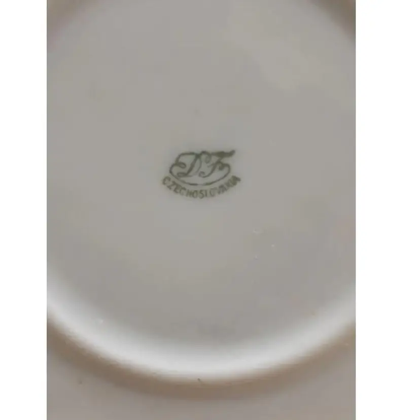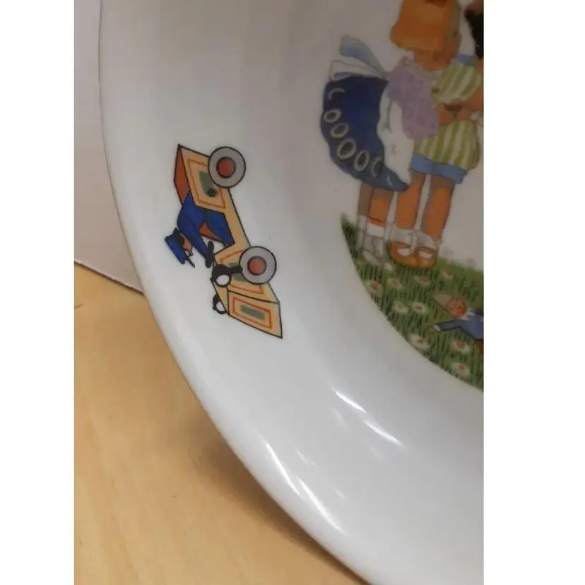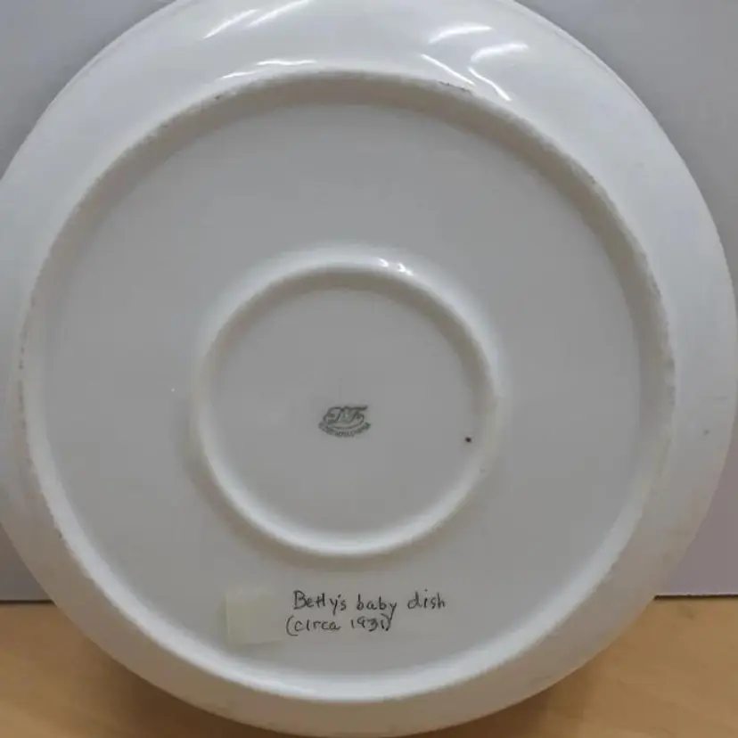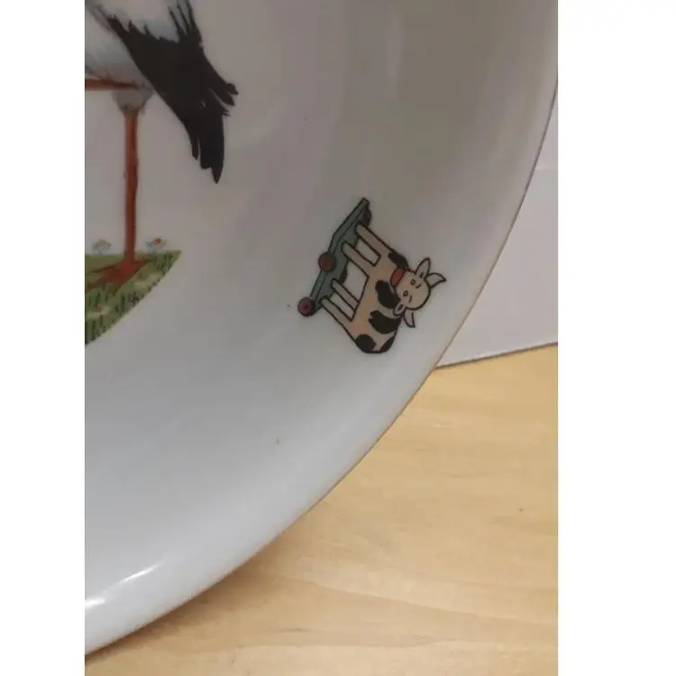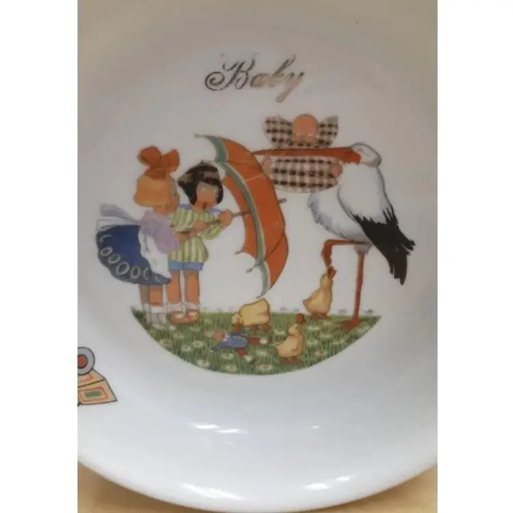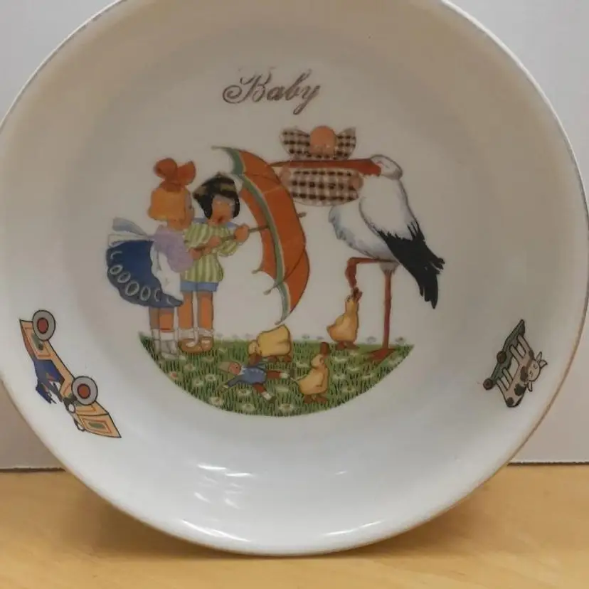 A vibrage art deco style circa 1931 baby dish. Pre mid century. Its has a transfer design of 2 girls with umbrella and stork with baby. There are ducklings and a doll on grass. The word baby is painted in gold gilding. No chips or cracks. Some fading.