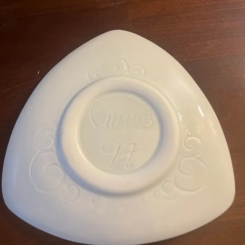This particular dish, with its stylized aquatic life and bird imagery, likely draws inspiration from traditional East Asian art, possibly reflecting a contemporary interpretation of these classic themes. The use of bold blue, green, and pink colors, along with the swirling decorative elements, suggests a decorative piece intended for display, perhaps as a trinket dish or a small serving plate, dating from the late 20th century.