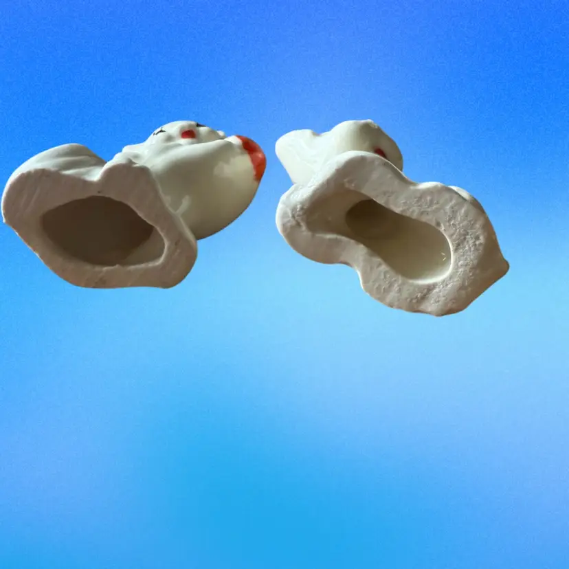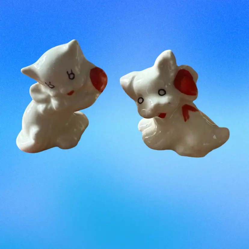 Most likely mid century. Possibly Japan . Not marked cream colored with red accents. Cat is 2” tall. Dog is 1.75”.