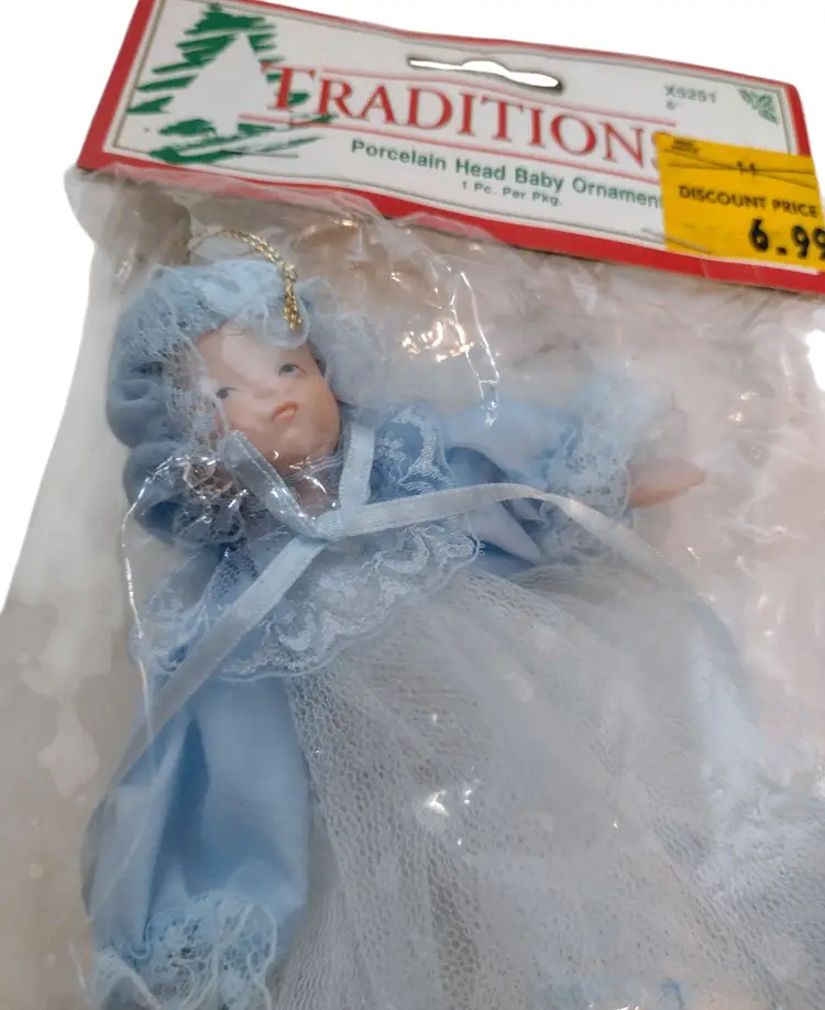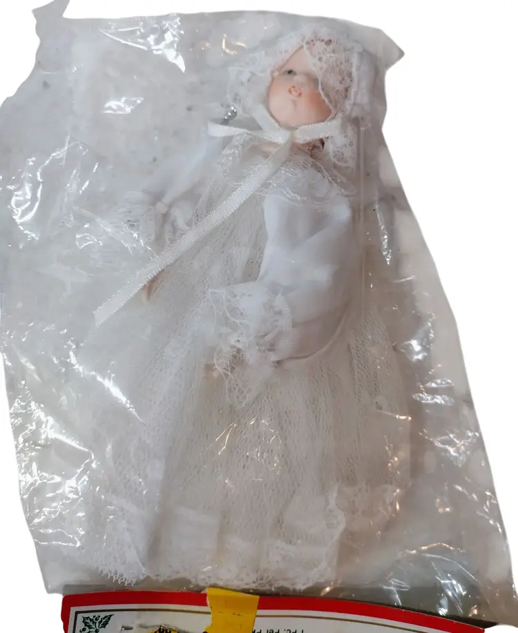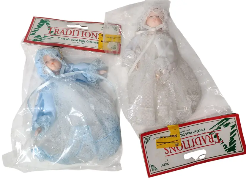 Items are new in packaging and in a smoke free environment. These are adorable porcelain doll ornaments fabric & lace. These are cute for anytime of the year. Each doll measures 6" tall x 5" wide.