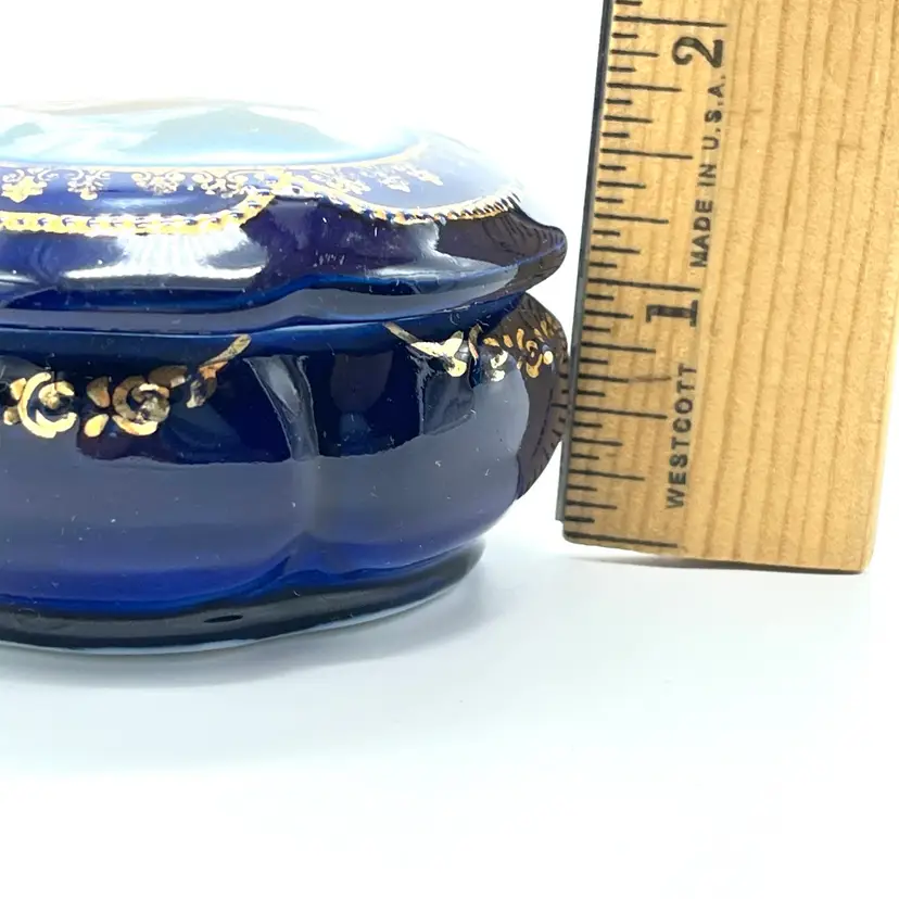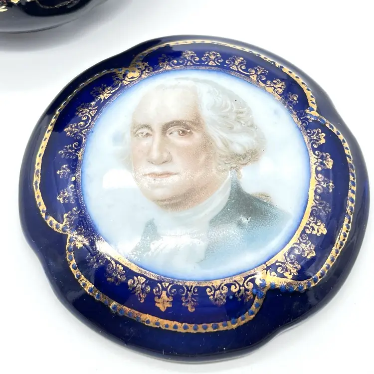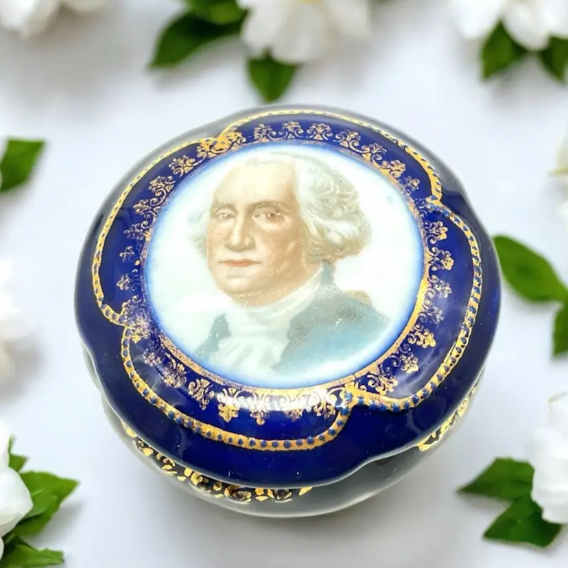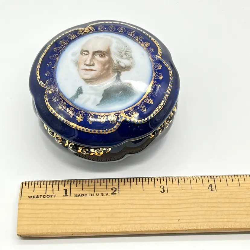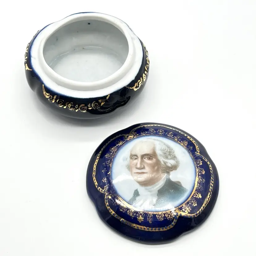 Vintage porcelain trinket box featuring a portrait of George Washington. Lovely cobalt blue with gilded decoration.