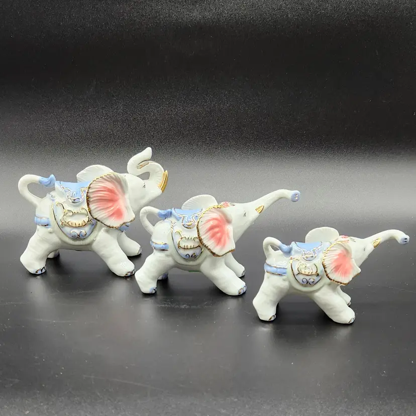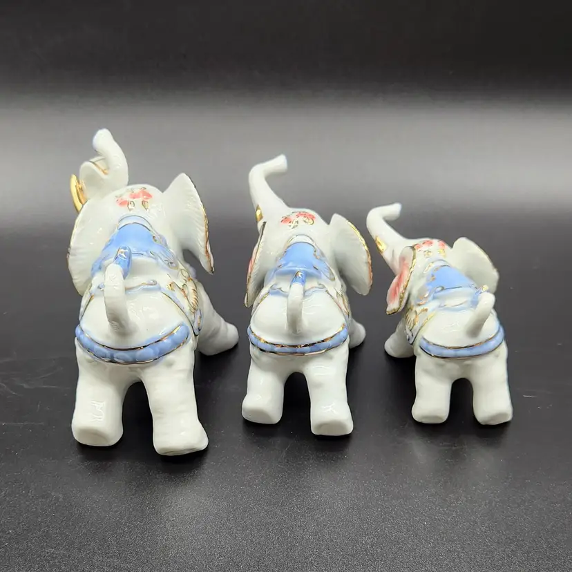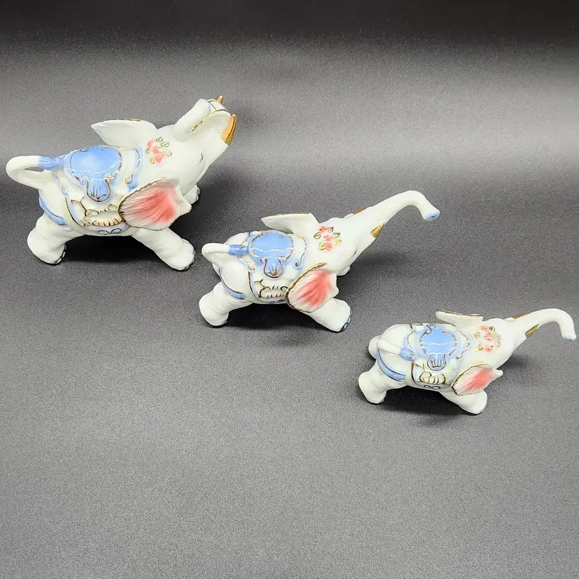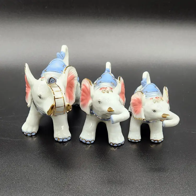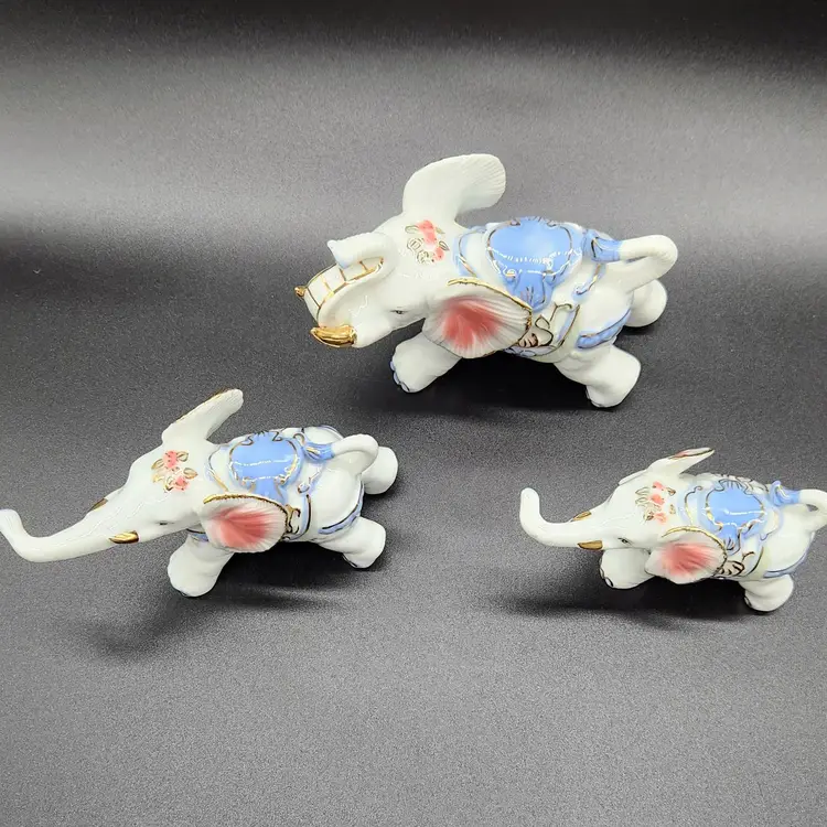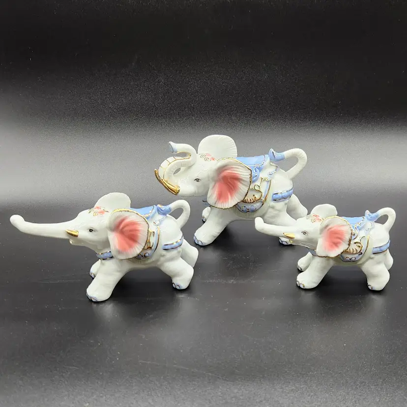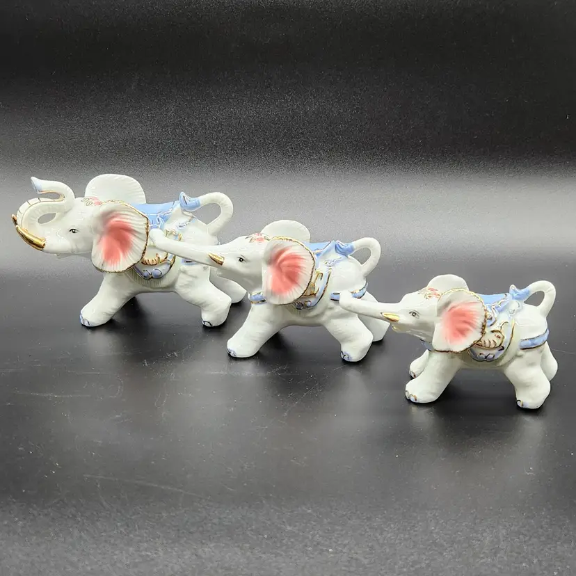 Charming set of 3 porcelain elephants, each adorned with delicate gold and blue details. Perfect for collectors or as a whimsical home decor accent. Dimensions vary per elephant. Large 3.5 in H 6 in L 3 in W Med 3 in H 6 in L 2.5 in W Small 2.5 in H 5 in L 2 in W