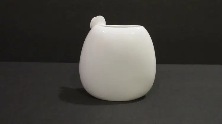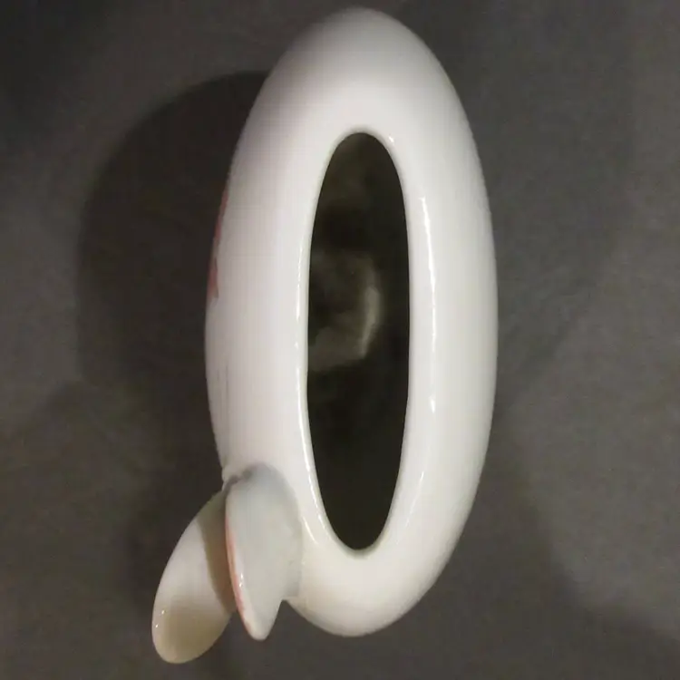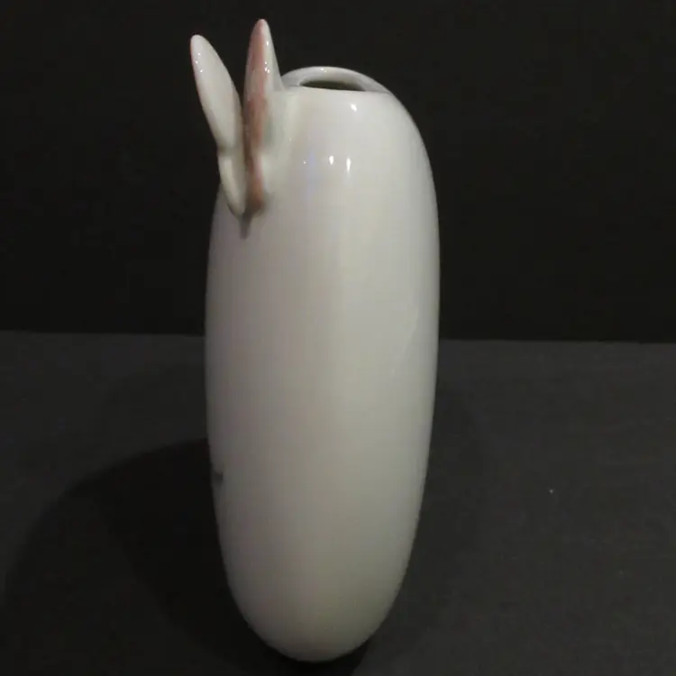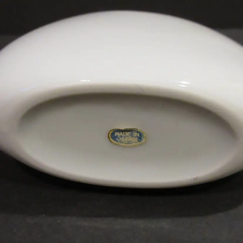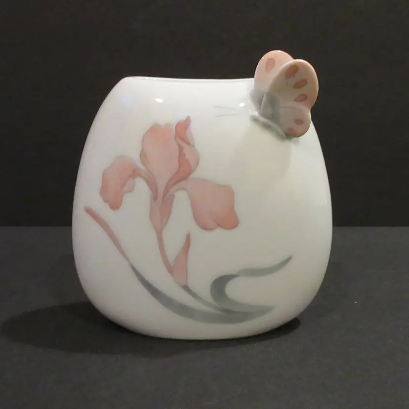 This is a BEAUTIFUL VINTAGE bud vase made in Japan in the 1960s. It has an oval shape and narrow opening at the top to fit a few small flowers. It is made of porcelain, and is glazed white with a pink and green iris pattern on one side. There is a small pink and gray porcelain butterfly applied near the top to make it look like the butterfly has landed on the vase. The effect is BEAUTIFUL. This vase is about 4.5 inches tall, 4.25 inches long and 1.5 inches wide. It's in EXCELLENT CONDITION! There are no issues at all. It's clean and LIKE NEW!