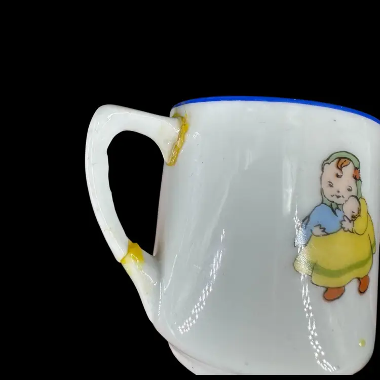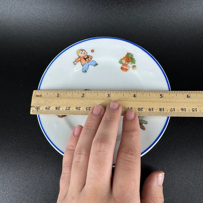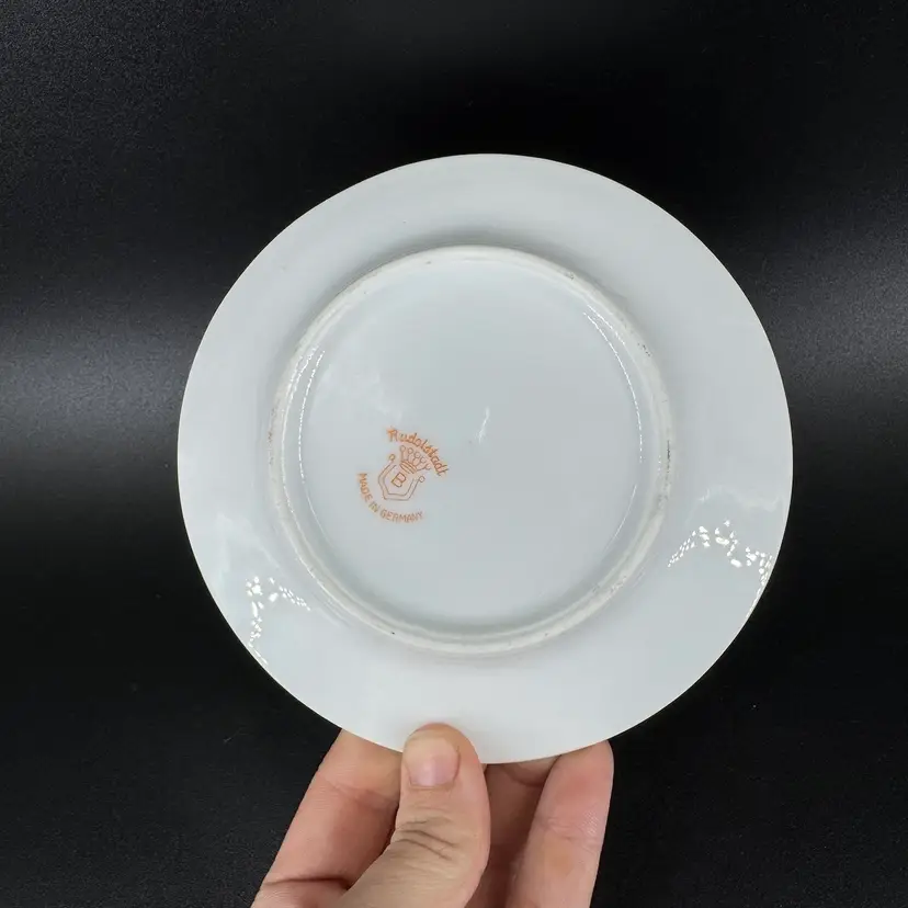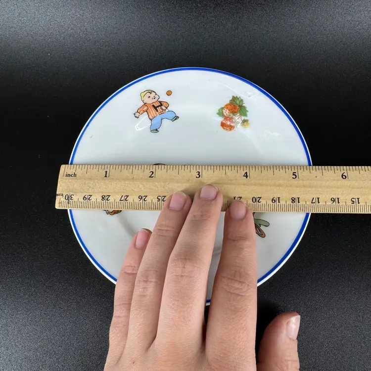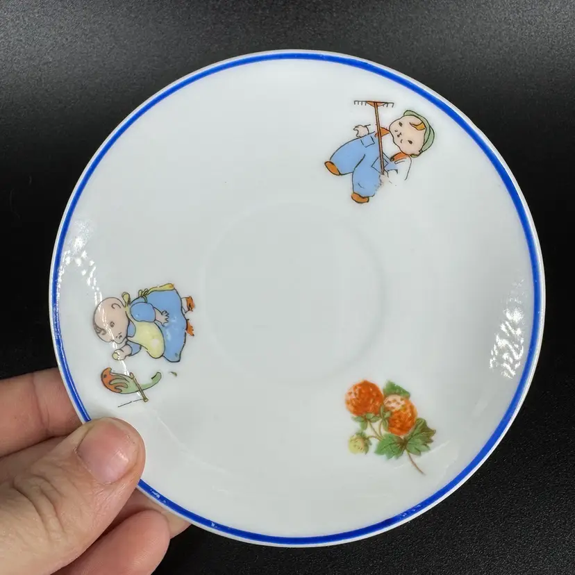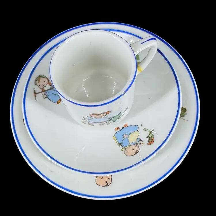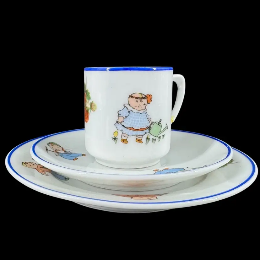This is a vintage porcelain child’s dinnerware set. It includes a small cup and two plates of differing sizes. Each features babies & floral design. The handle of the cup has been broken and glued back on, as shown in photos. Both cup and big plate includes a stamped “Rudolstadt Made in Germany” logo on the bottom. Small plate has no logo. Some wear on prints of all piece is shown, due to usage. No other chips, cracks, or damage detected. Big plate measures approximately 5.5” wide, small plate 4.5” wide, and cup 2” tall.