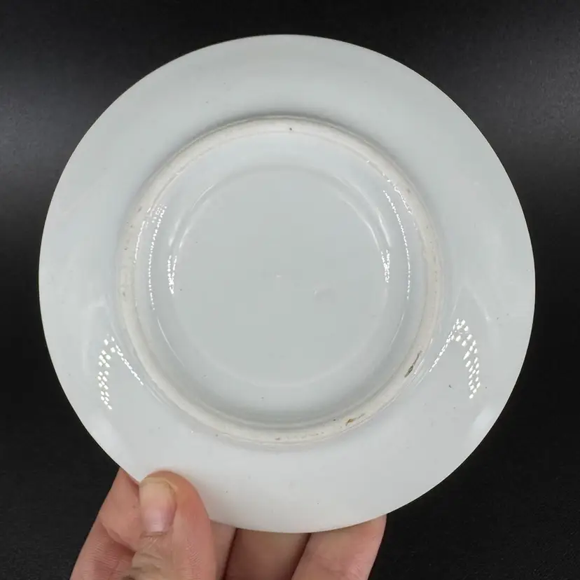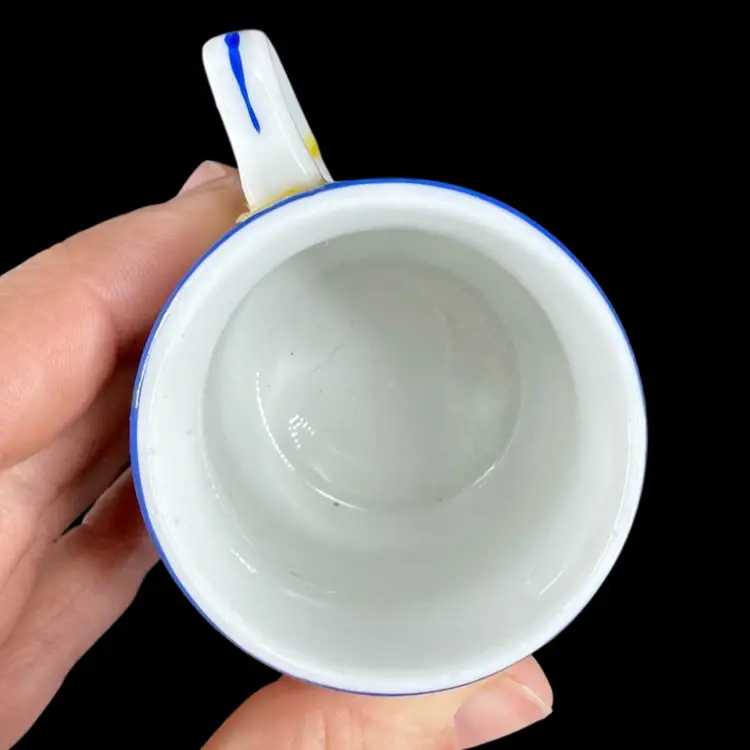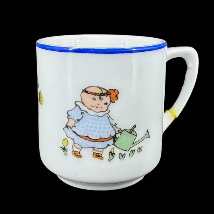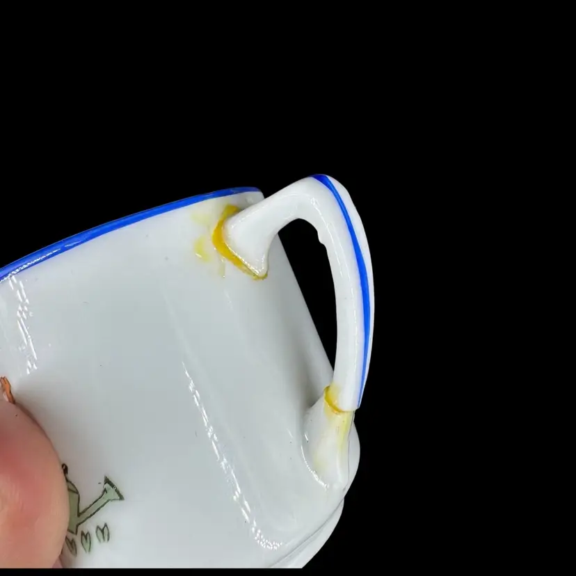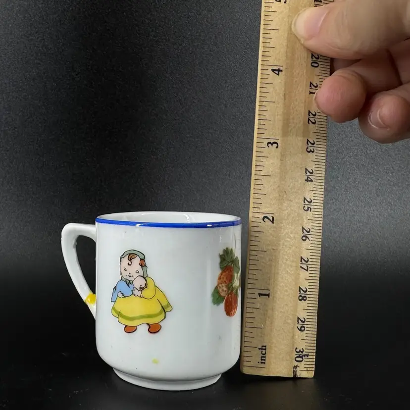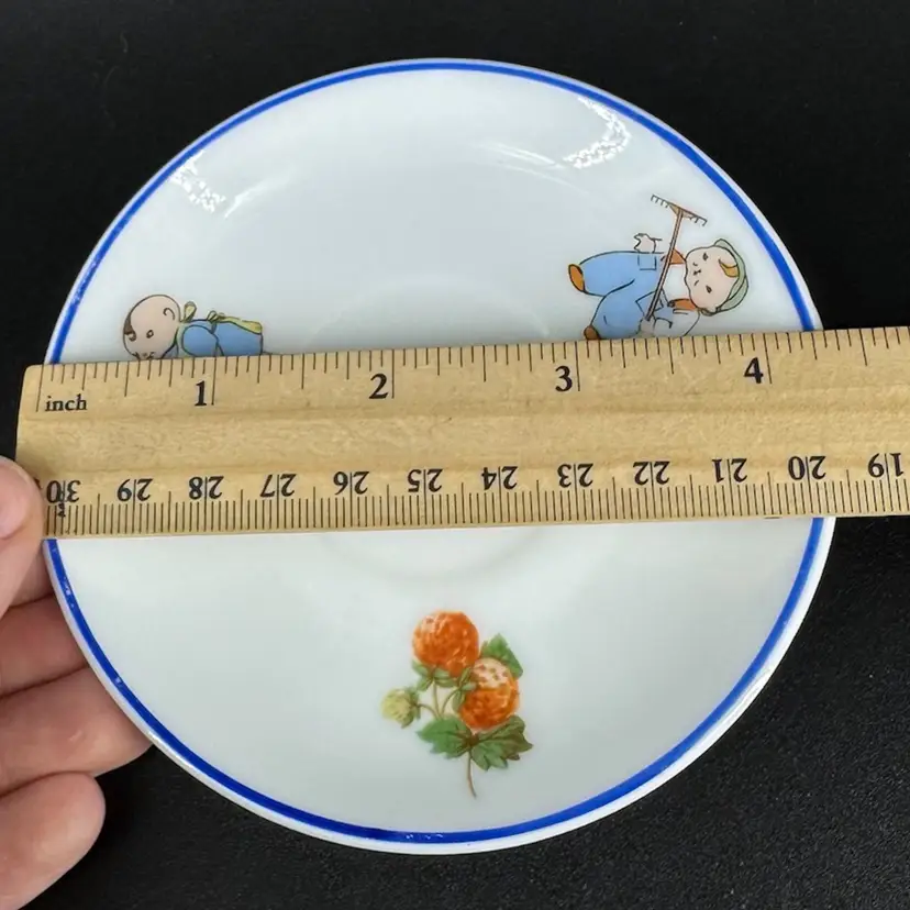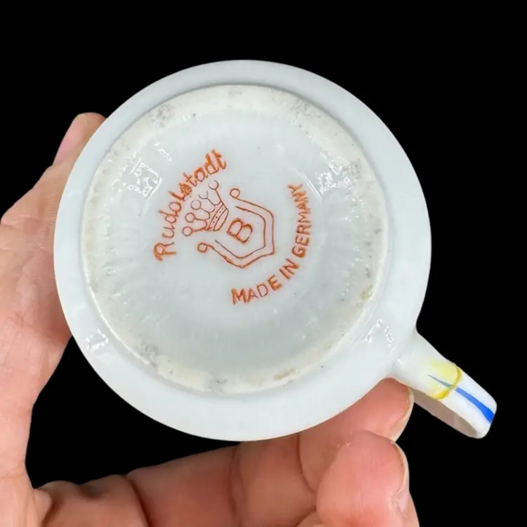 This is a vintage porcelain child’s dinnerware set. It includes a small cup and two plates of differing sizes. Each features babies & floral design. The handle of the cup has been broken and glued back on, as shown in photos. Both cup and big plate includes a stamped “Rudolstadt Made in Germany” logo on the bottom. Small plate has no logo. Some wear on prints of all piece is shown, due to usage. No other chips, cracks, or damage detected. Big plate measures approximately 5.5” wide, small plate 4.5” wide, and cup 2” tall.