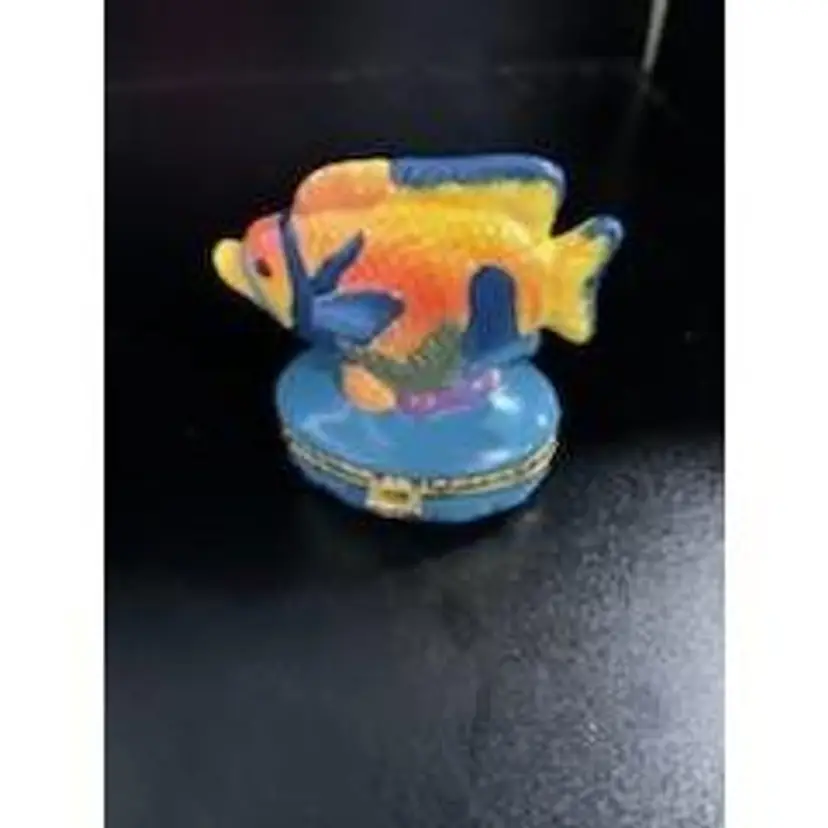 Vintage porcelain hinged tropical fish trinket box that has no cracks or chips. This would make a great gift or display in a beach house.