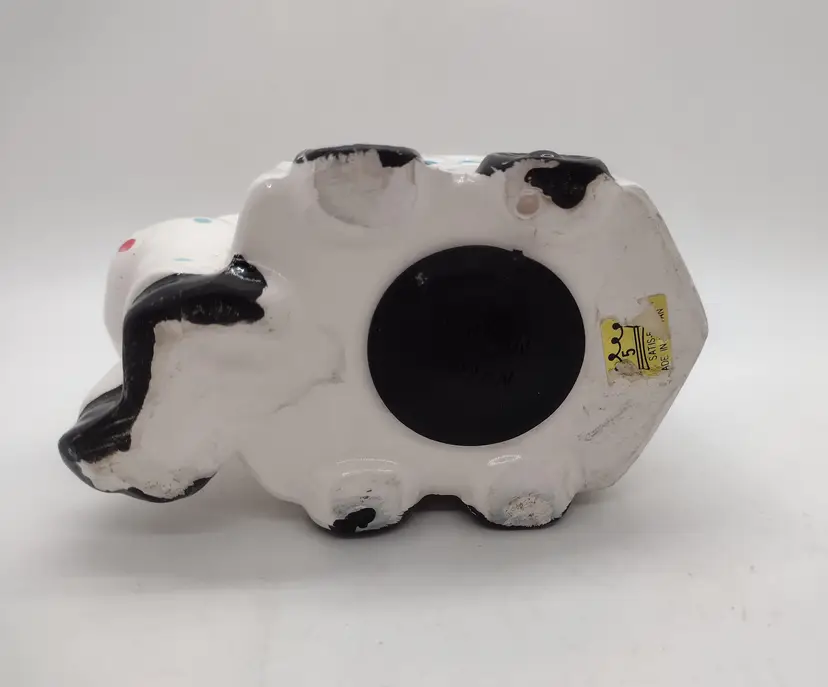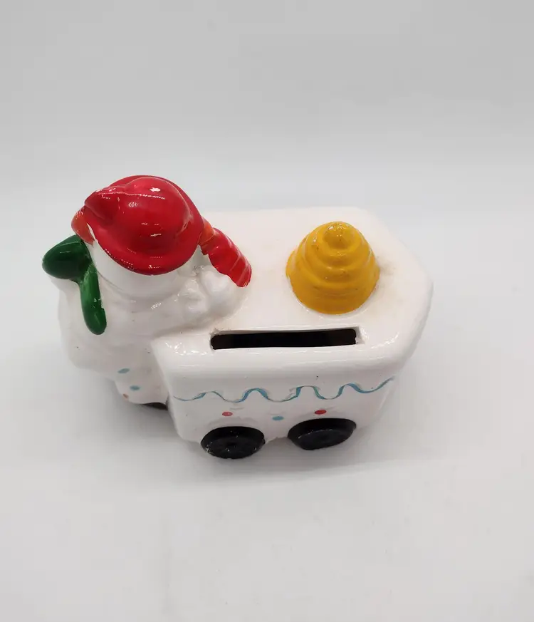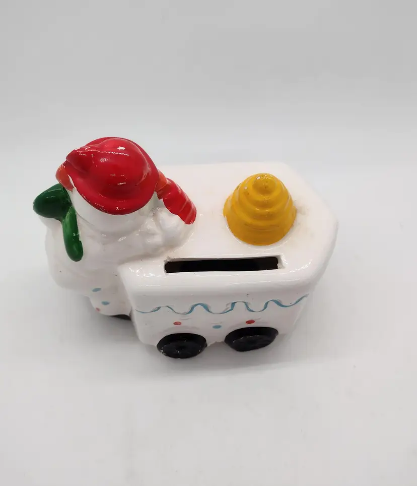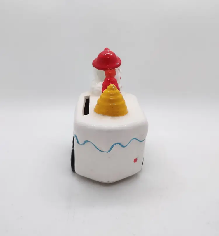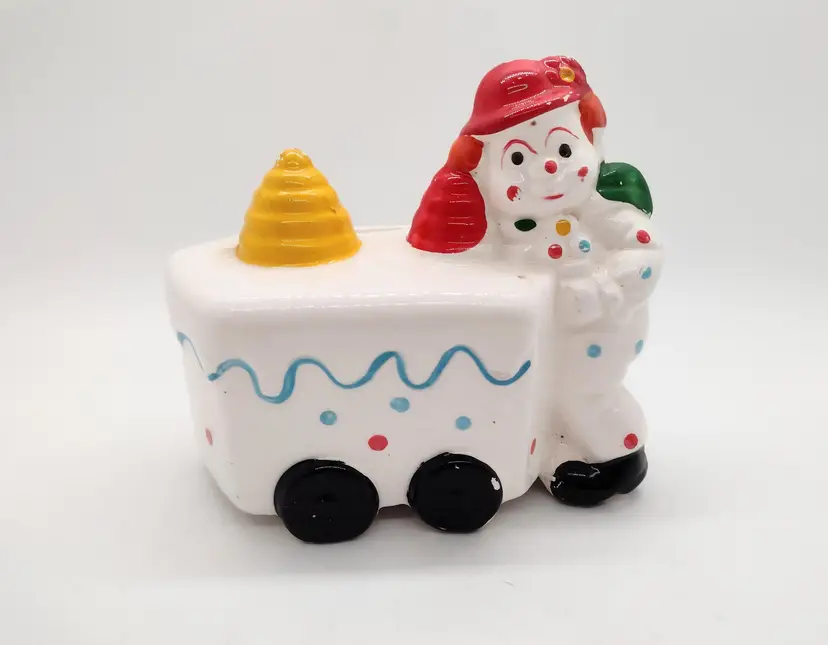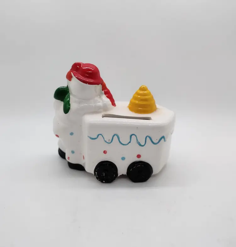 Item is pre-owned and in very good condition with no cracks or chips. There are a couple places where the plant is wearing. There is also some crazing, mainly on the cart. Smoke free environment. This is an adorable bank with fun colors. This is branded, but as you can see, some of the sticker is worn off. Bank measures 4.75" long x 2.75" wide x 4.25" tall.