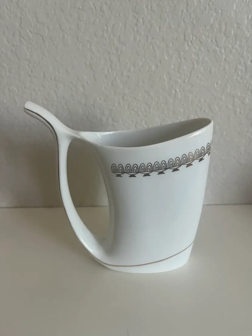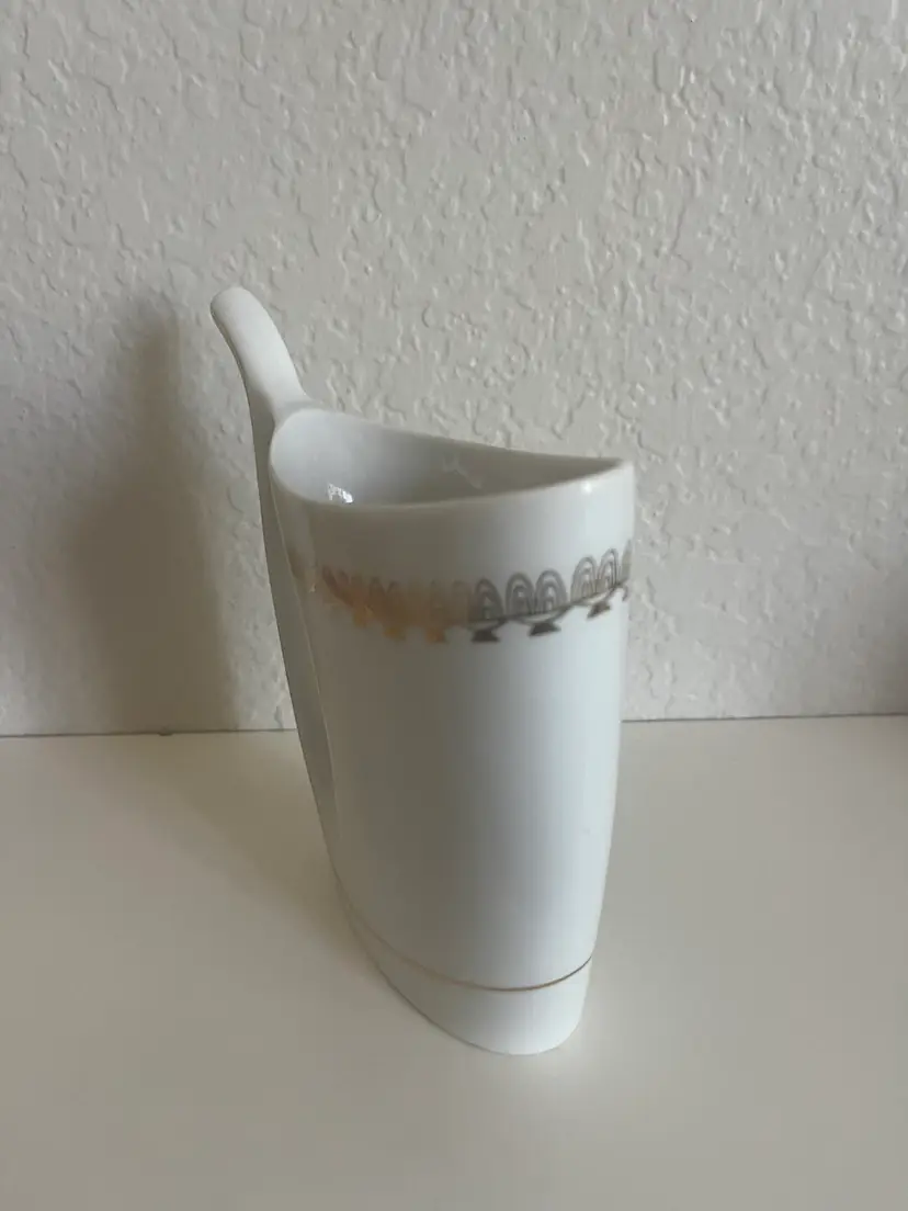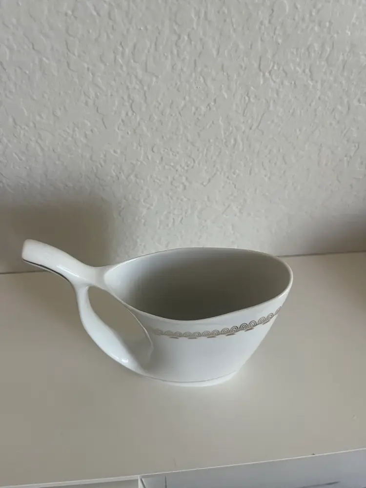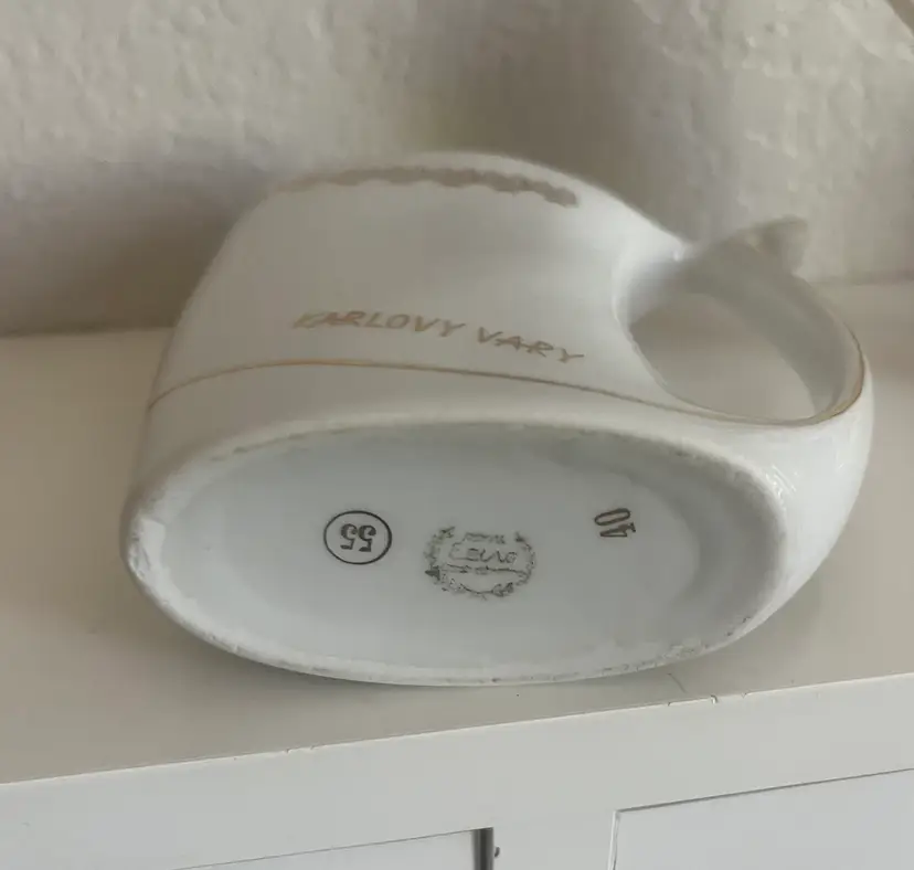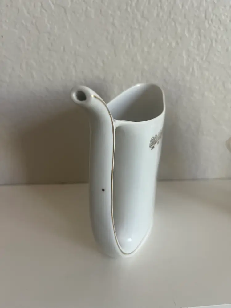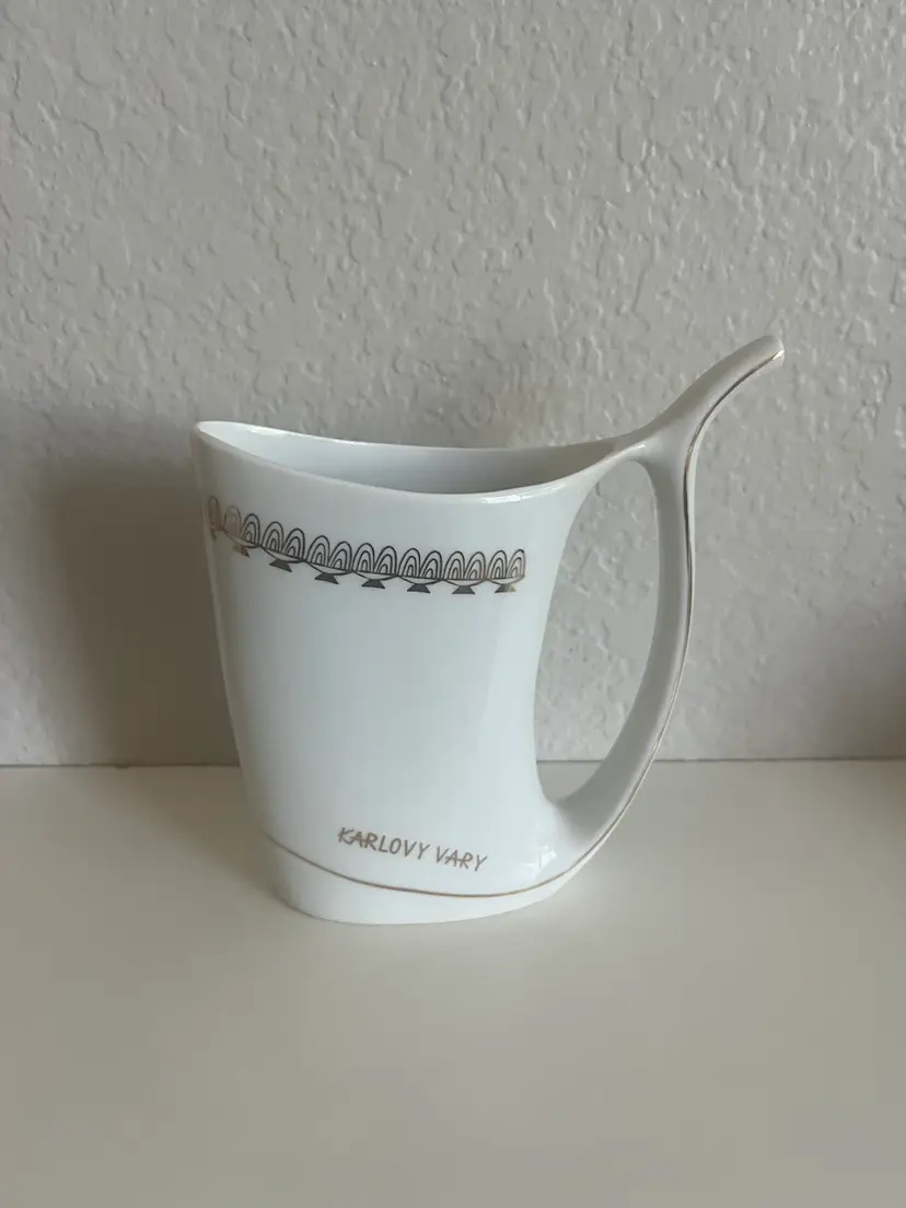This is a Karlovy Vary porcelain sipping cup, also known as a spa cup, from Karlovy Vary (formerly Karlsbad), Czech Republic. Purpose: These unique cups were designed for drinking the mineral-rich spring waters found in the spa town of Karlovy Vary, known for their purported health benefits. Design: The distinctive feature is the built-in sipping spout, emerging from the base, which allows for easy drinking of the mineral water on the go, without spills. Origin: Spa cups like this one originated in the spa region of northwest Bohemia, specifically around towns like Karlovy Vary, Mariánské Lázně, and Jáchymov.