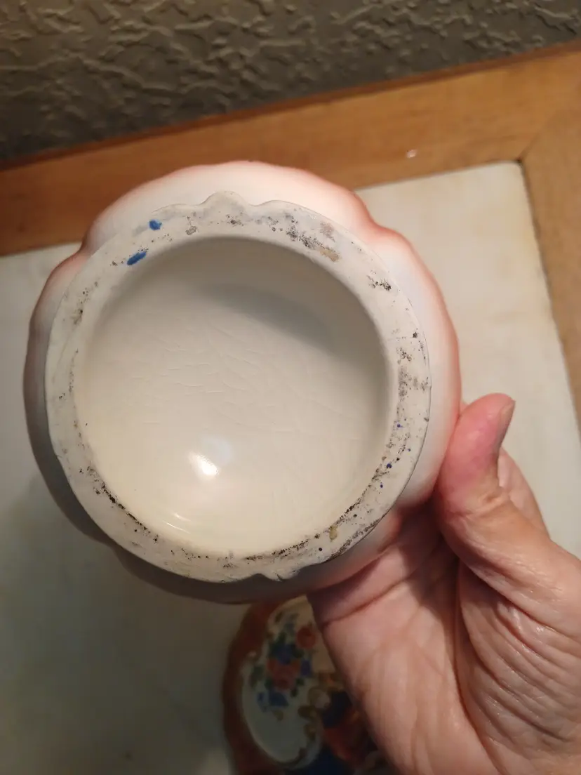Color/Design: Pink and white base with hand-painted floral decorations in blue, pink, and green