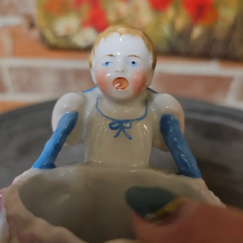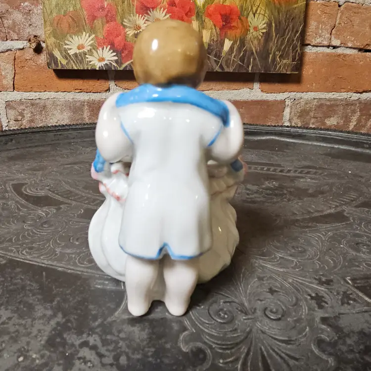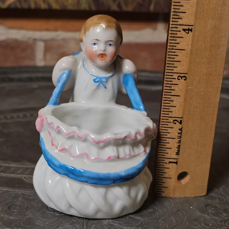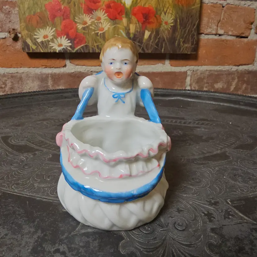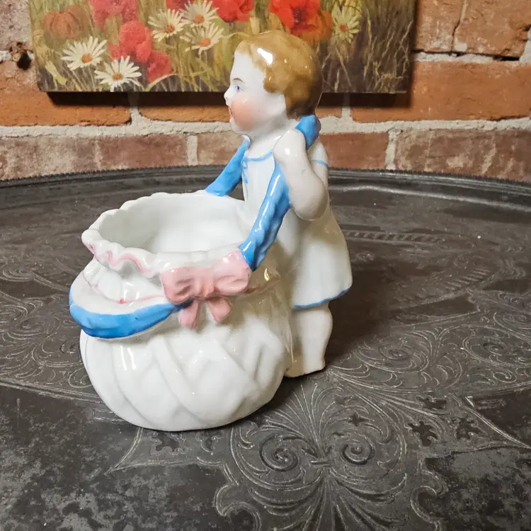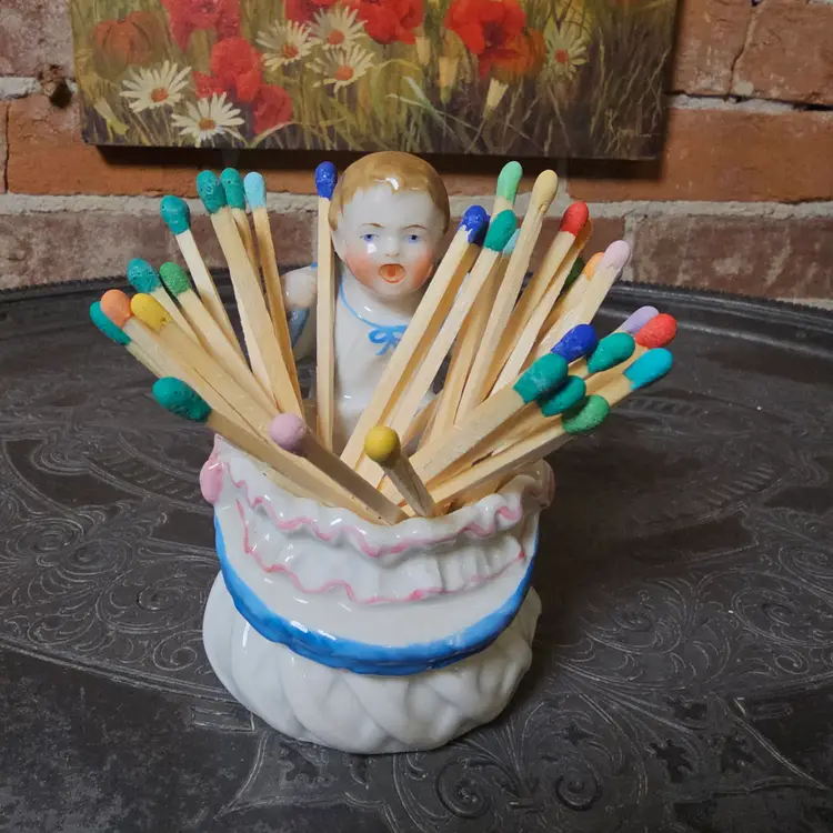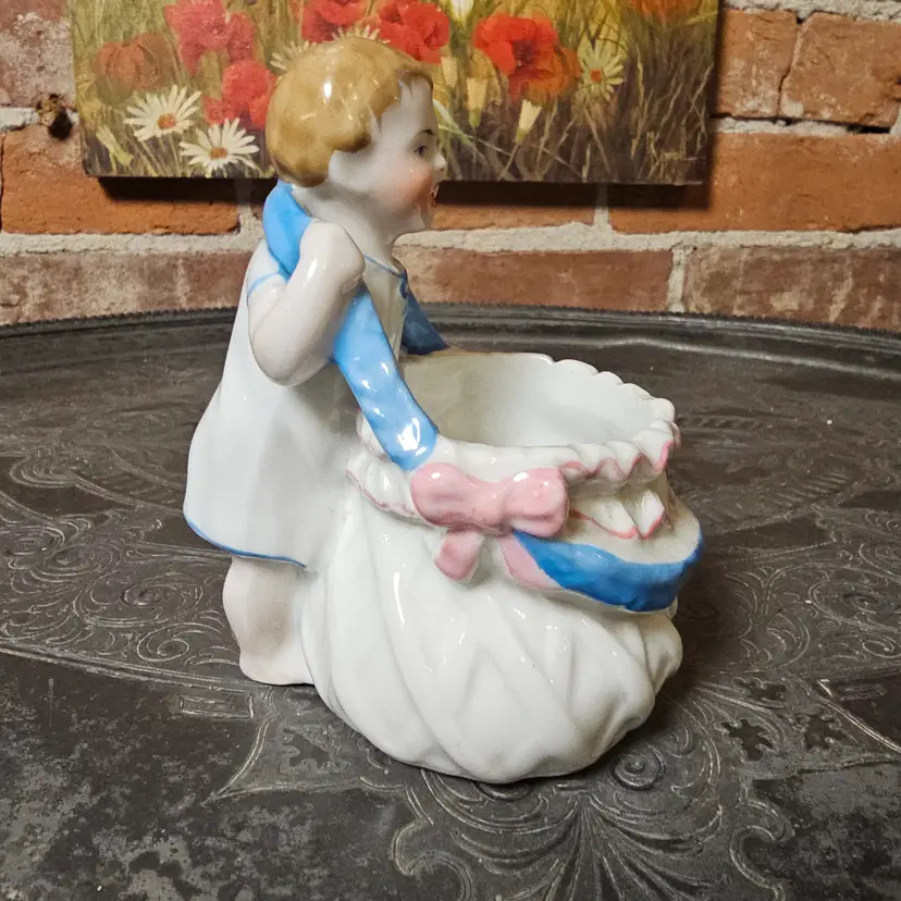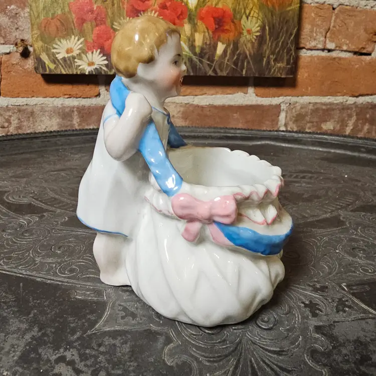 Charming vintage porcelain match holder and striker featuring a figural child holding a ruffled basket. The bottom has a striker strip, and the basket can hold matches or small trinkets. Includes a set of colorful vintage-style matches for display.