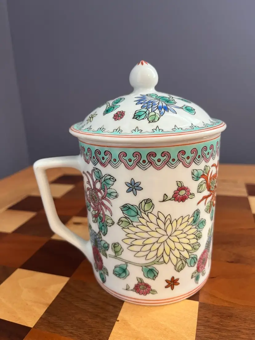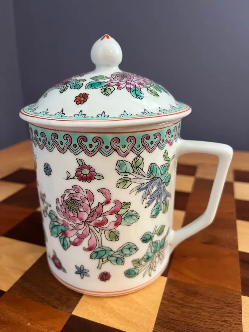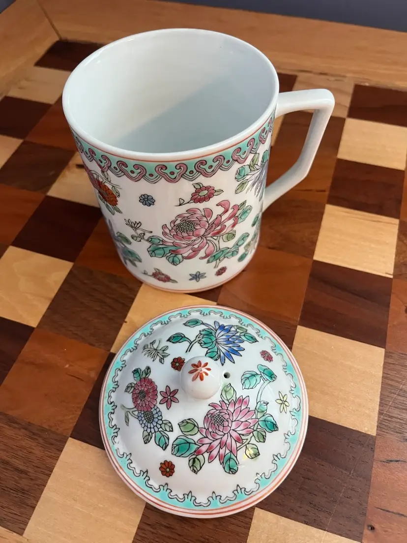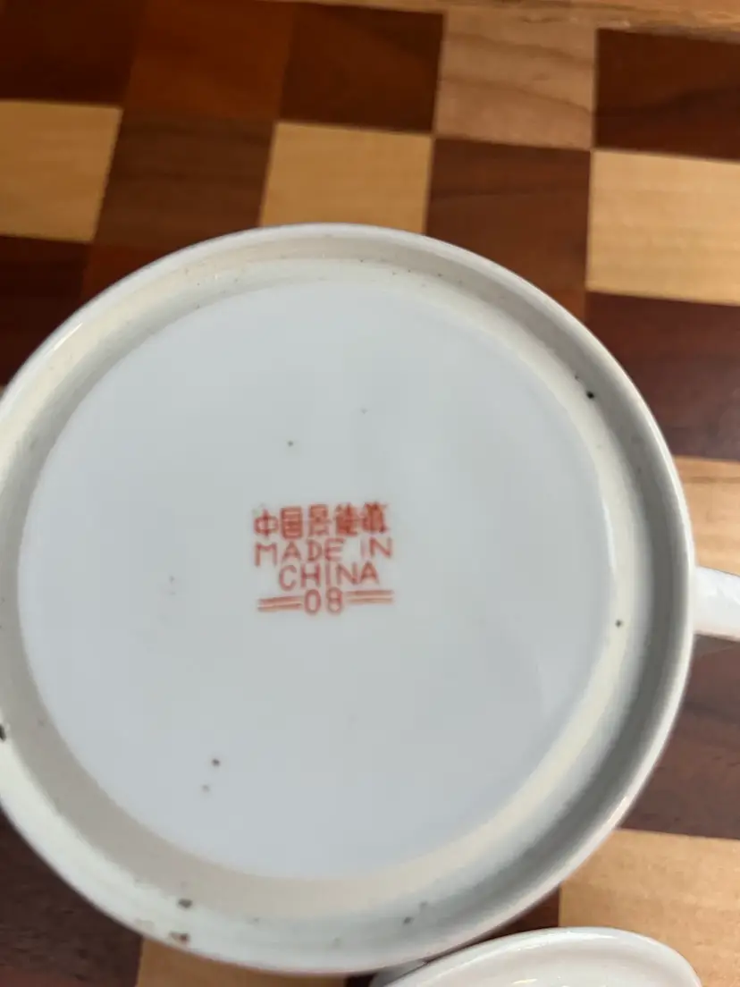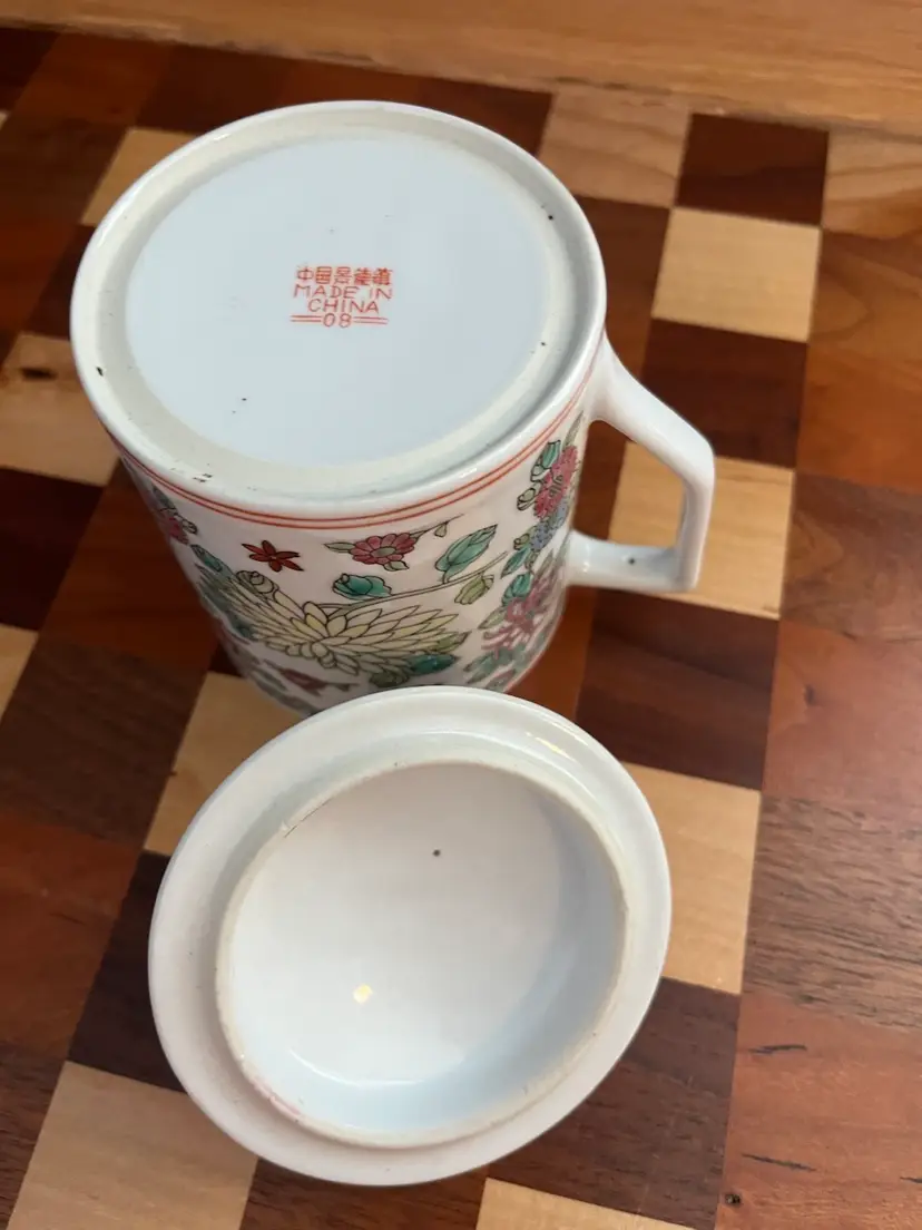 Vintage porcelain mug with lid stamped made in China 08 on bottom.