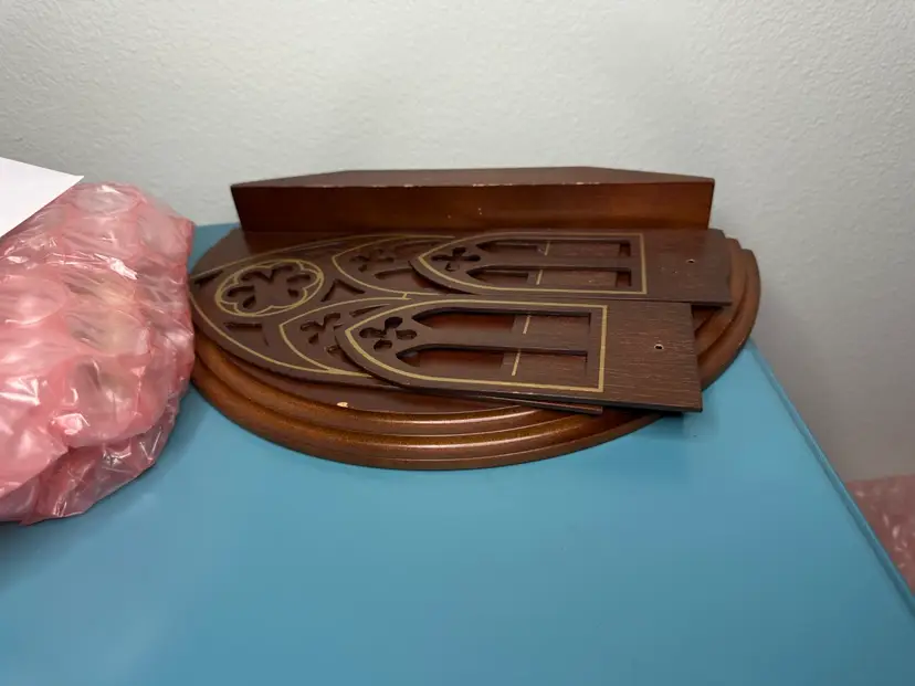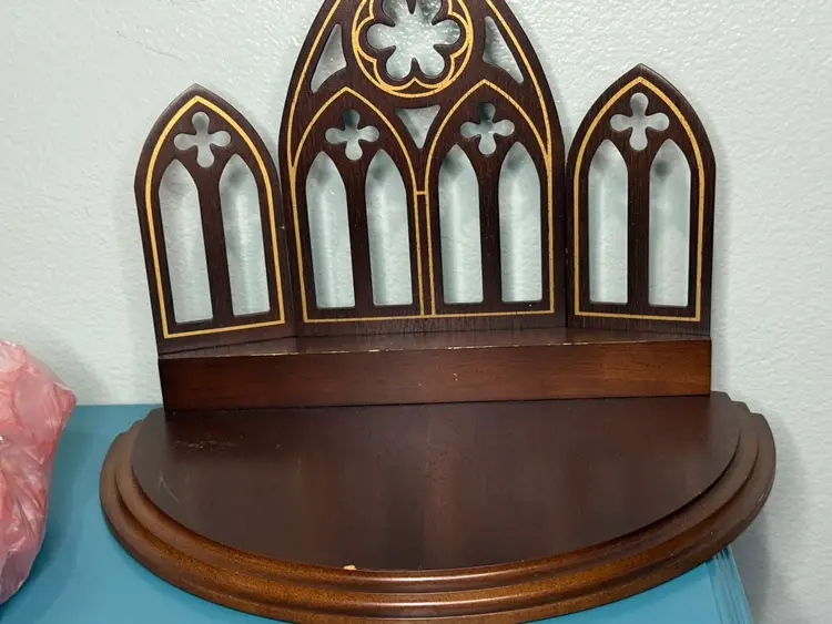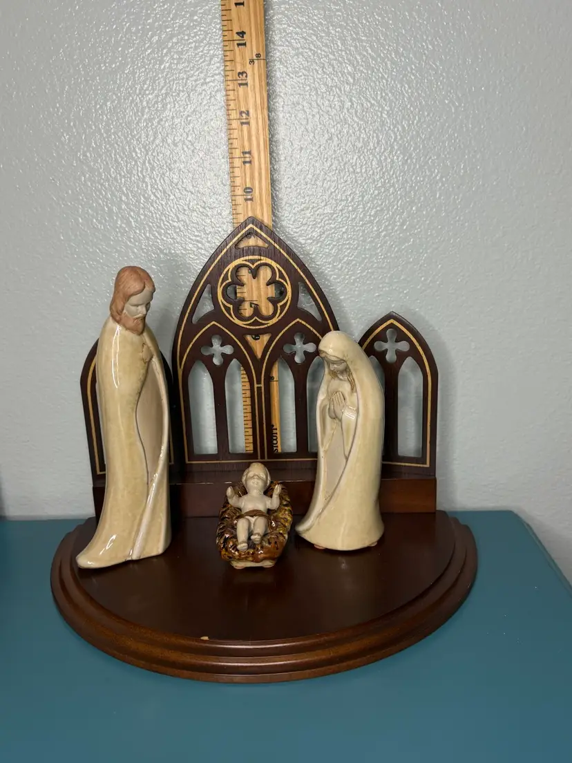 The set features a unique and eye-catching gothic-style wooden arch backdrop with intricate cutouts, adding a touch of classic architectural charm to your holiday decor.