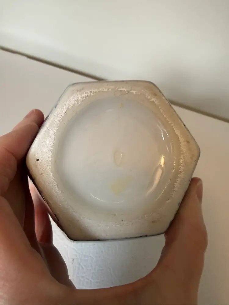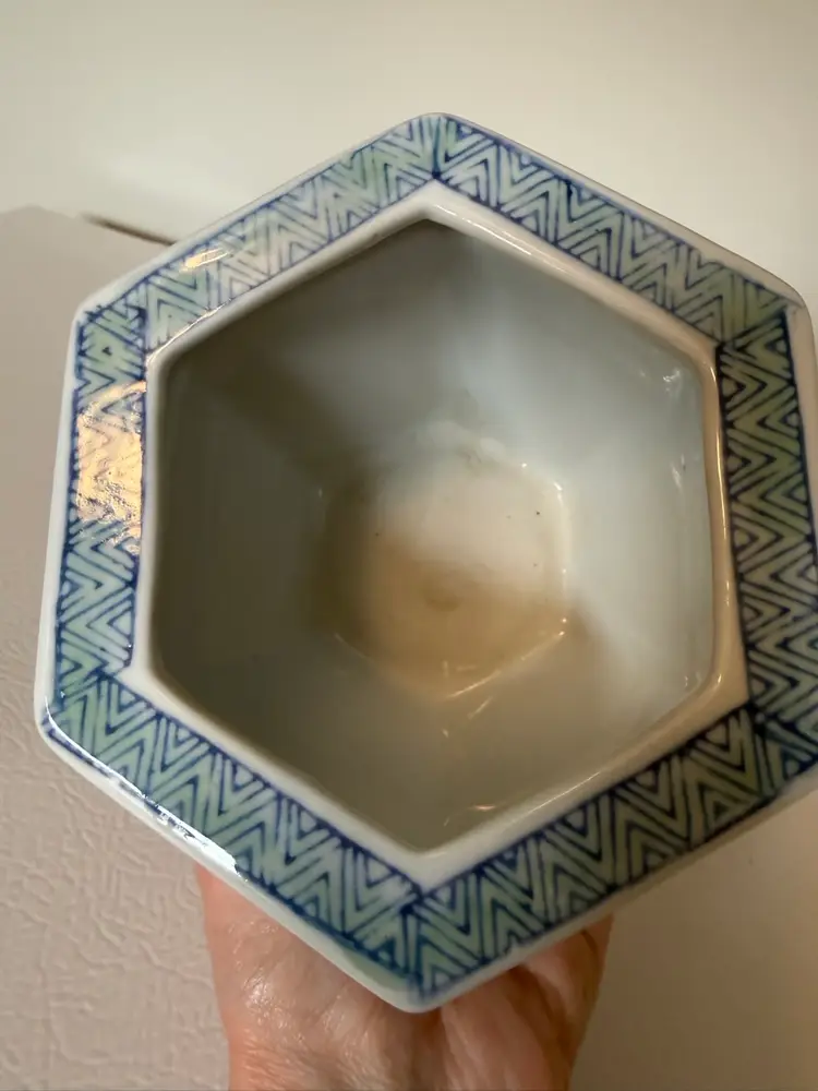 This item is a Chinese porcelain hexagonal planter featuring a hand-painted blue, green, and pink floral design.