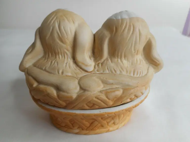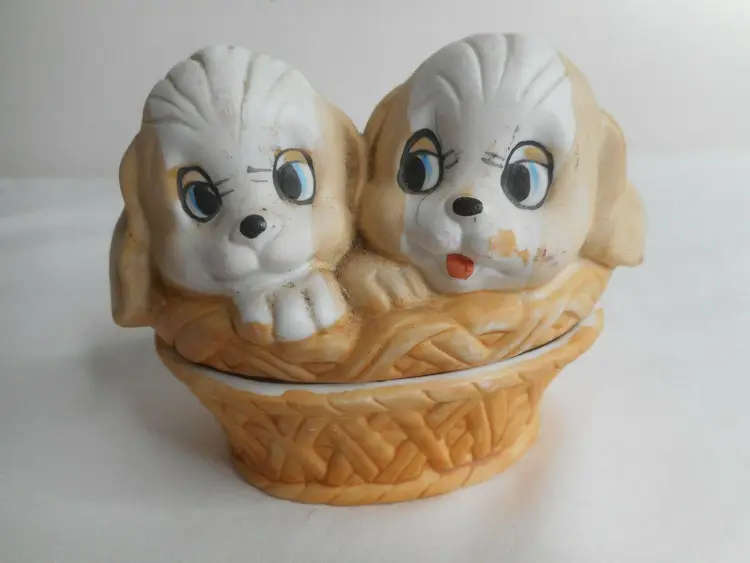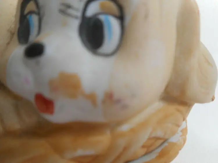 Has a bit of pink color on puppies heads, maybe pen?, discoloration and buildup in the crevices and crannies, inside also needs cleaned. some of these may or may not be permanent. Still a super cute piece.
