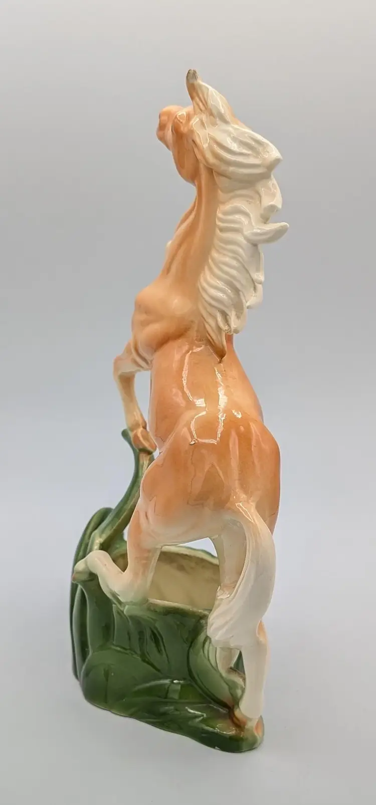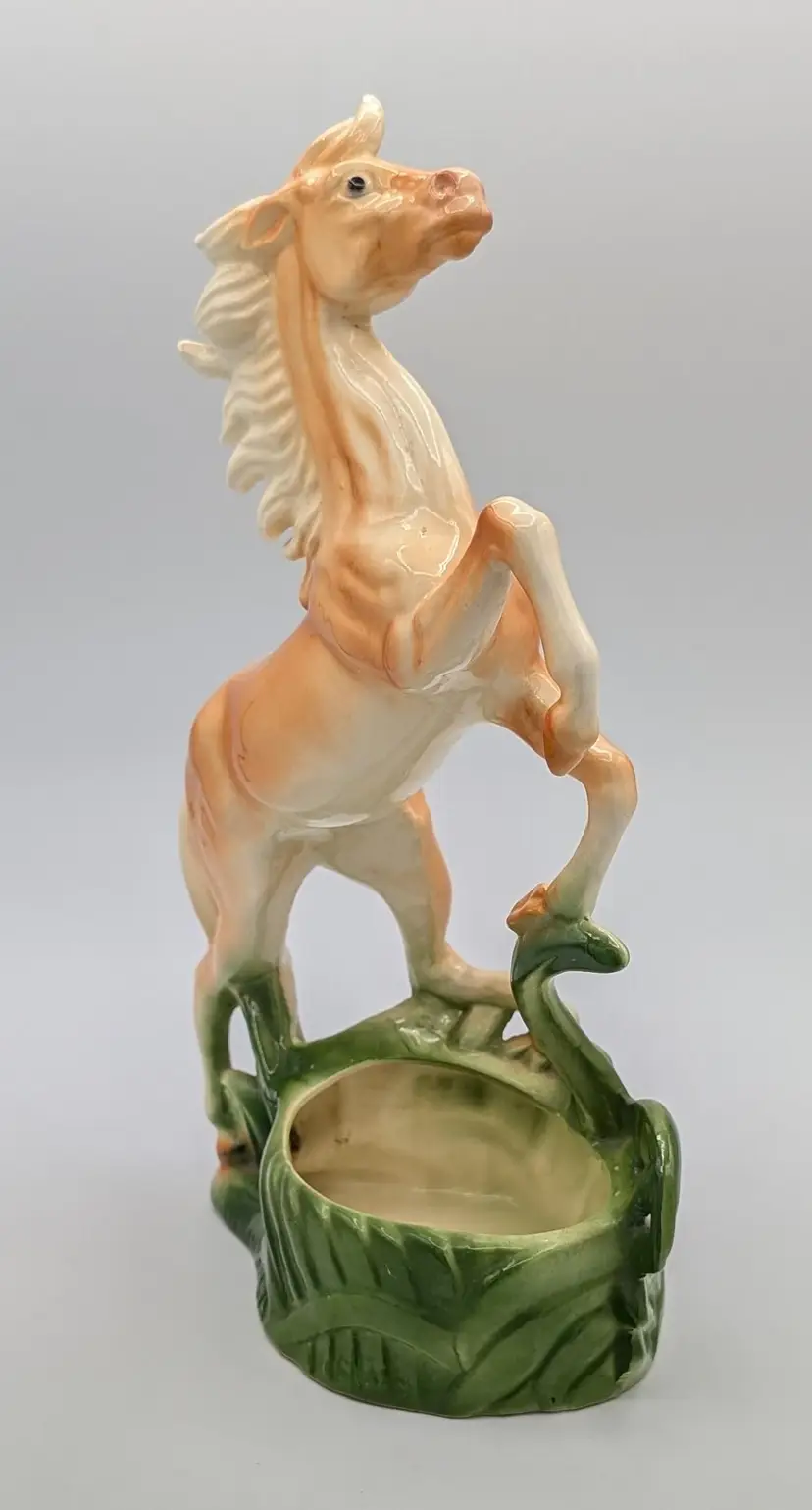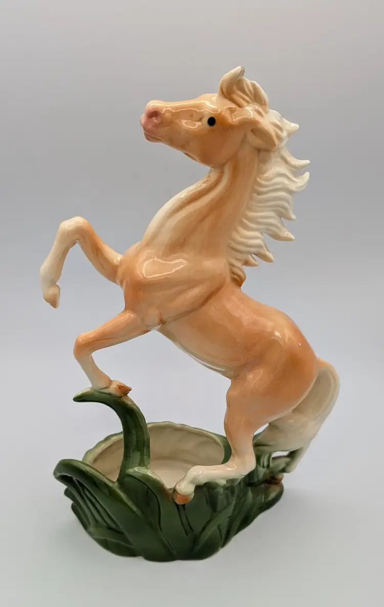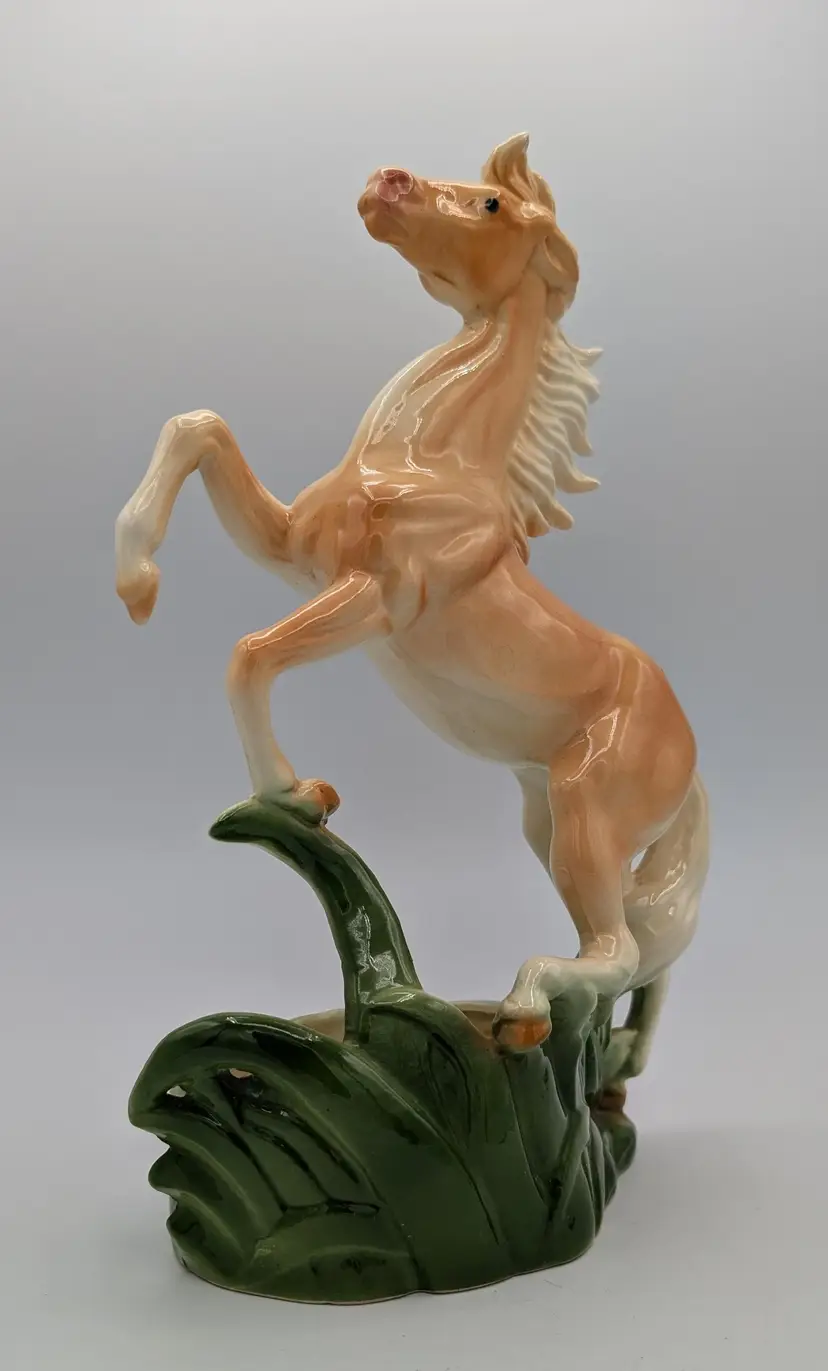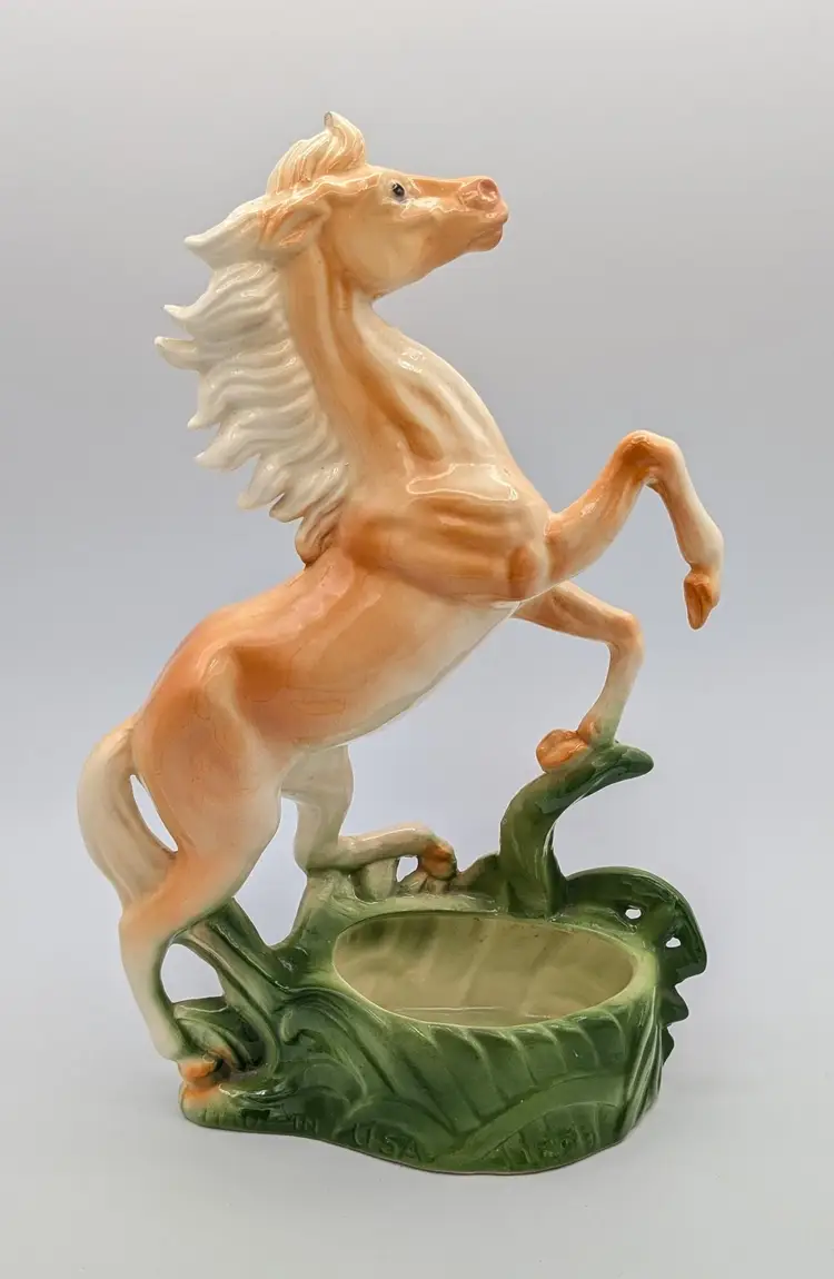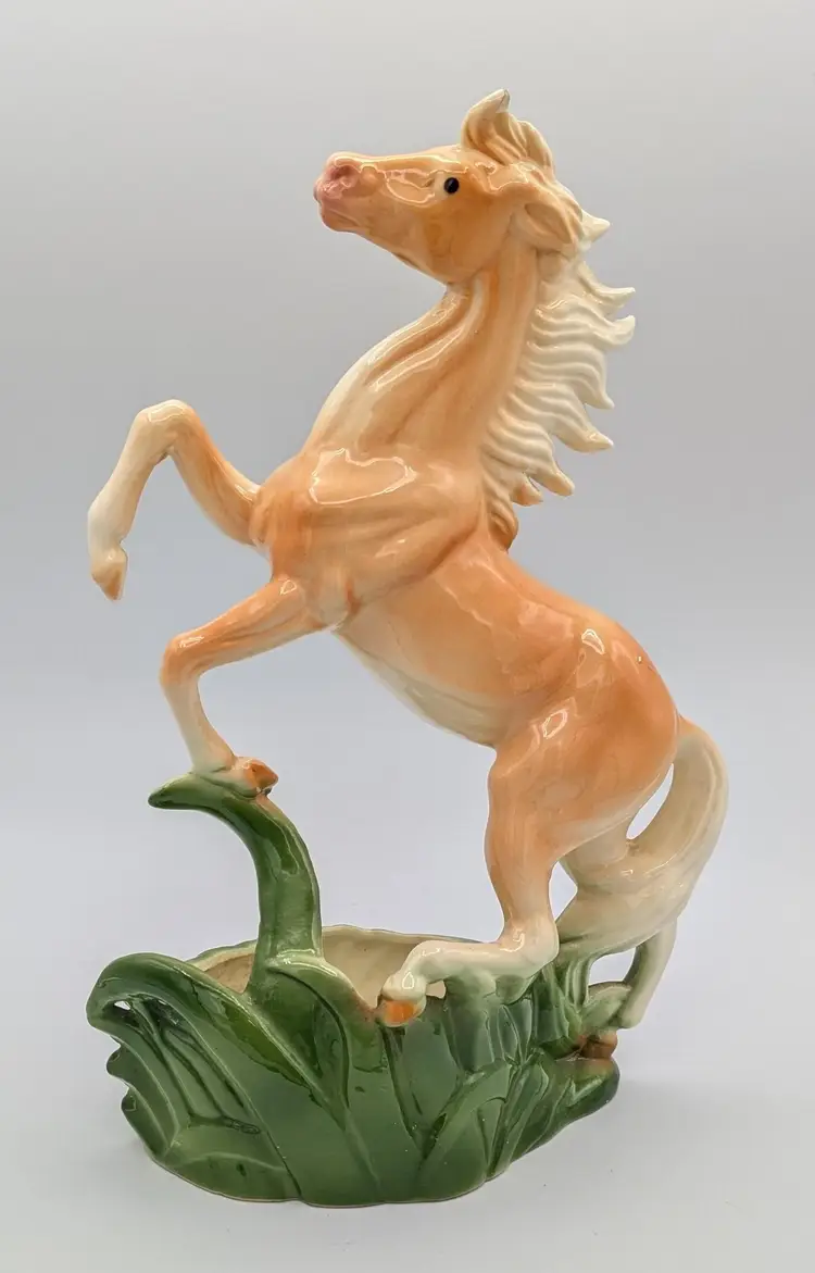 Fantastic country and western or horse lover piece. This wild horse rearing up in the wind is stunning!!! Use as a figurine, planter, vase or convert to a TV lamp. Excellent Used Condition. Small chip on top of forelocks but actually blends in enough. One small speck on back. See pictures for details. Measures approx 11" high x 7" wide x 4" deep inside planter.