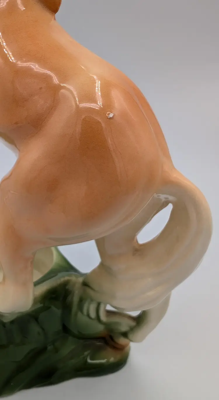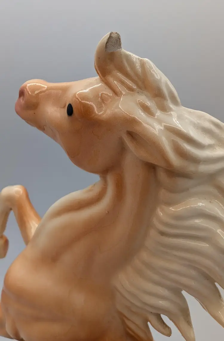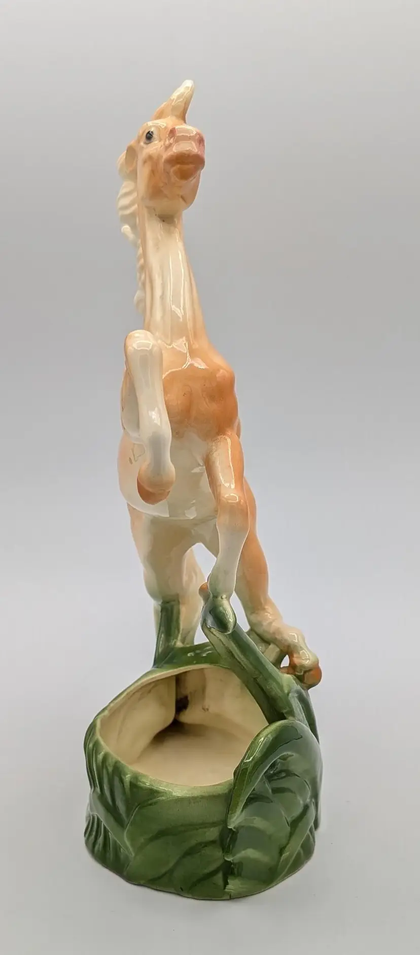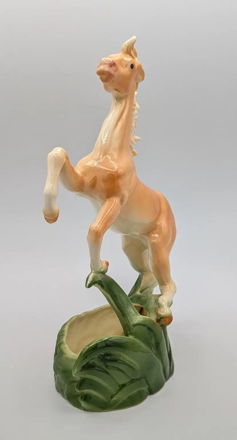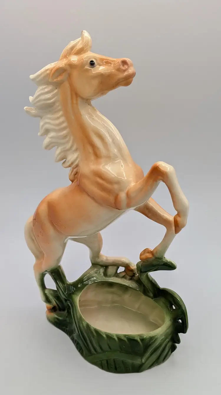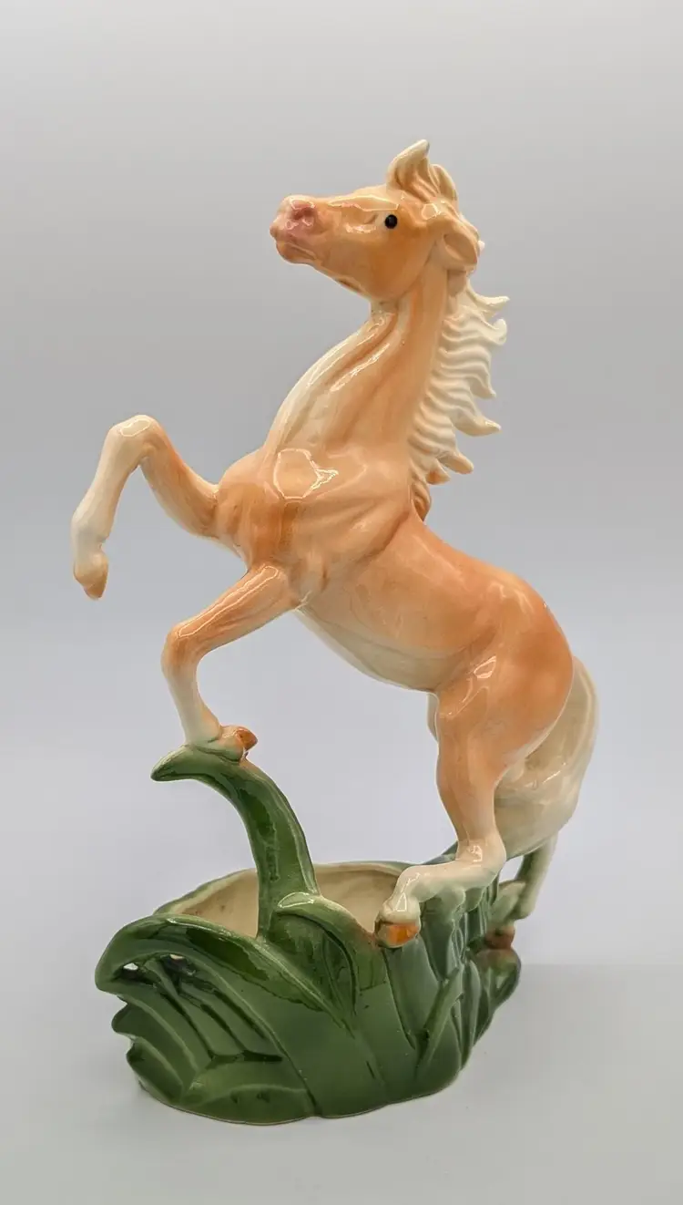 Fantastic country and western or horse lover piece. This wild horse rearing up in the wind is stunning!!! Use as a figurine, planter, vase or convert to a TV lamp. Excellent Used Condition. Small chip on top of forelocks but actually blends in enough. One small speck on back. See pictures for details. Measures approx 11" high x 7" wide x 4" deep inside planter.