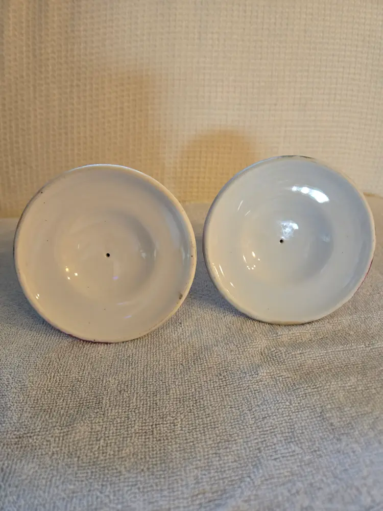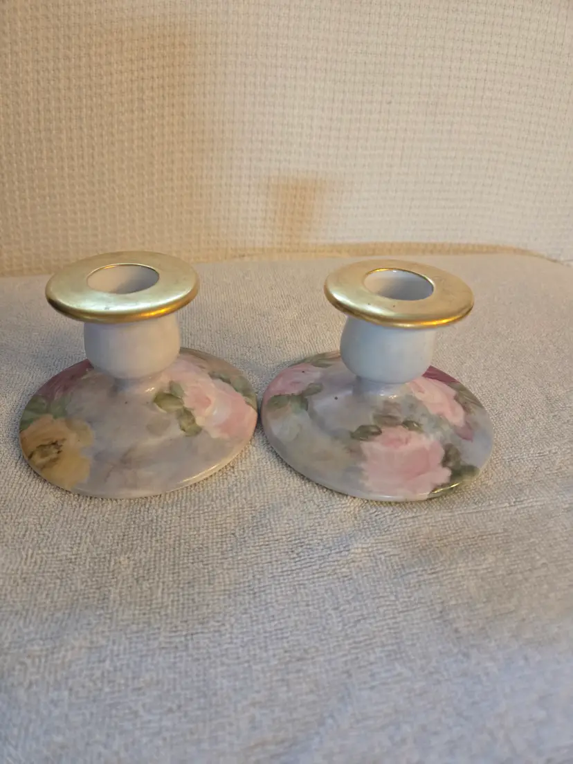 Set of 2 hand-painted candle holders in a light pink and deep burgundy rose flower with green foliage. Finished with a gold-gilded rim around the candle cup. They are not signed and they have no stickers. They have a couple of light scratches on the gold trim. In beautiful condition. No chips, cracks, or repairs. Measures 4" across the top, 2 1/8" across the top and are 3" tall.