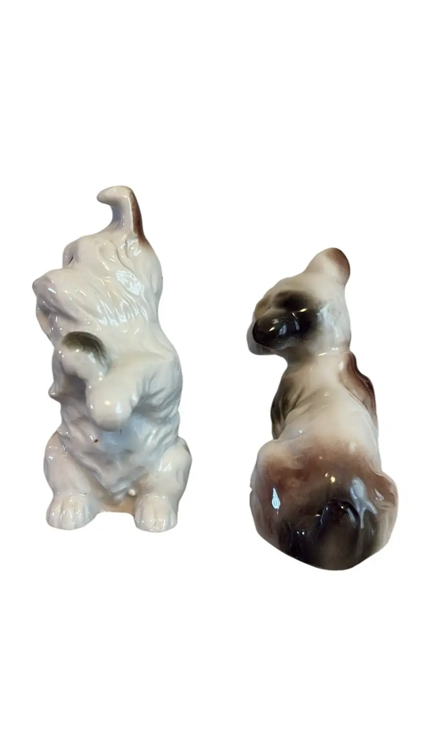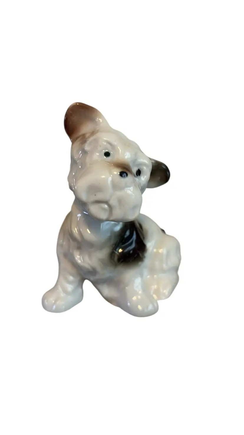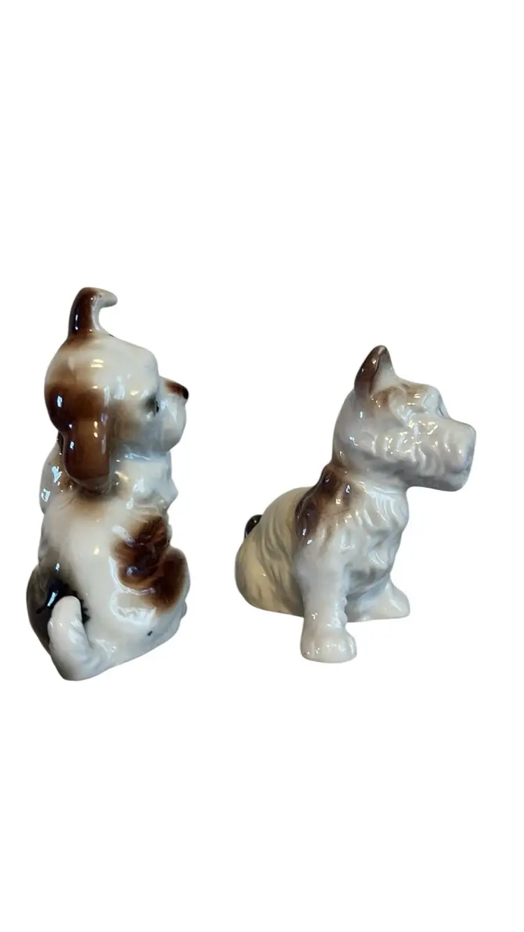 Vintage Porcelain Schnauzer Terrier Dog Figurines Brown, Black and White Set of 2 Bottom Stamped Japan Standing Figurine measures approximately 4.5”H x 3”W Sitting Figurine measures approximately 3.5”H x 3.5”W Excellent vintage condition no cracks or chips