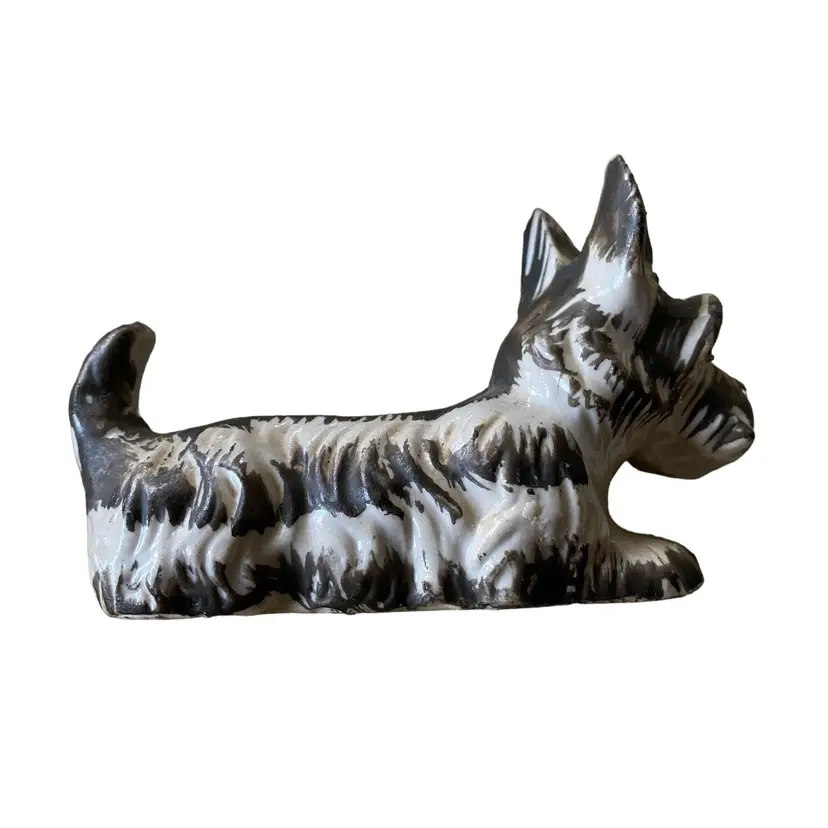 Vintage Porcelain Scottie Dog Figurine, Ceramic Scottish Terrier, Black Terrier Dog Figurine stamped Japan 4.5in long.