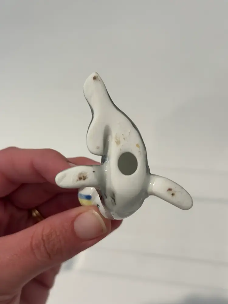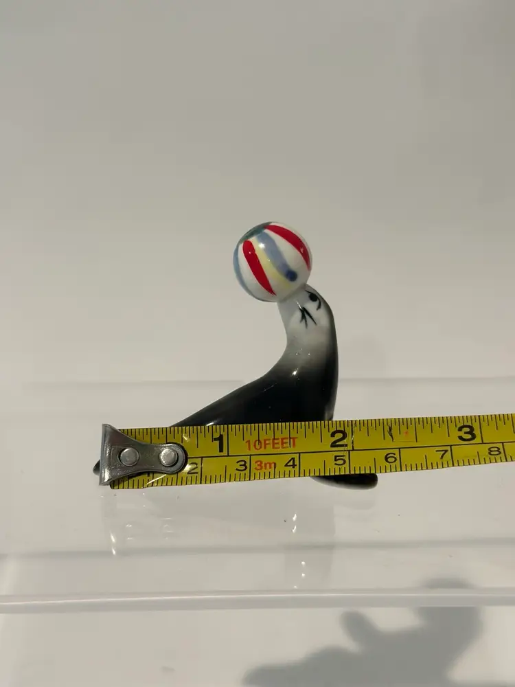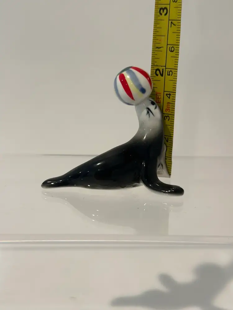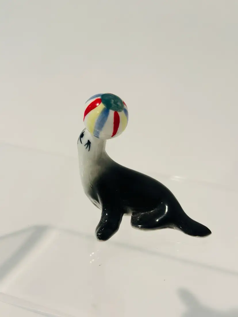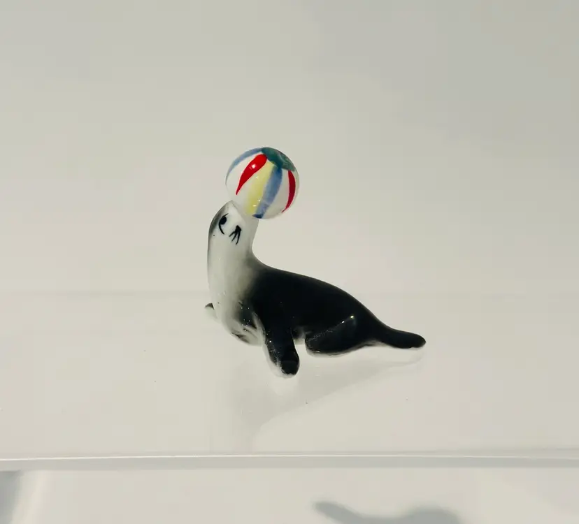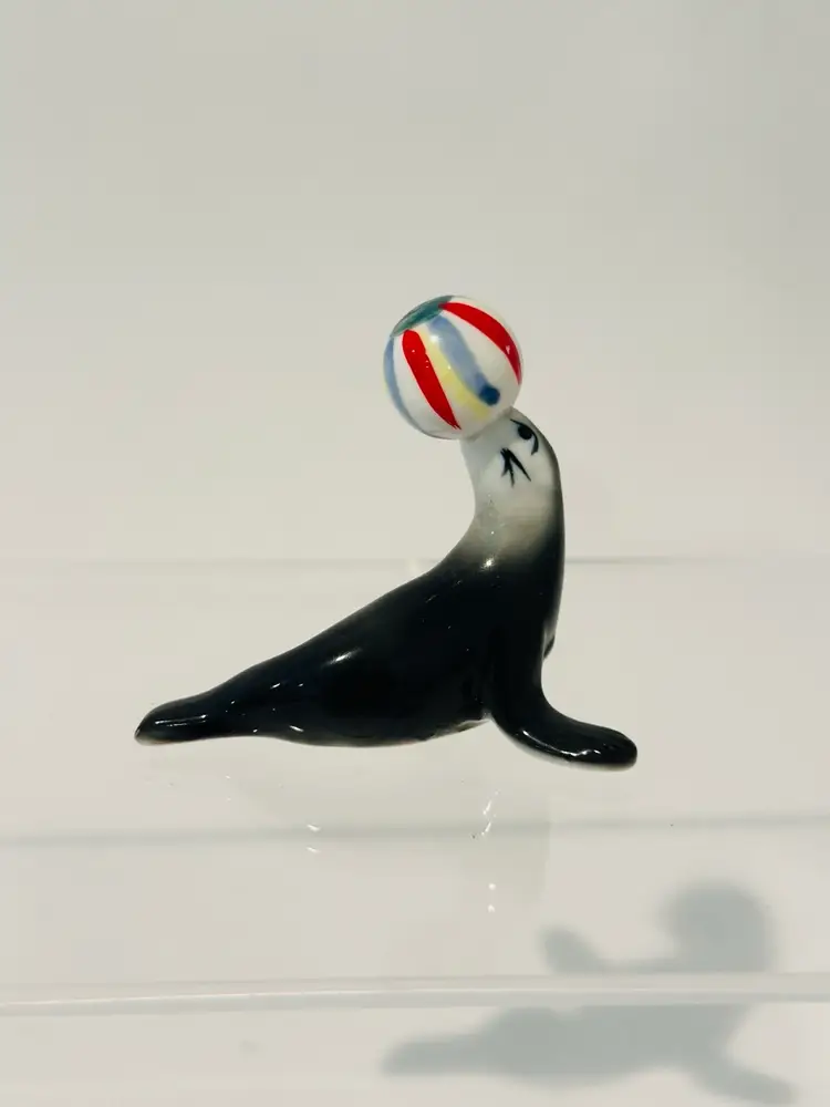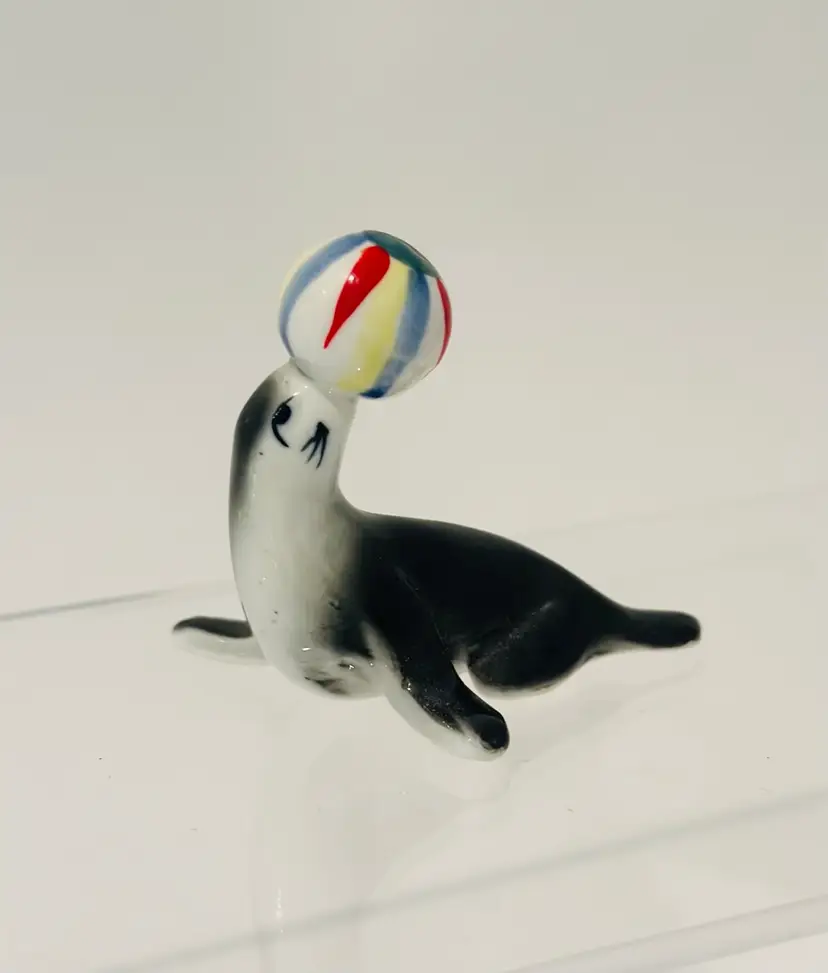 This vintage porcelain figurine depicts a seal balancing a beach ball, with intricate details on a bone china base. The figurine is unmarked, but is believed to be of Japanese origin. It is a charming addition to any collection of animal-themed collectibles.